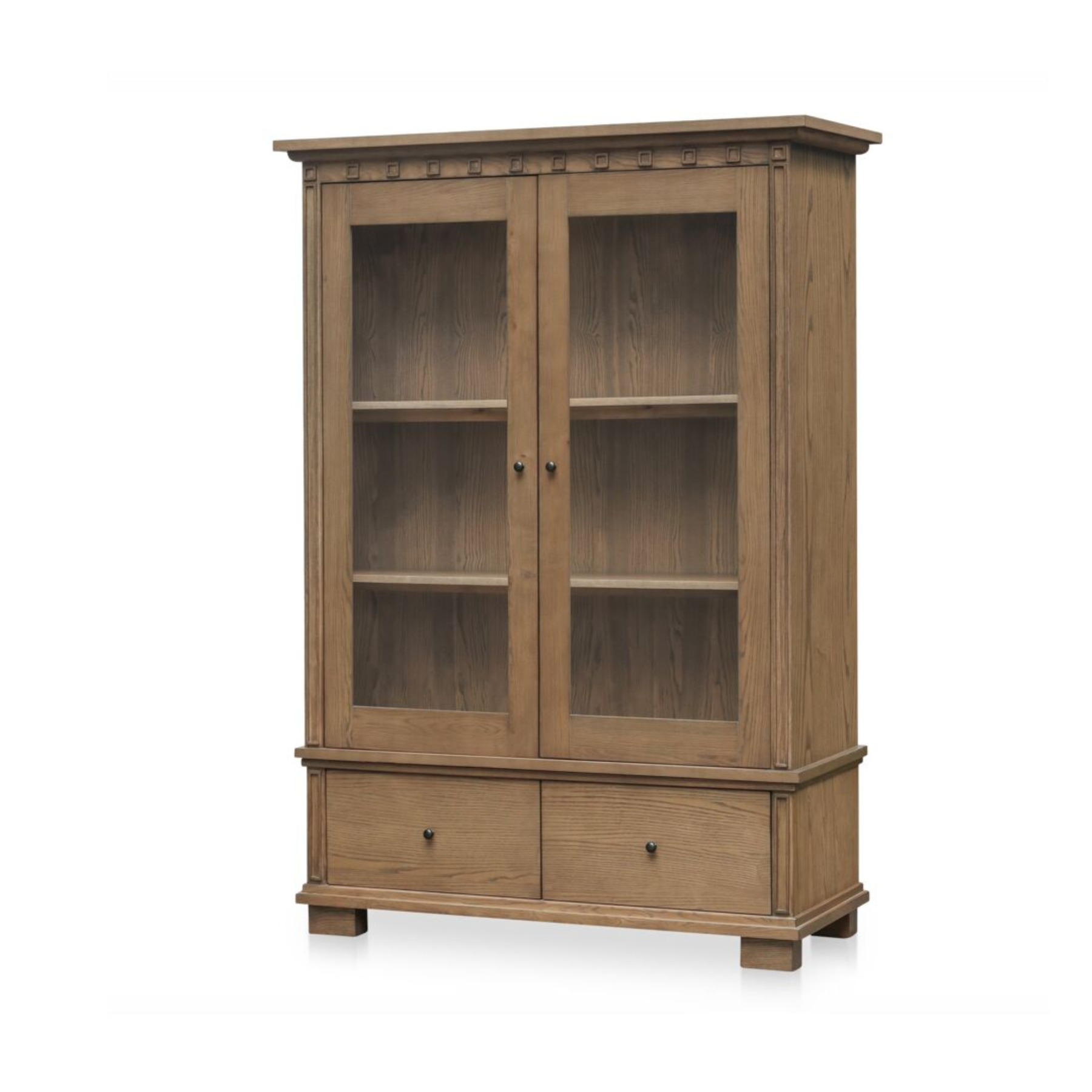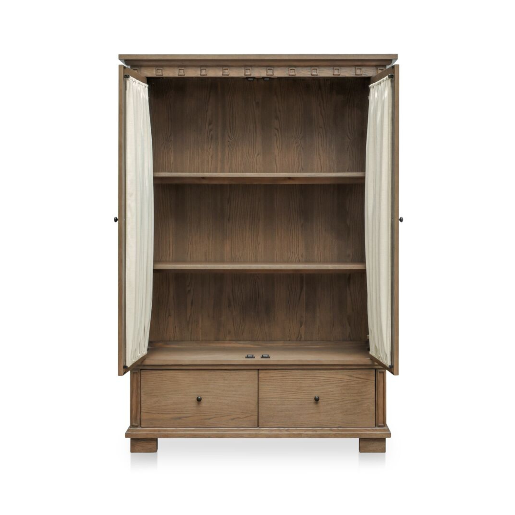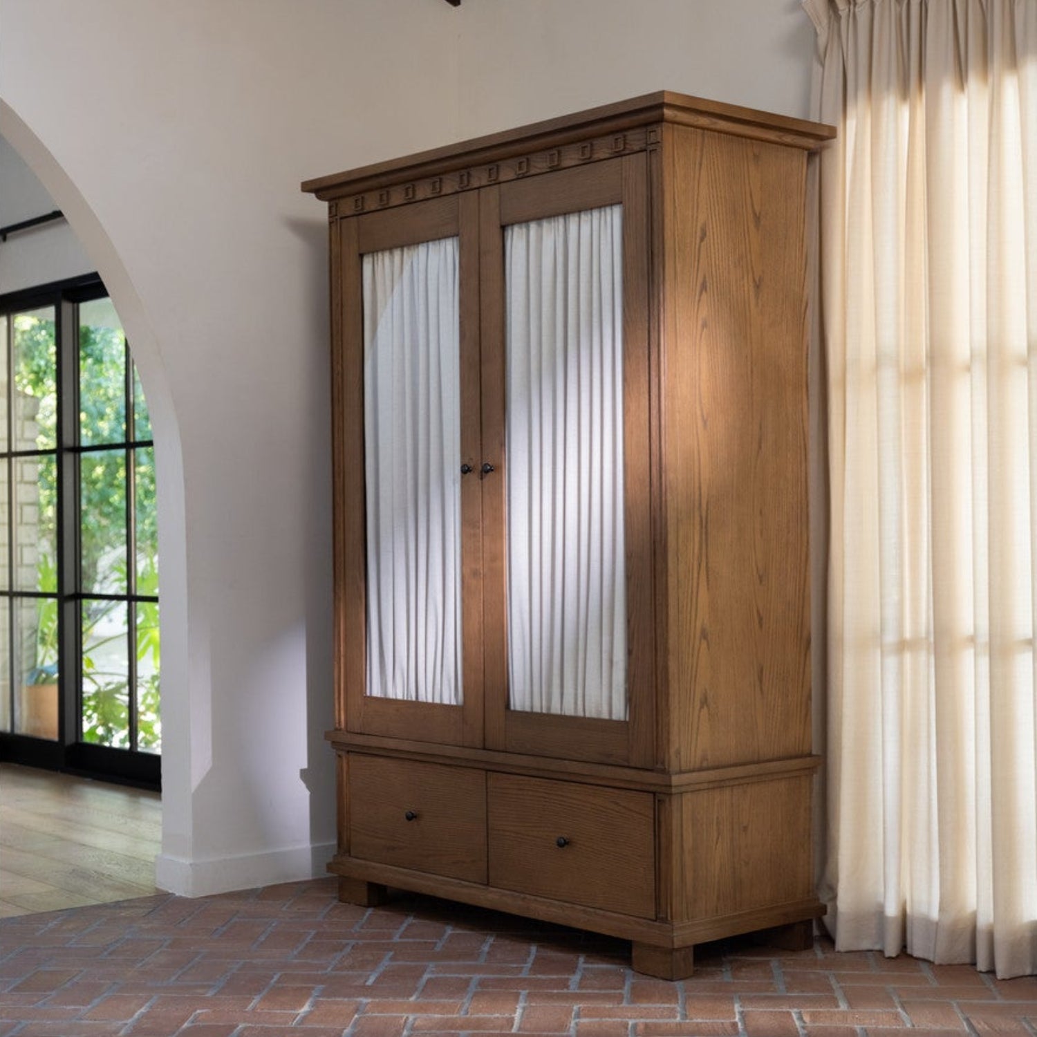 The Lila makes storage feel elevated. Framed in solid ash with glass doors, its tall silhouette pairs traditional molding with a warm brown finish. Inside, removable linen-textured drapery softens the display or can be taken out for a crisper look. Blackened bronze handles open to three shelves above and two deep drawers below—showcase up top, hideaway down low. A timeless piece designed to balance form and function.