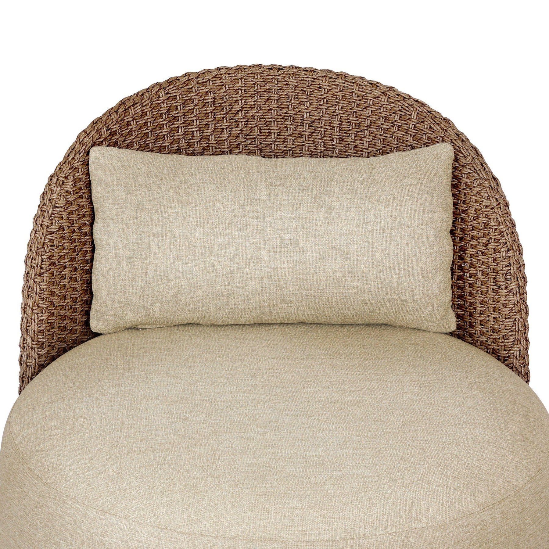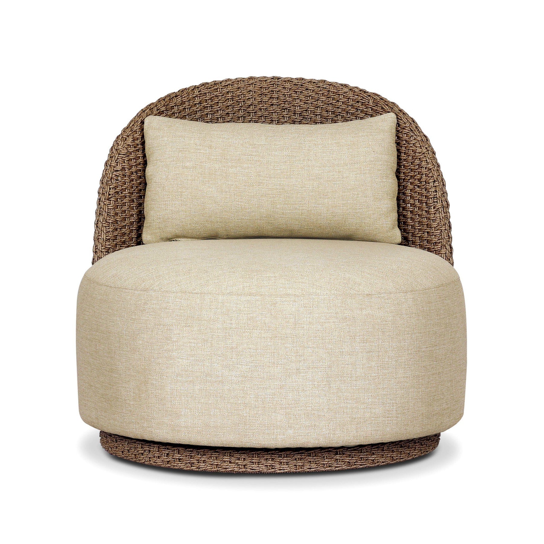 Easy drum-style seating gets a textural upgrade on this outdoor chair. Faux hyacinth weaves into a potato chip-shaped back and wrapped 360-swivel base, finished in an Italian high-performance upholstery seat and loose back cushion. Sustainably made with zero waste, luxurious Italian upholstery places a new and unique spin on indoor/outdoor seating, offering soft, durable fabric that's highly resistant to sun, stains, mold and abrasion. Cover or store indoors during inclement weather and when not in use.