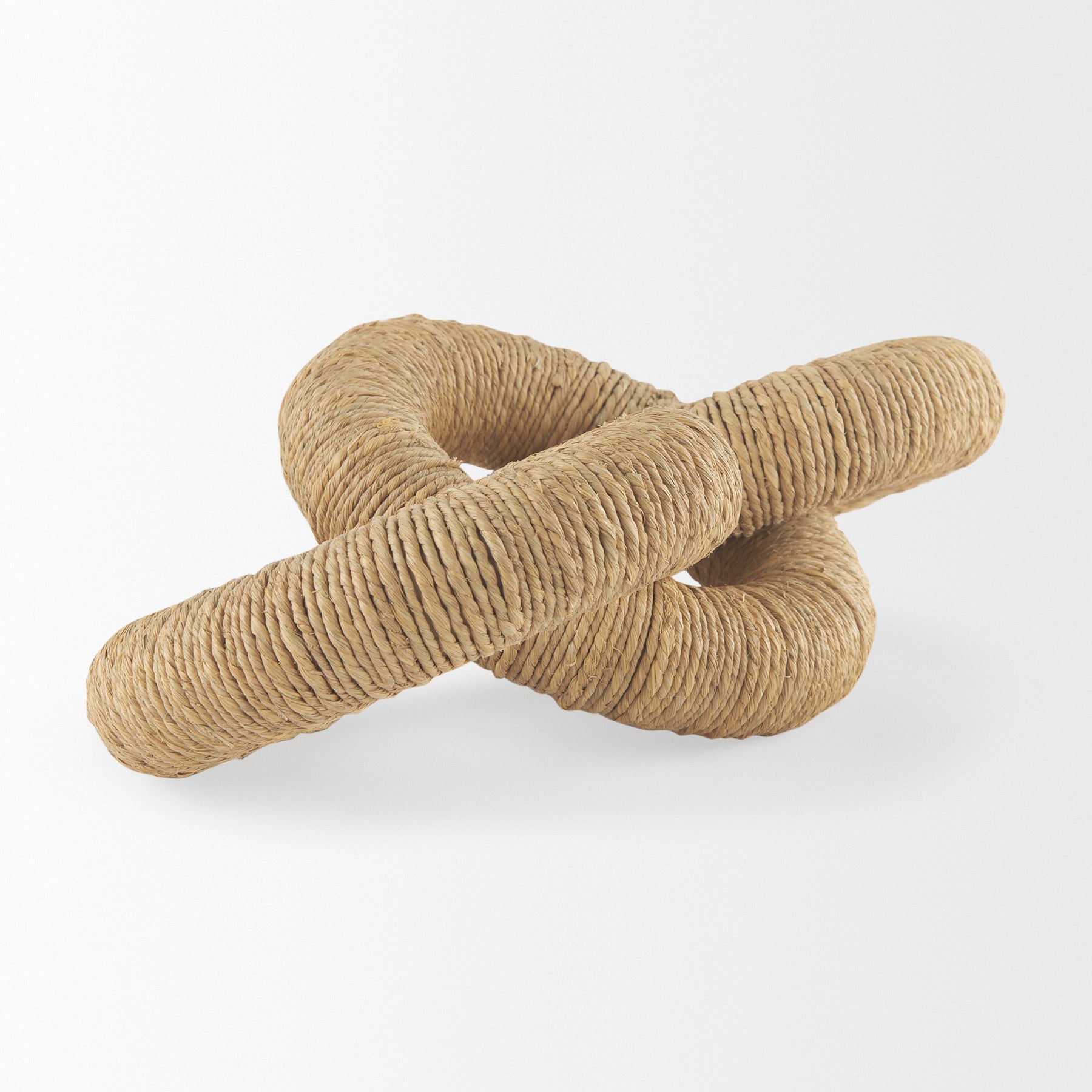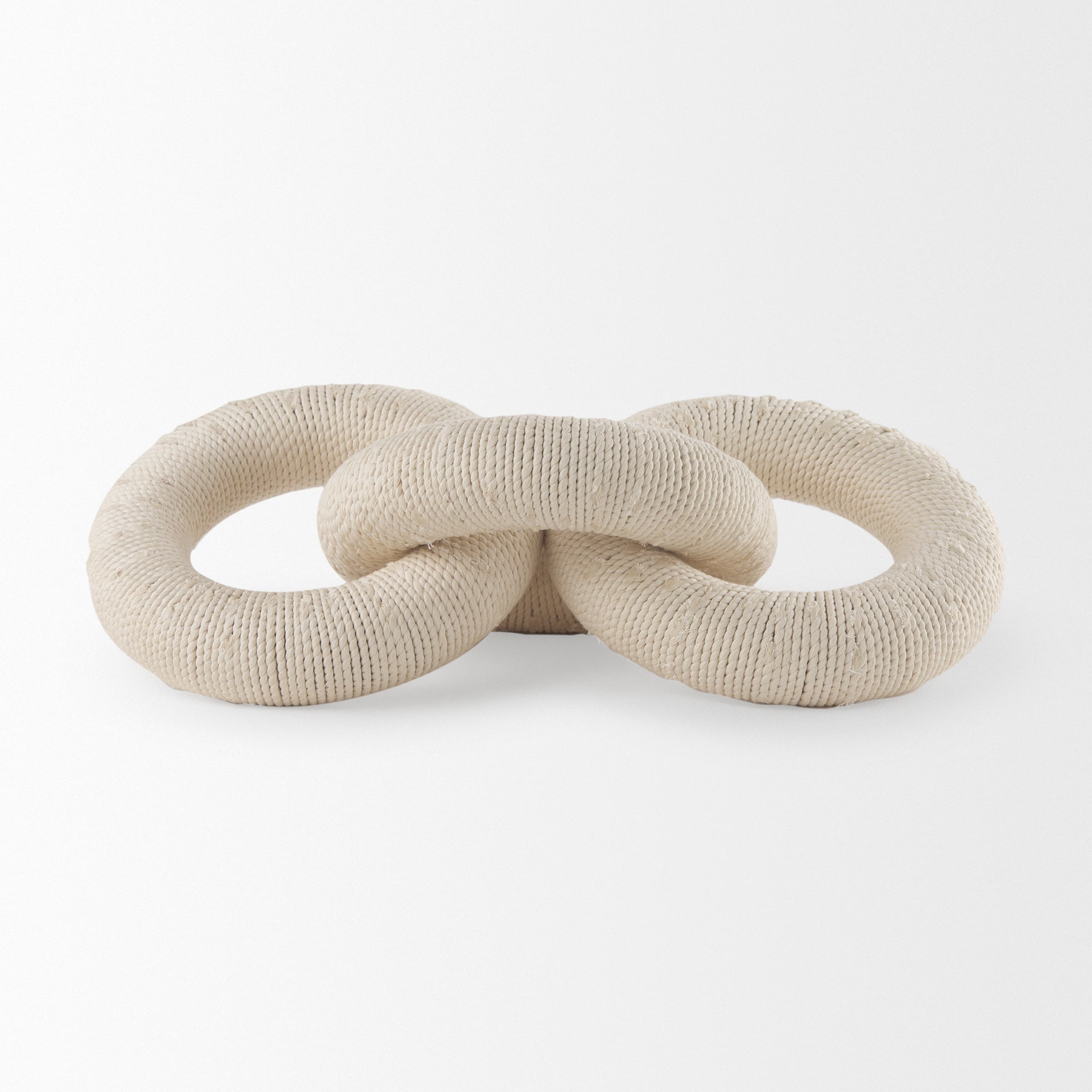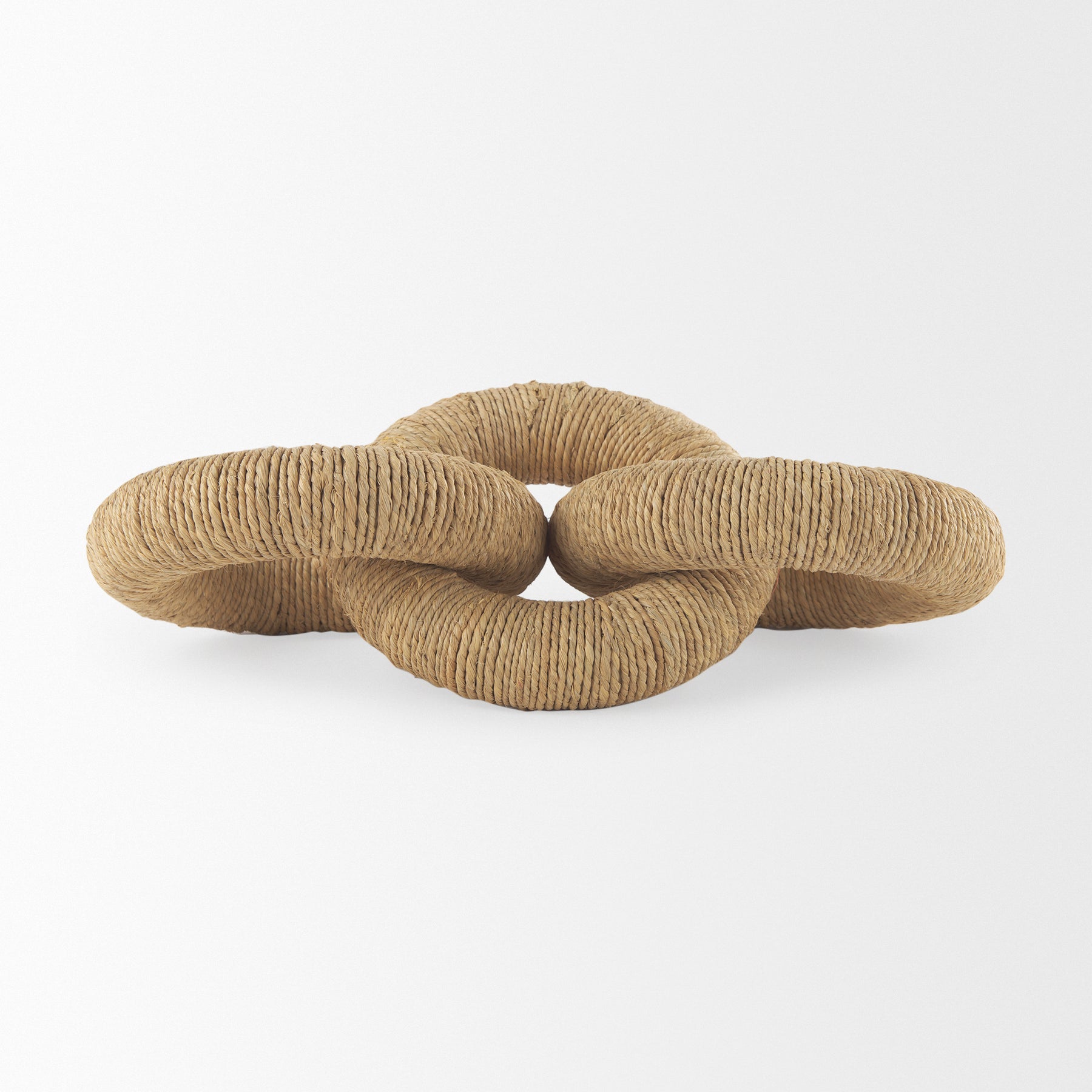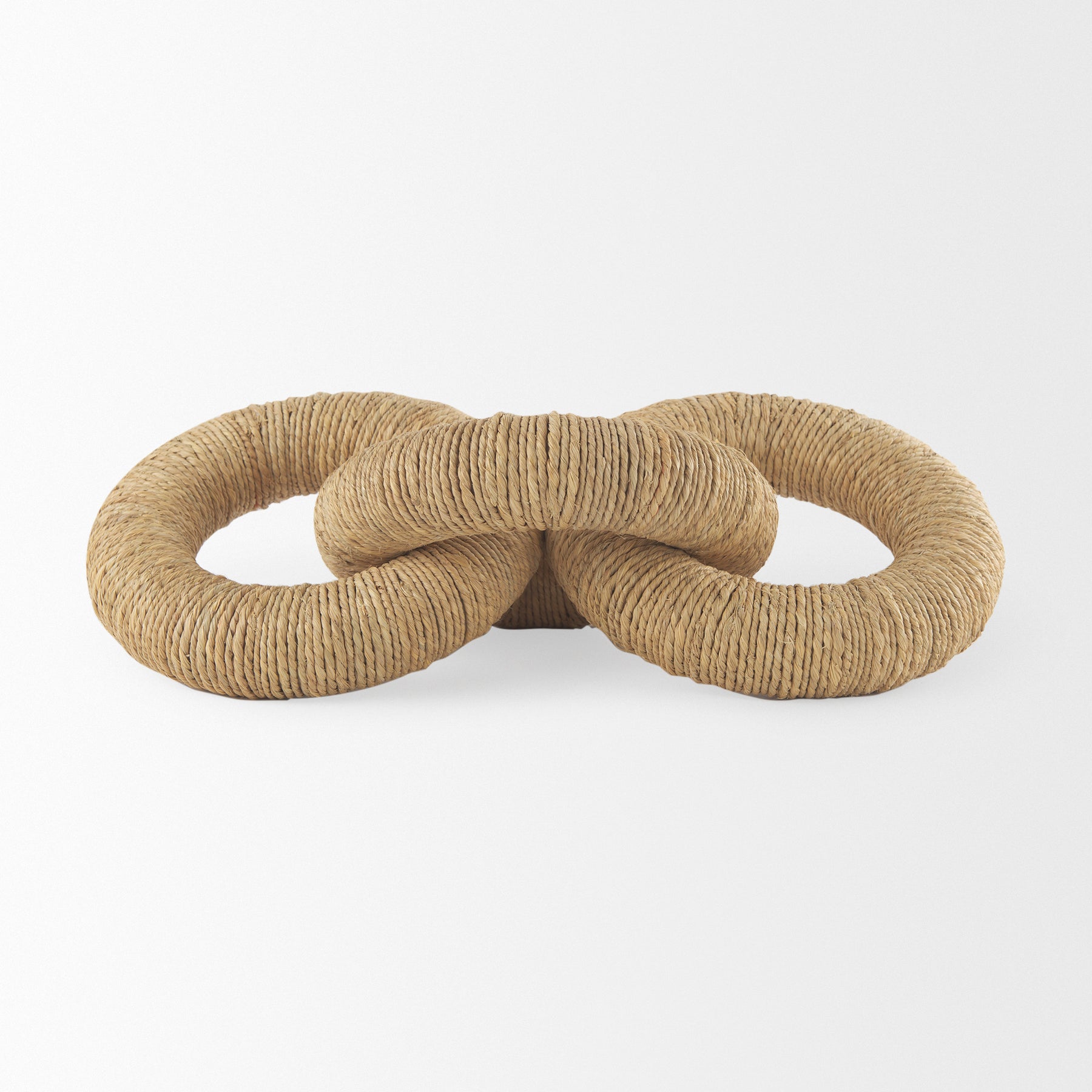 The Aleeza is a decorative chain link object crafted from light brown wood, beautifully wrapped in rustic jute and light cotton rope for a natural, textured look.