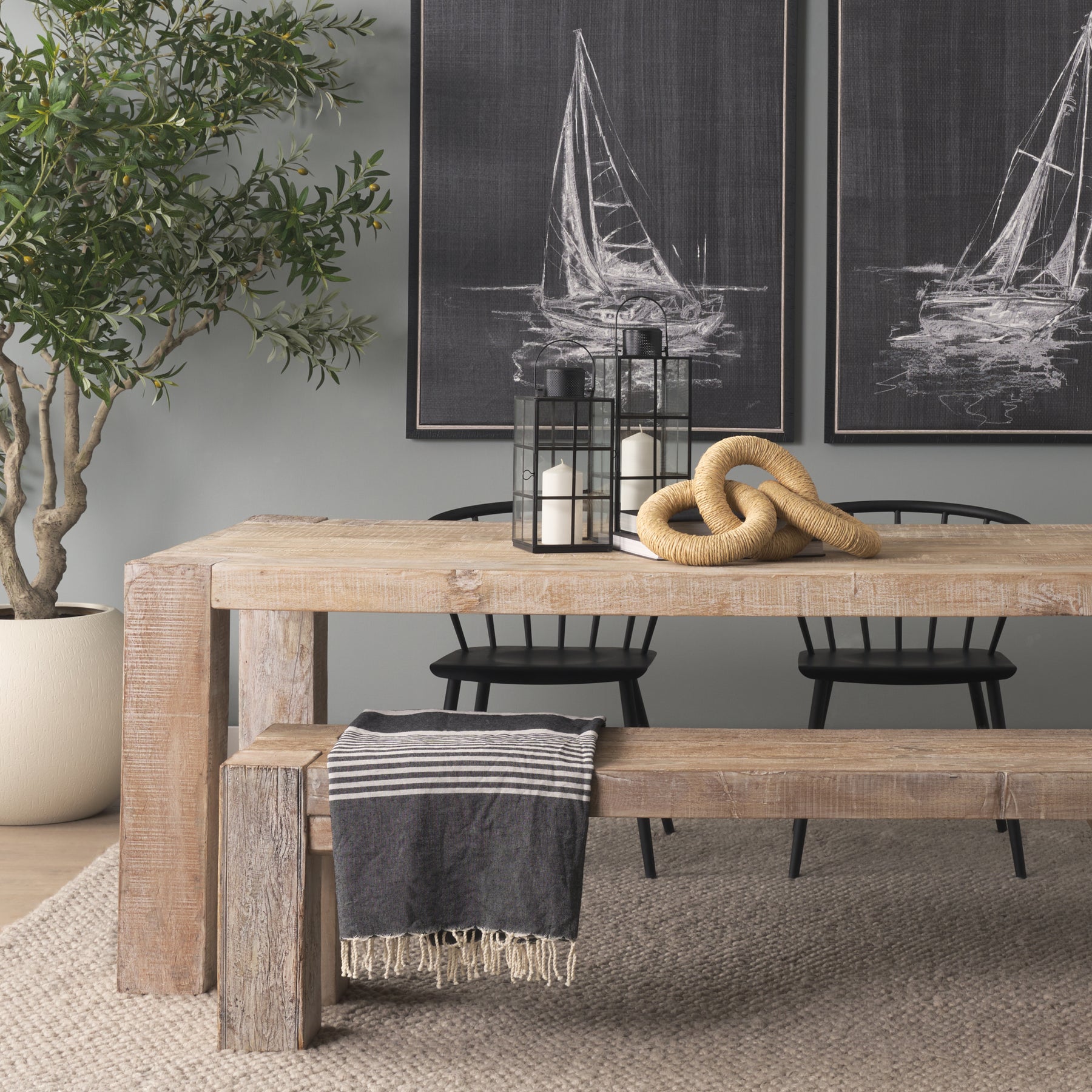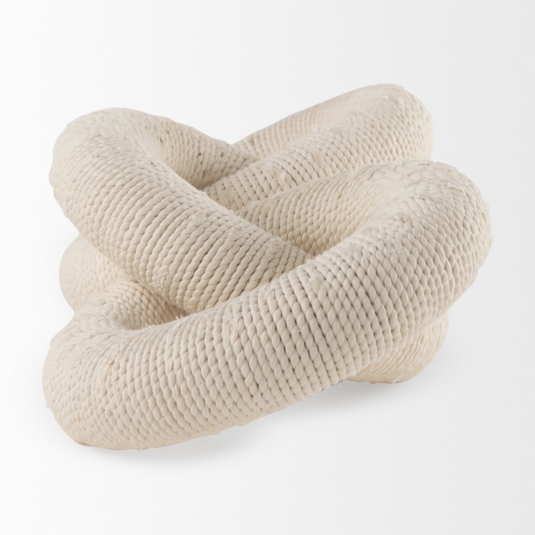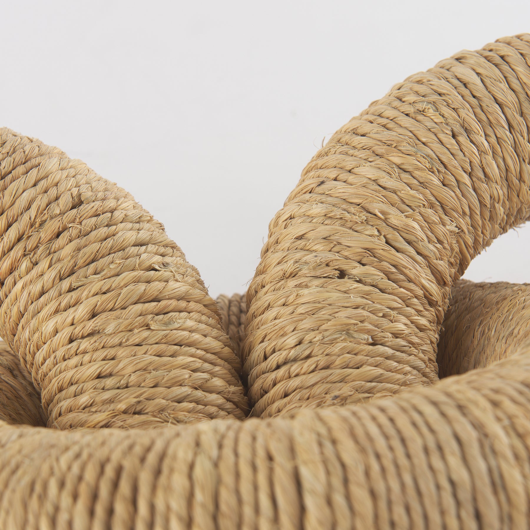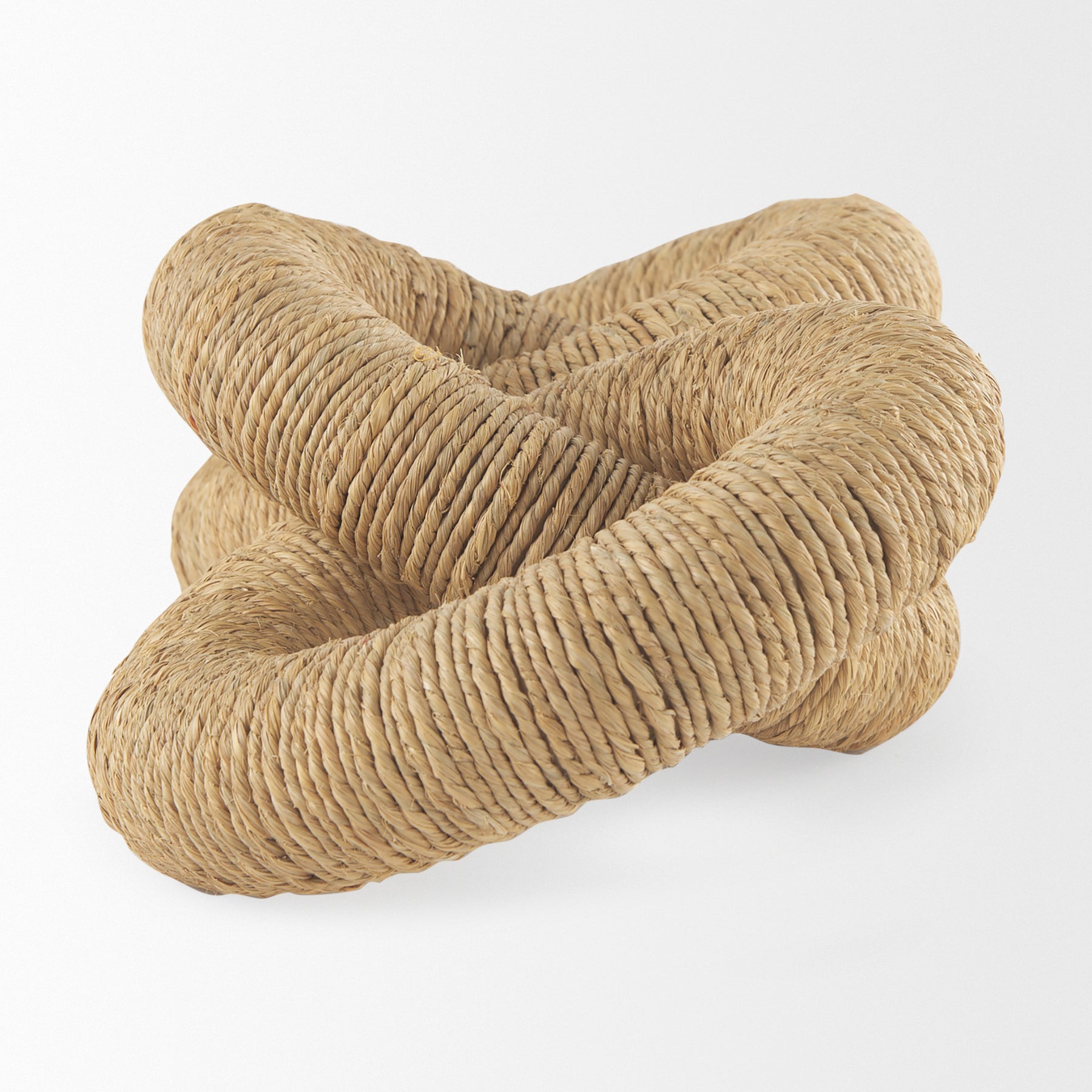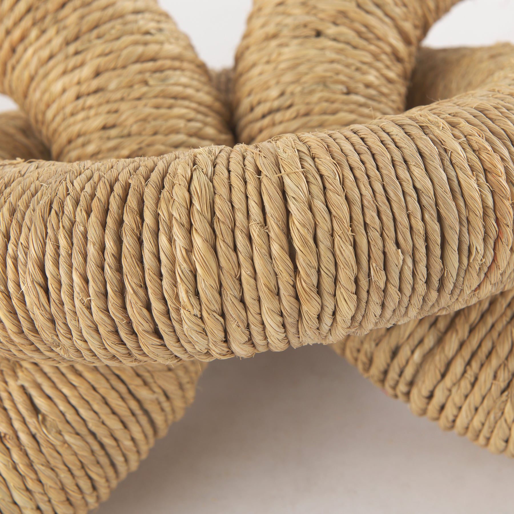 The Aleeza is a decorative chain link object crafted from light brown wood, beautifully wrapped in rustic jute and light cotton rope for a natural, textured look.