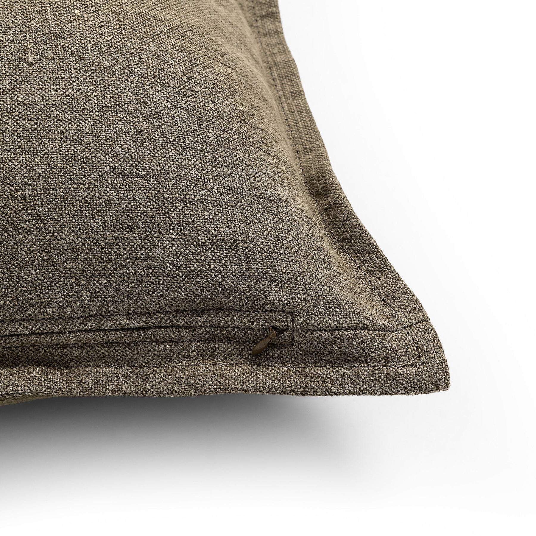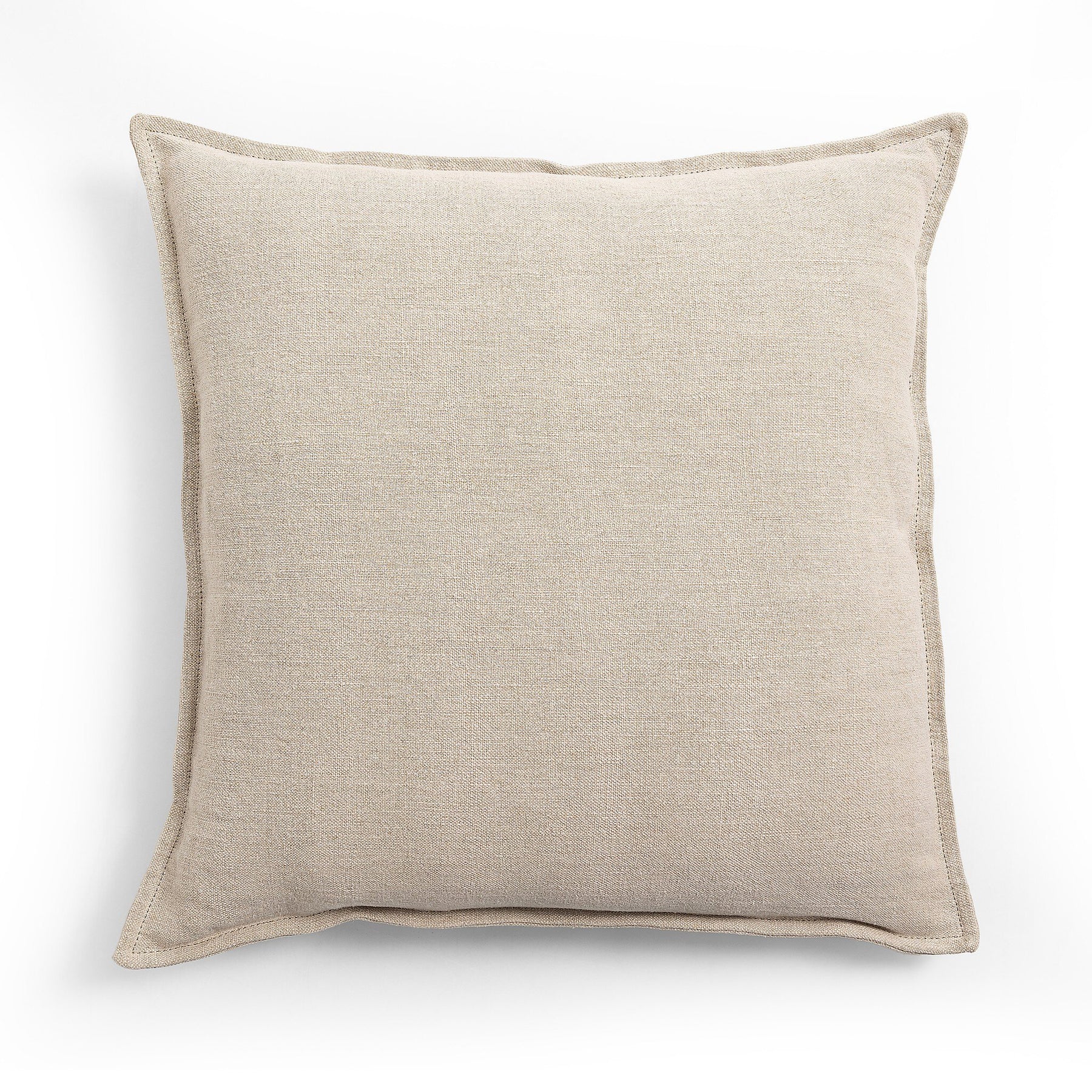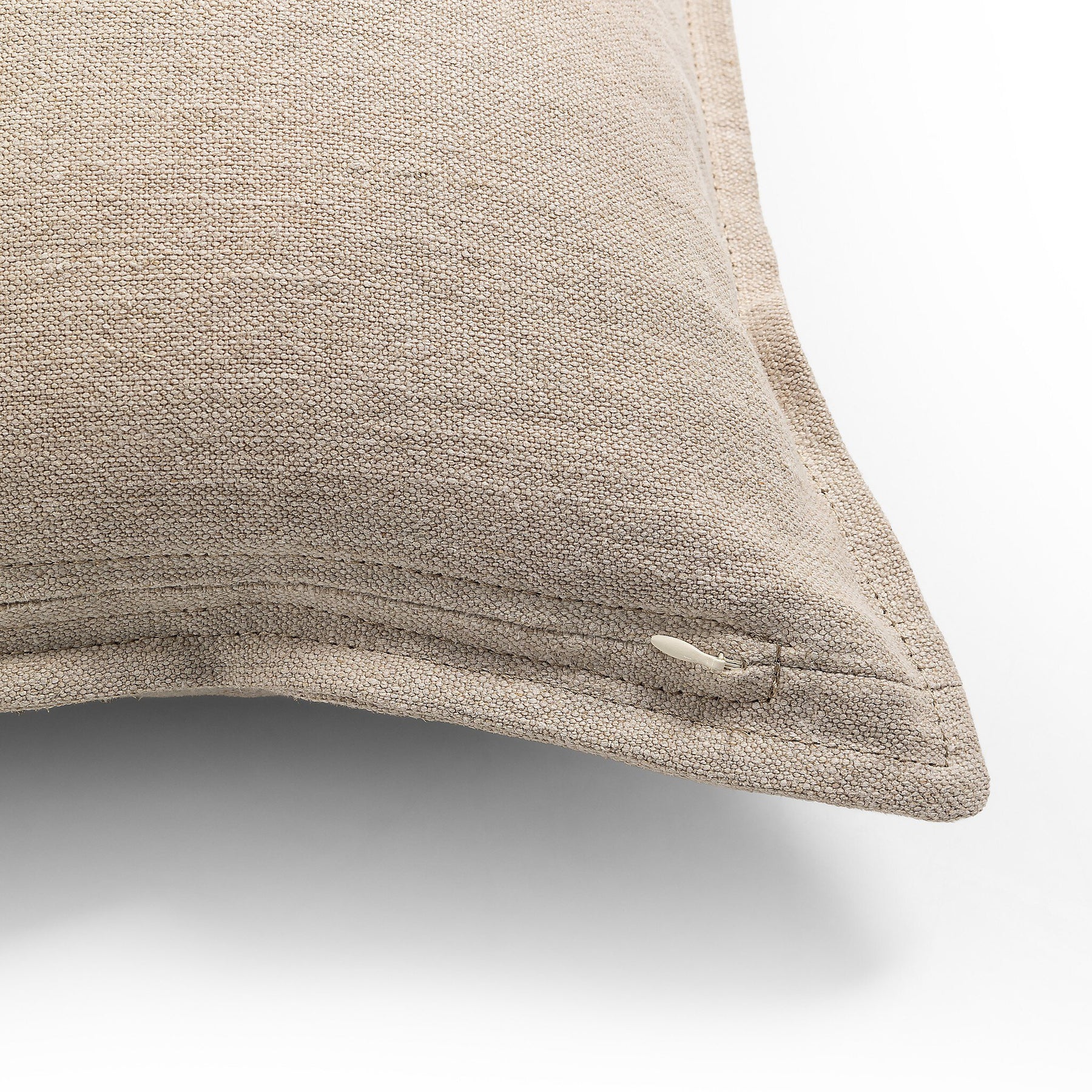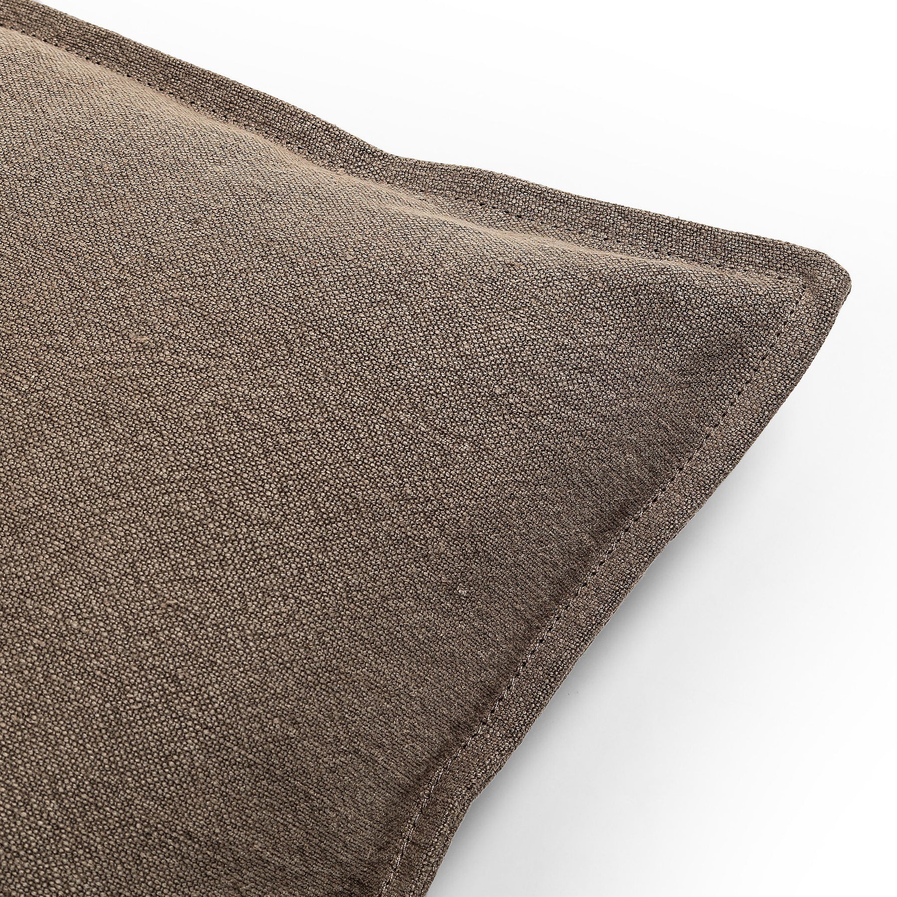 A poly fiber-filled throw pillow of solid linen is framed by a flanged border for definition. Features a hidden zipper closure for a seamless finish.