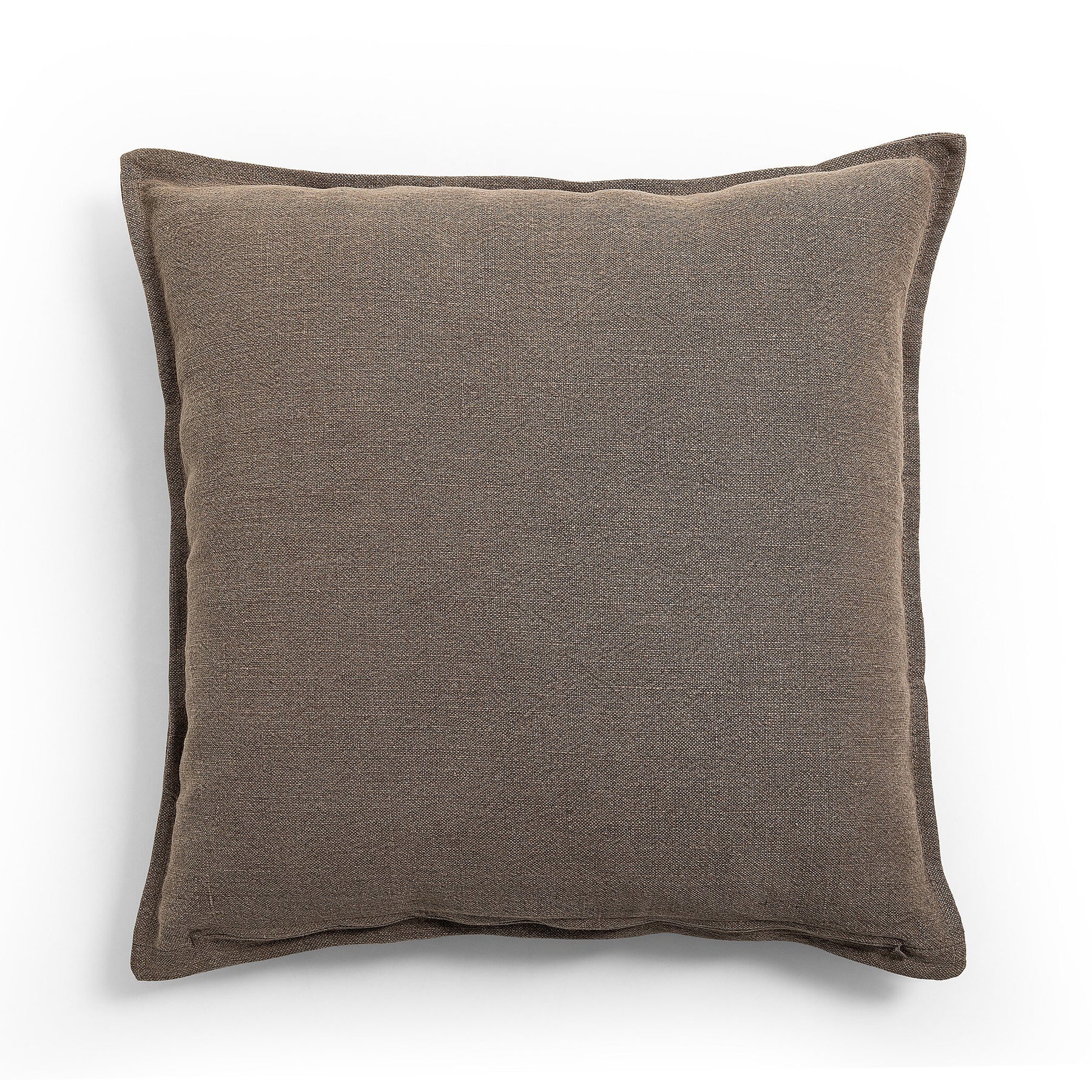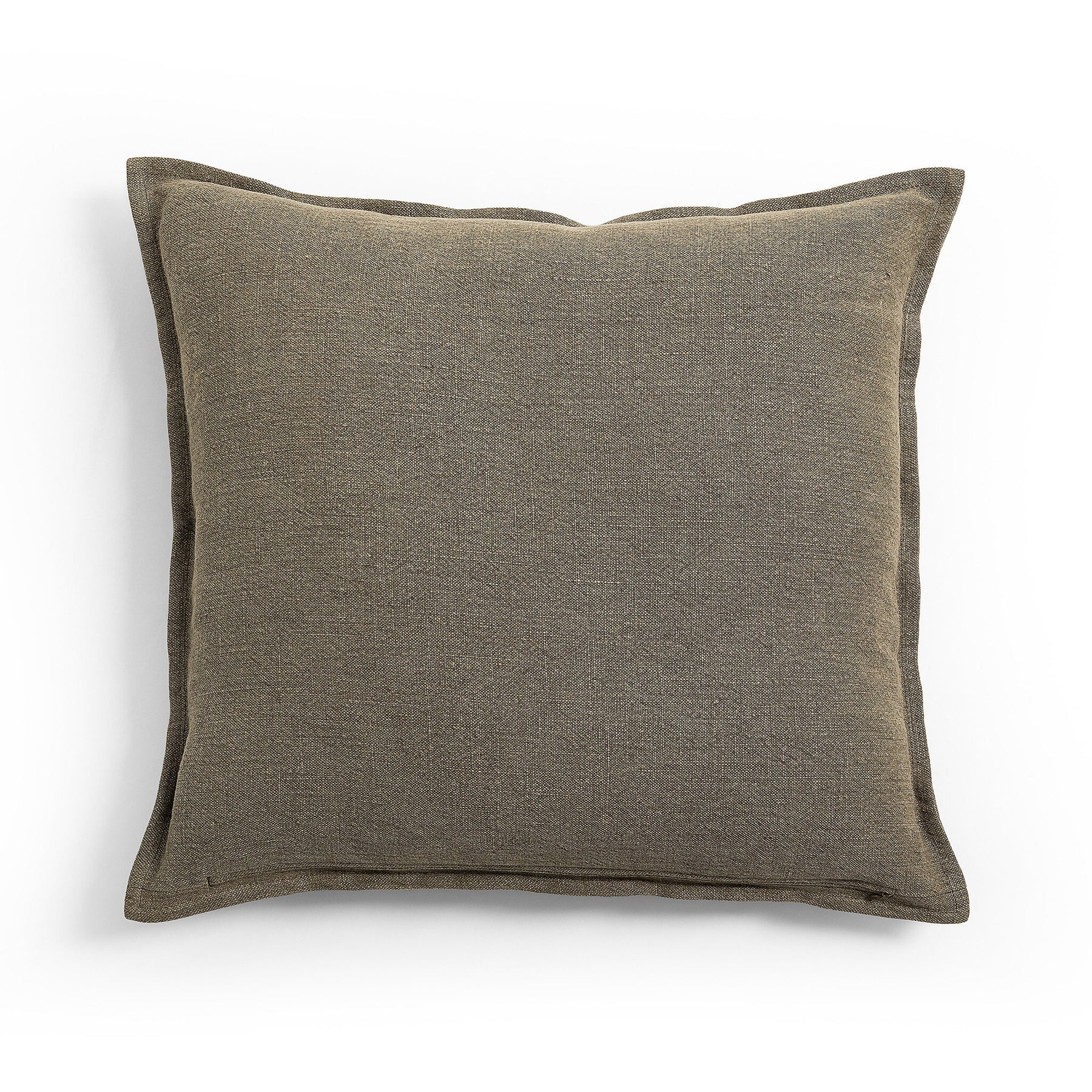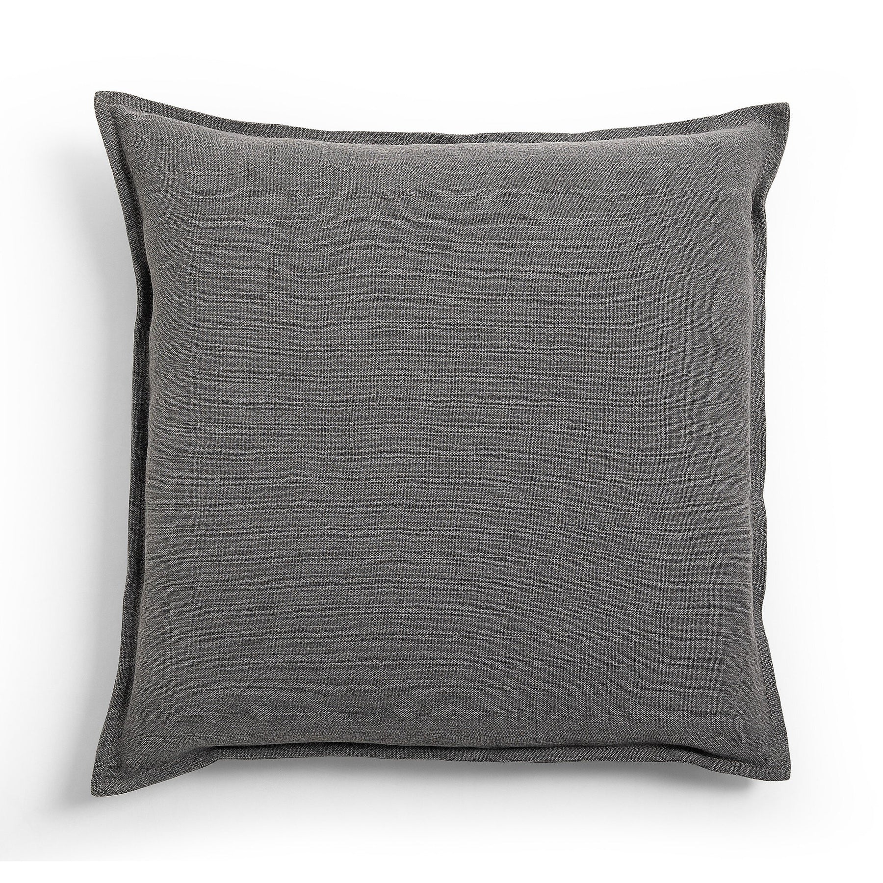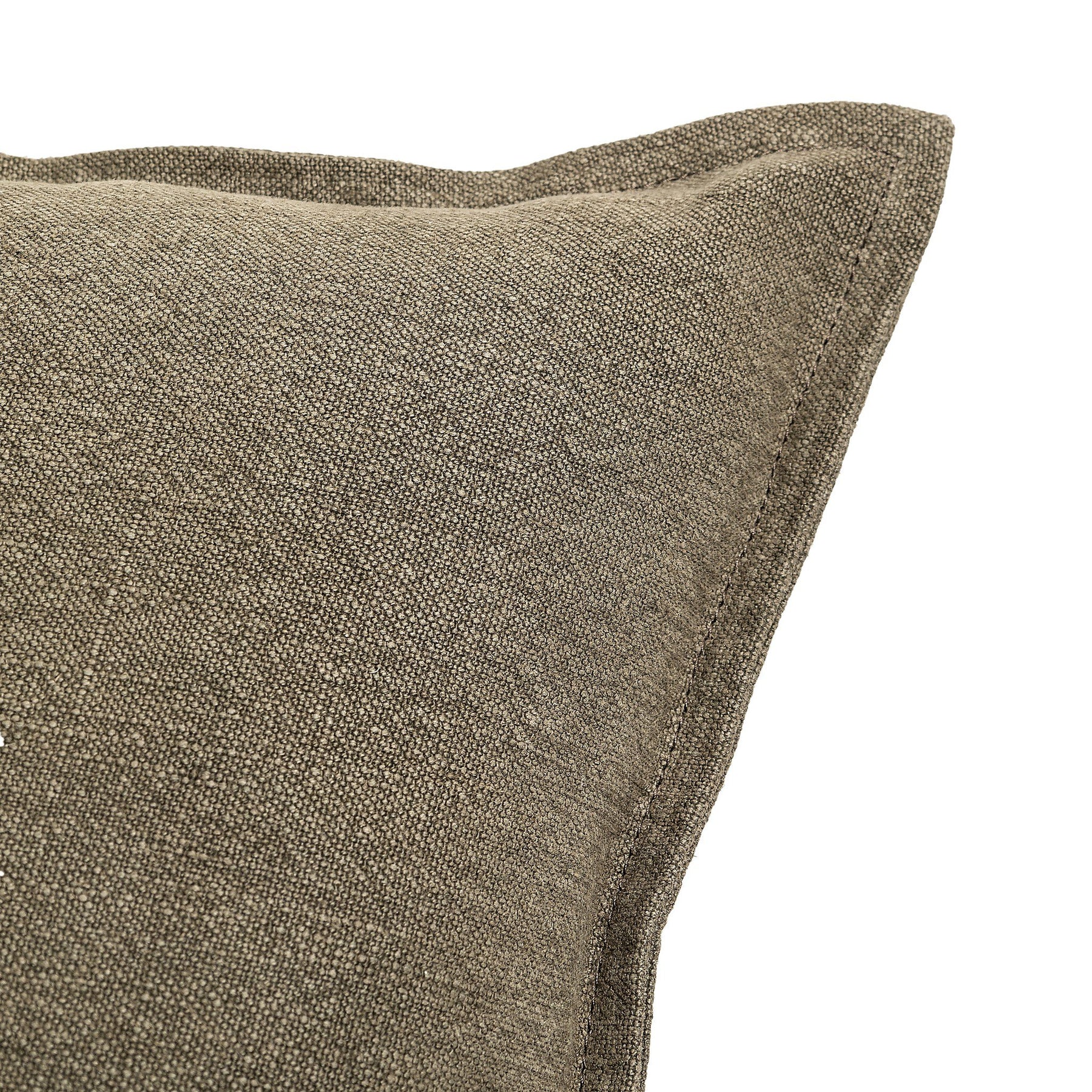 A poly fiber-filled throw pillow of solid linen is framed by a flanged border for definition. Features a hidden zipper closure for a seamless finish.