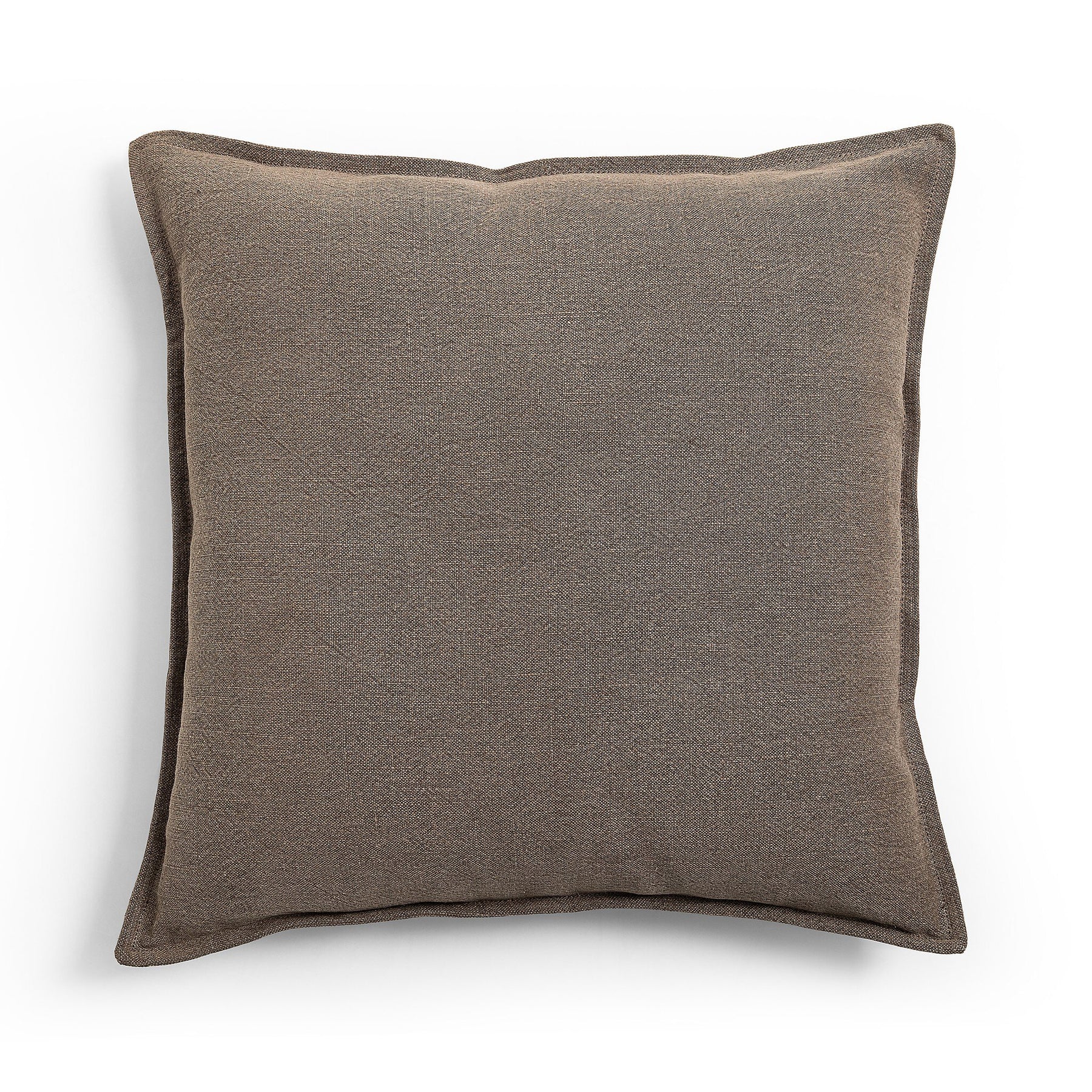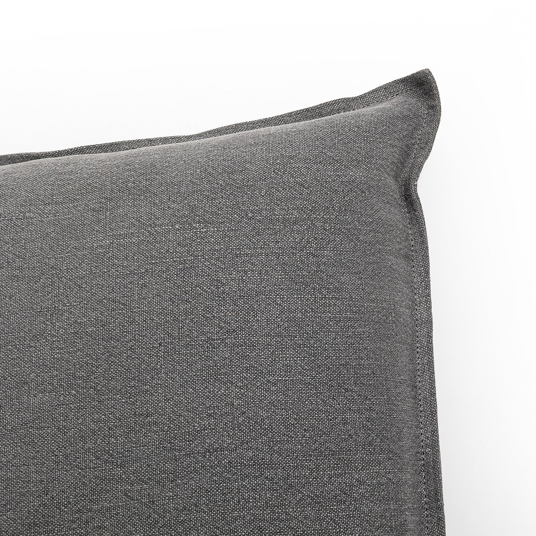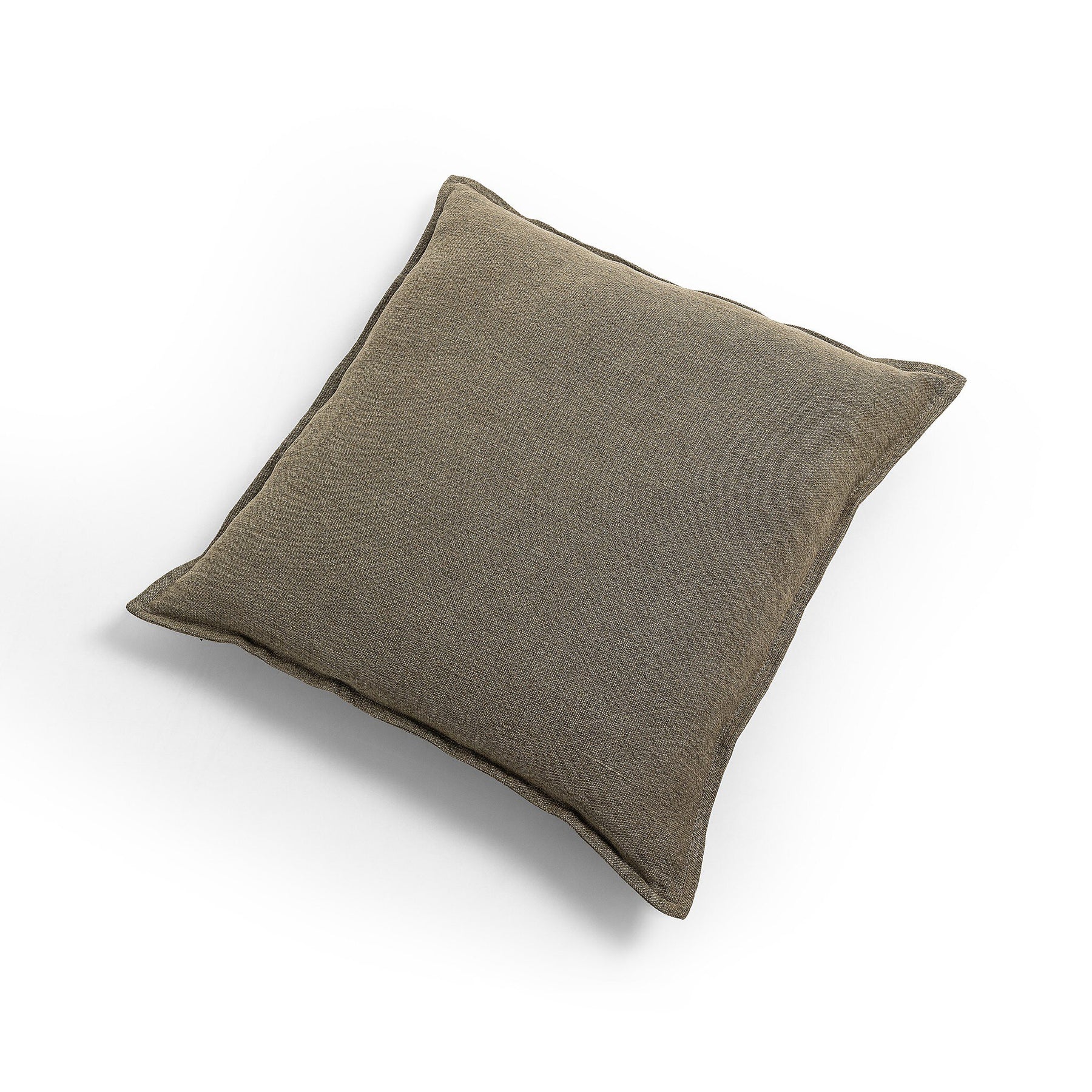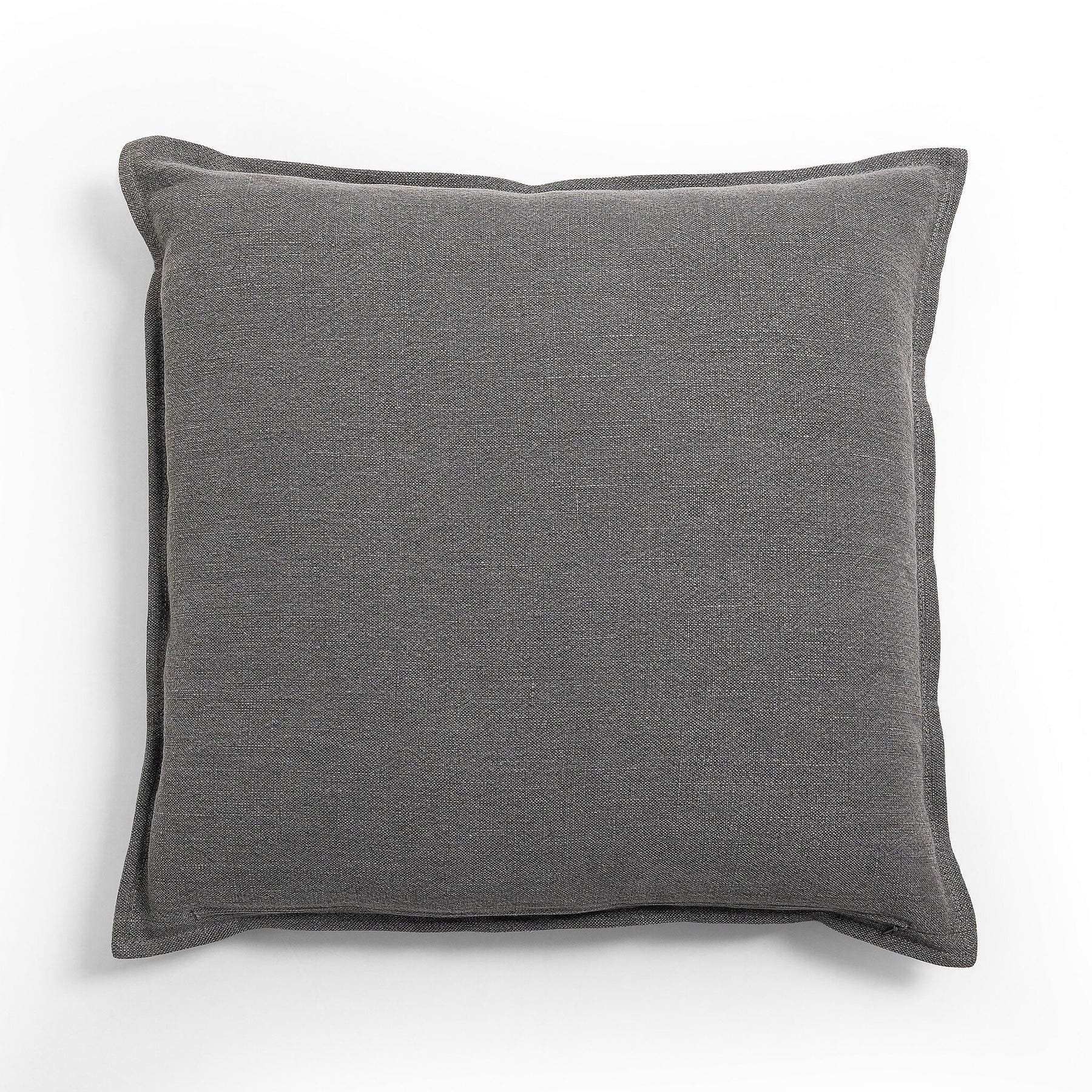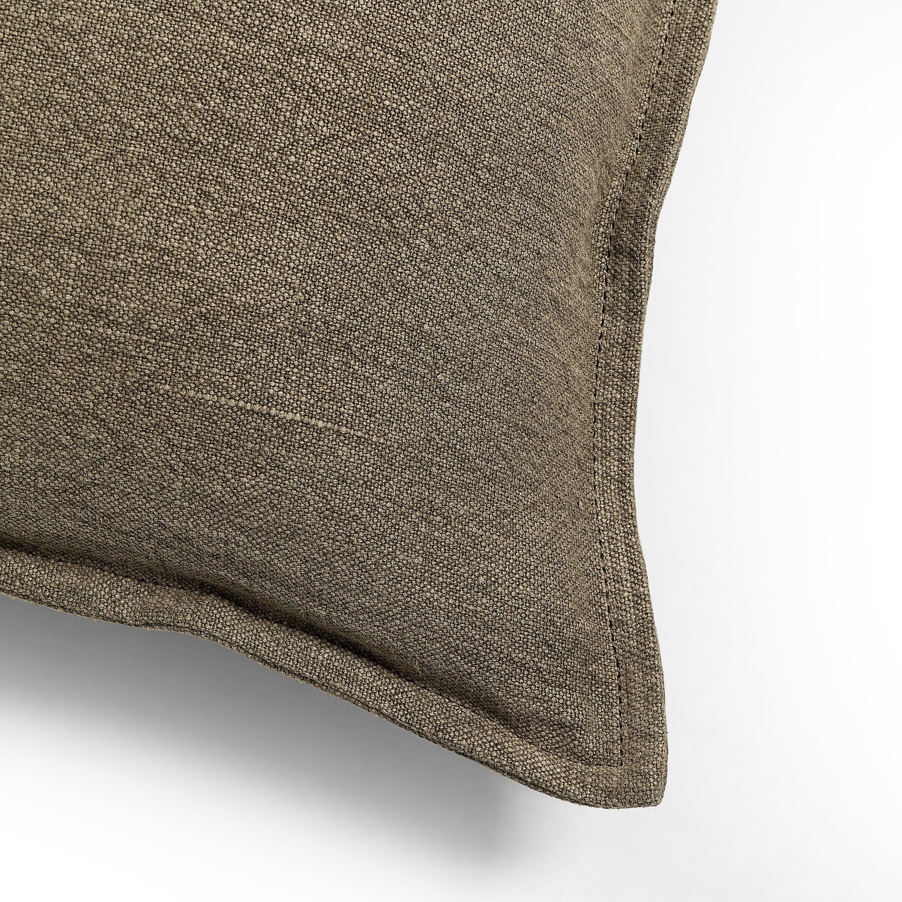 A poly fiber-filled throw pillow of solid linen is framed by a flanged border for definition. Features a hidden zipper closure for a seamless finish.