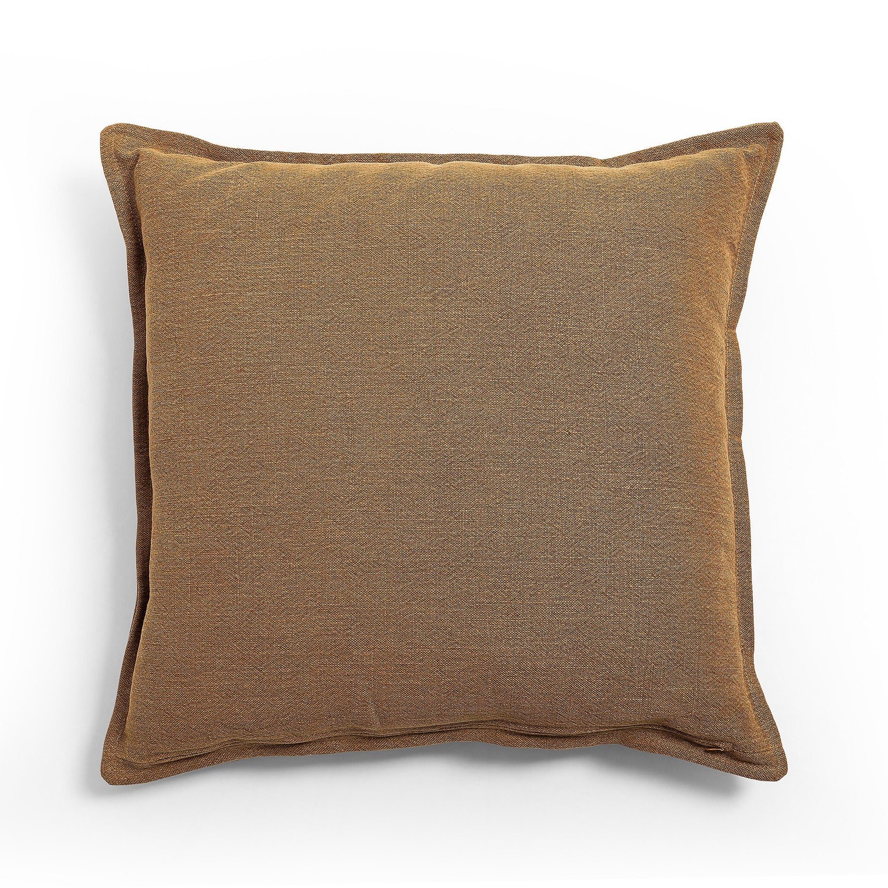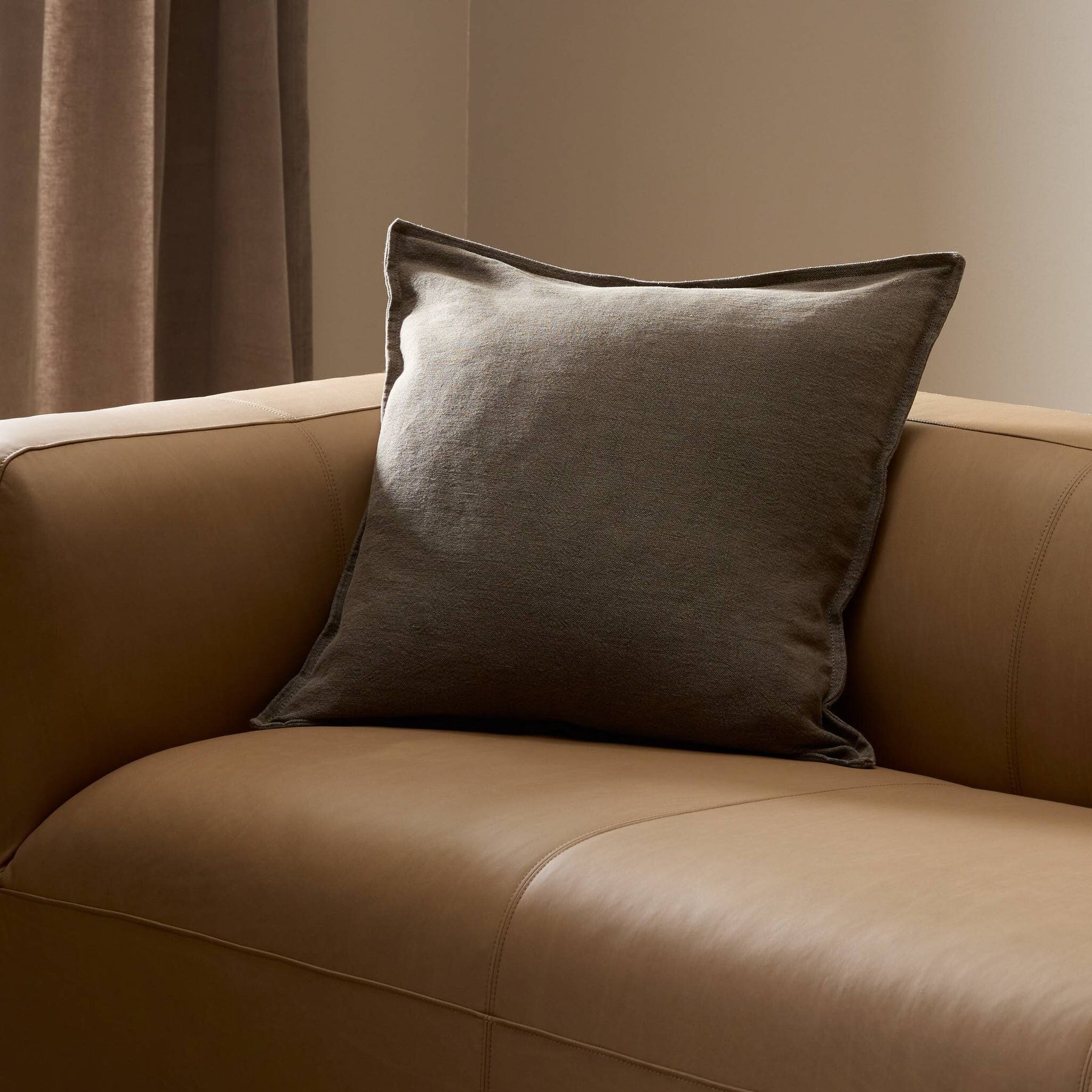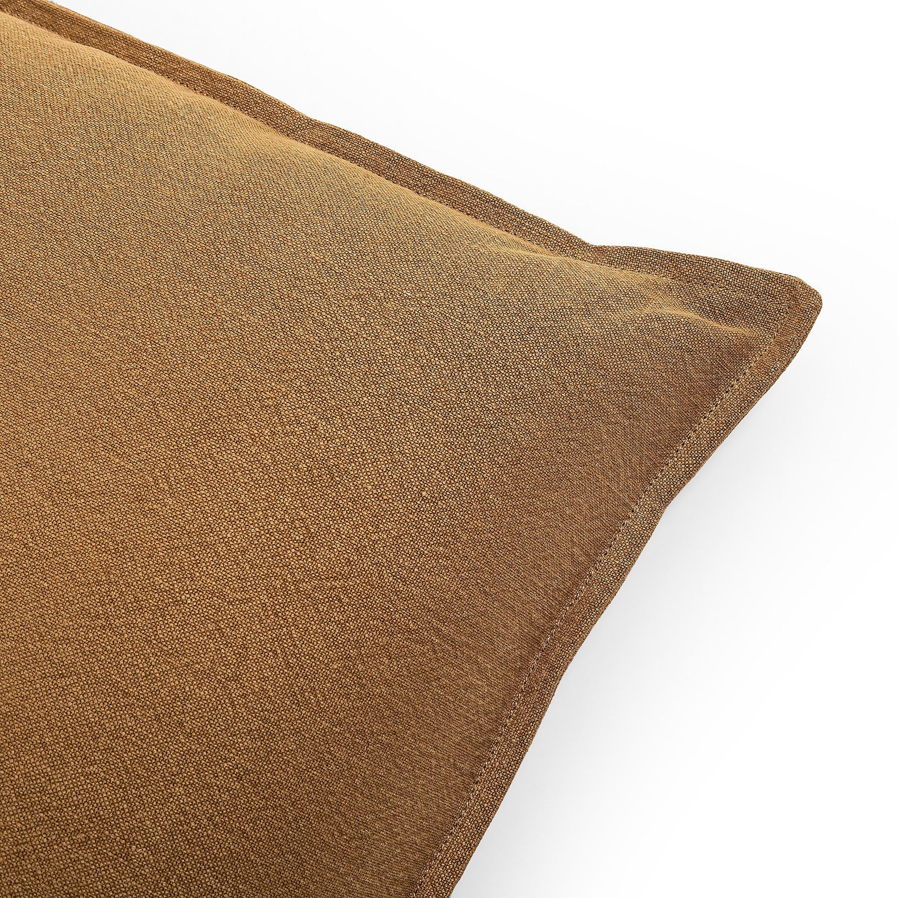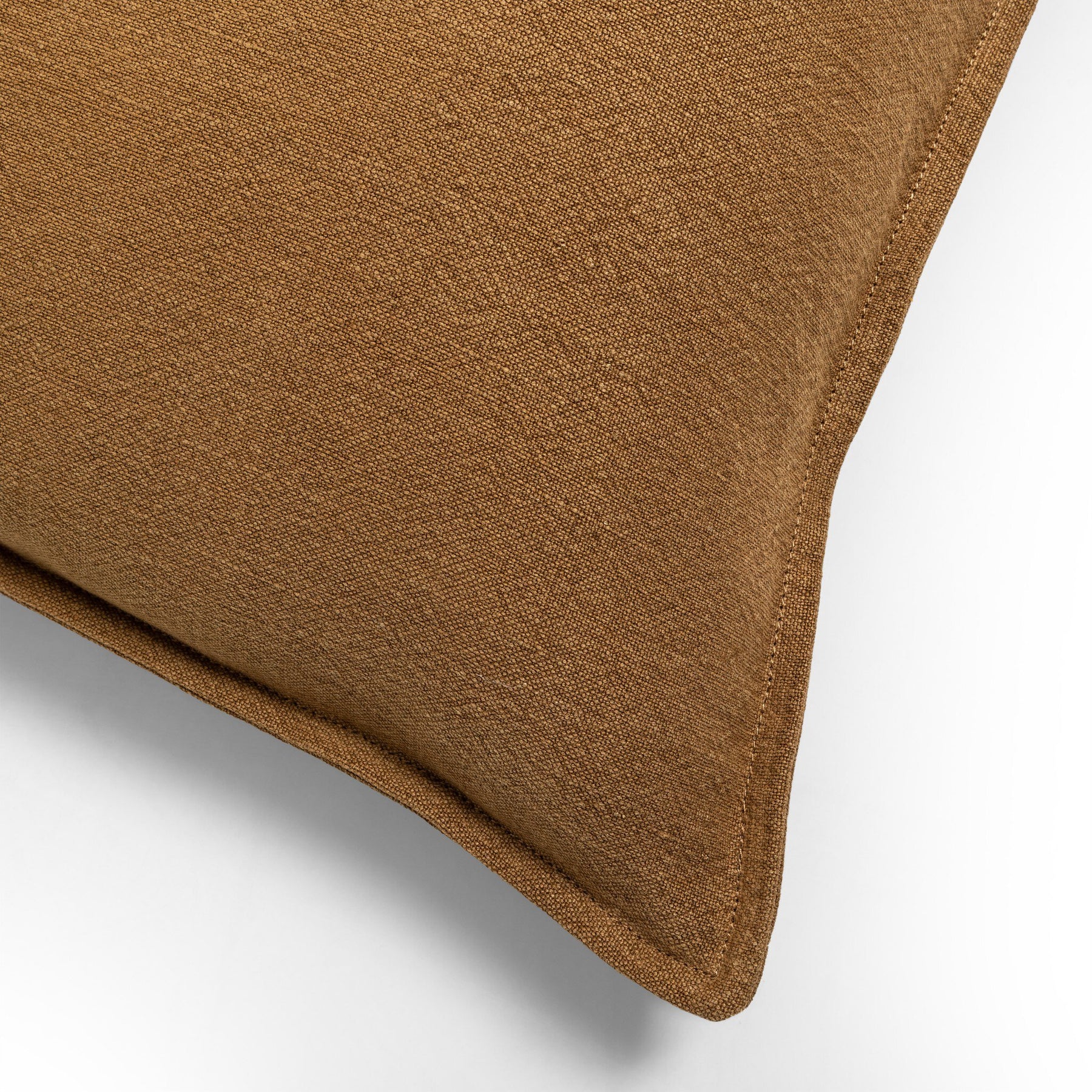 A poly fiber-filled throw pillow of solid linen is framed by a flanged border for definition. Features a hidden zipper closure for a seamless finish.
