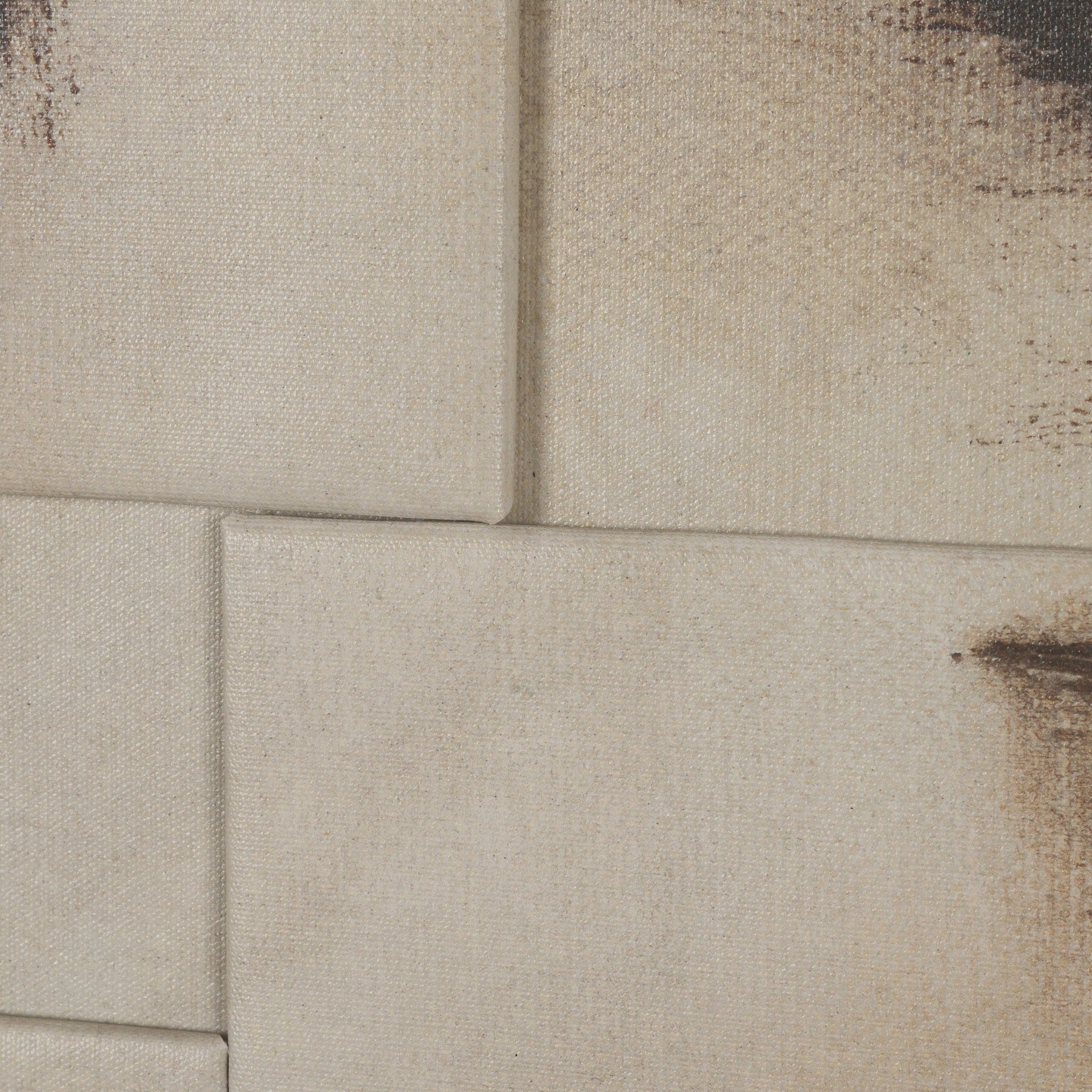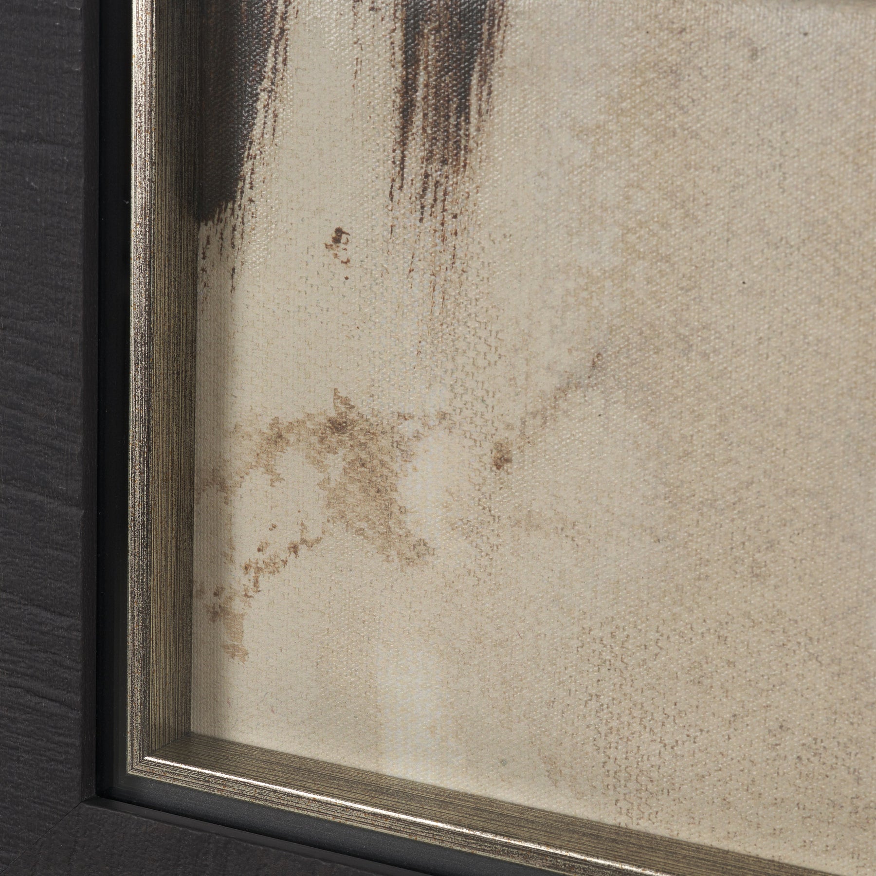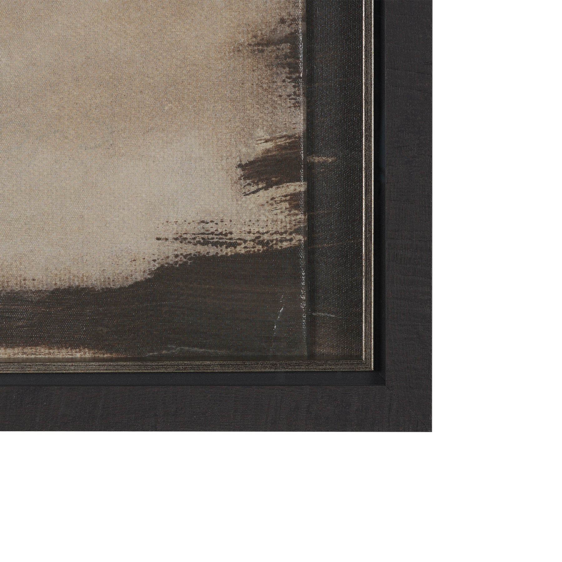 A bold framed art print on canvas, matted under glass. This acrylic painting features abstract brushstrokes in smoky black and warm taupe, creating a layered, almost scorched effect. Geometric paneling within the composition adds structure and visual depth, enhancing its textural contrast. Finished in a dark wood-look frame with metallic detailing, this piece brings a dramatic, grounded presence—ideal for modern, industrial, or minimalist interiors.