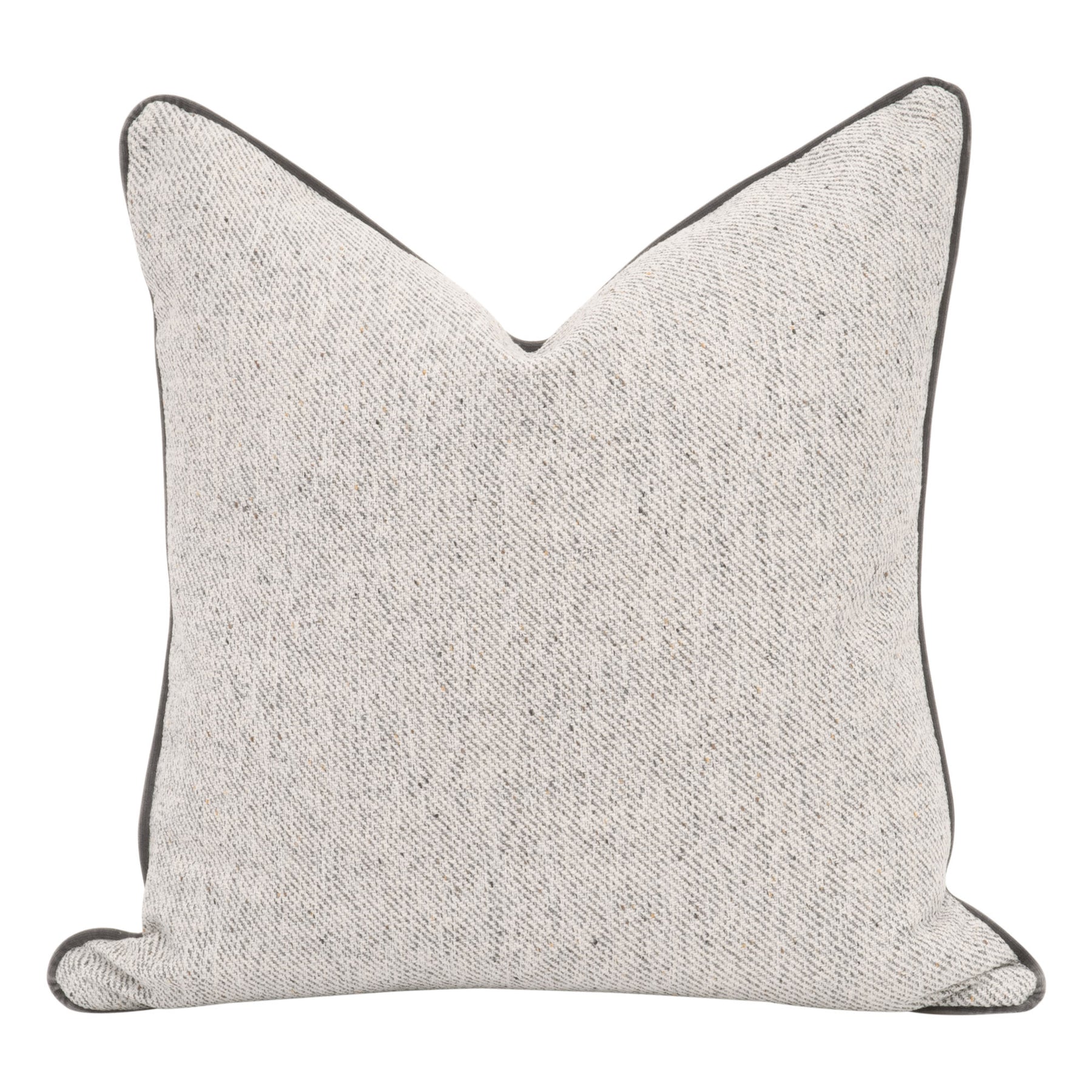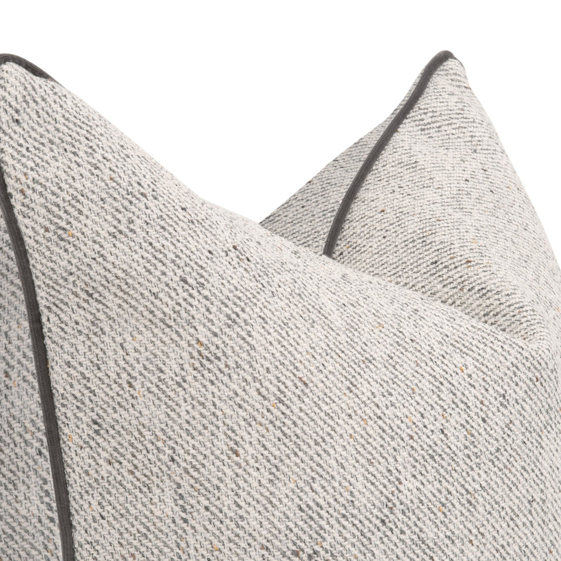 The Darwin Pillow set features a refined Howell Natural fabric with subtle color speckles and elegant Whiskey Brown leather or Dark Dove velvet piping. Filled with 100% down, these pillows offer soft comfort while adding a sophisticated touch to any room.
