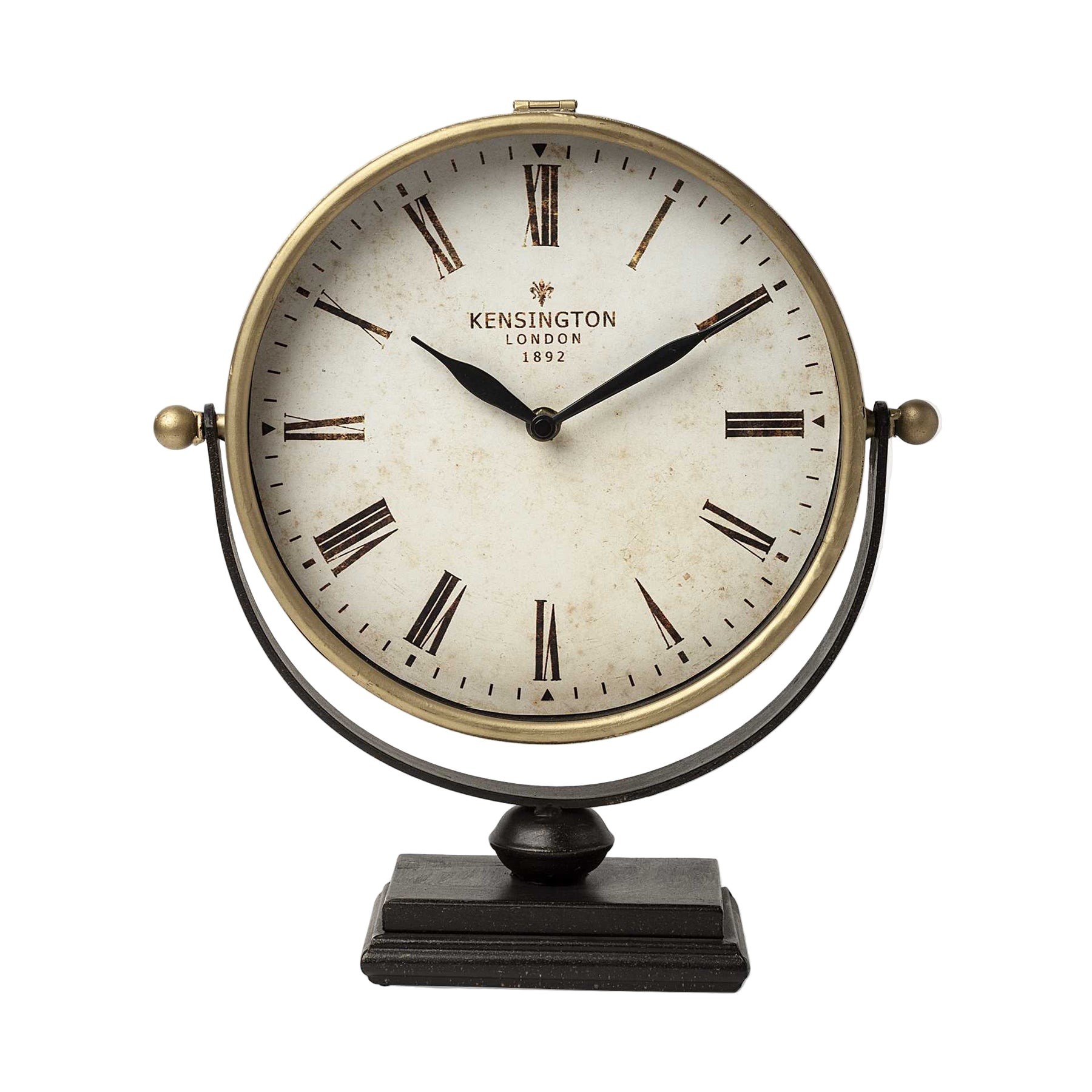 Free-standing London inspired clock with gold metal outside trim and classic base with a half-moon shaped holder and a white face with Roman numerals. Uses 1 AA Battery (not included).