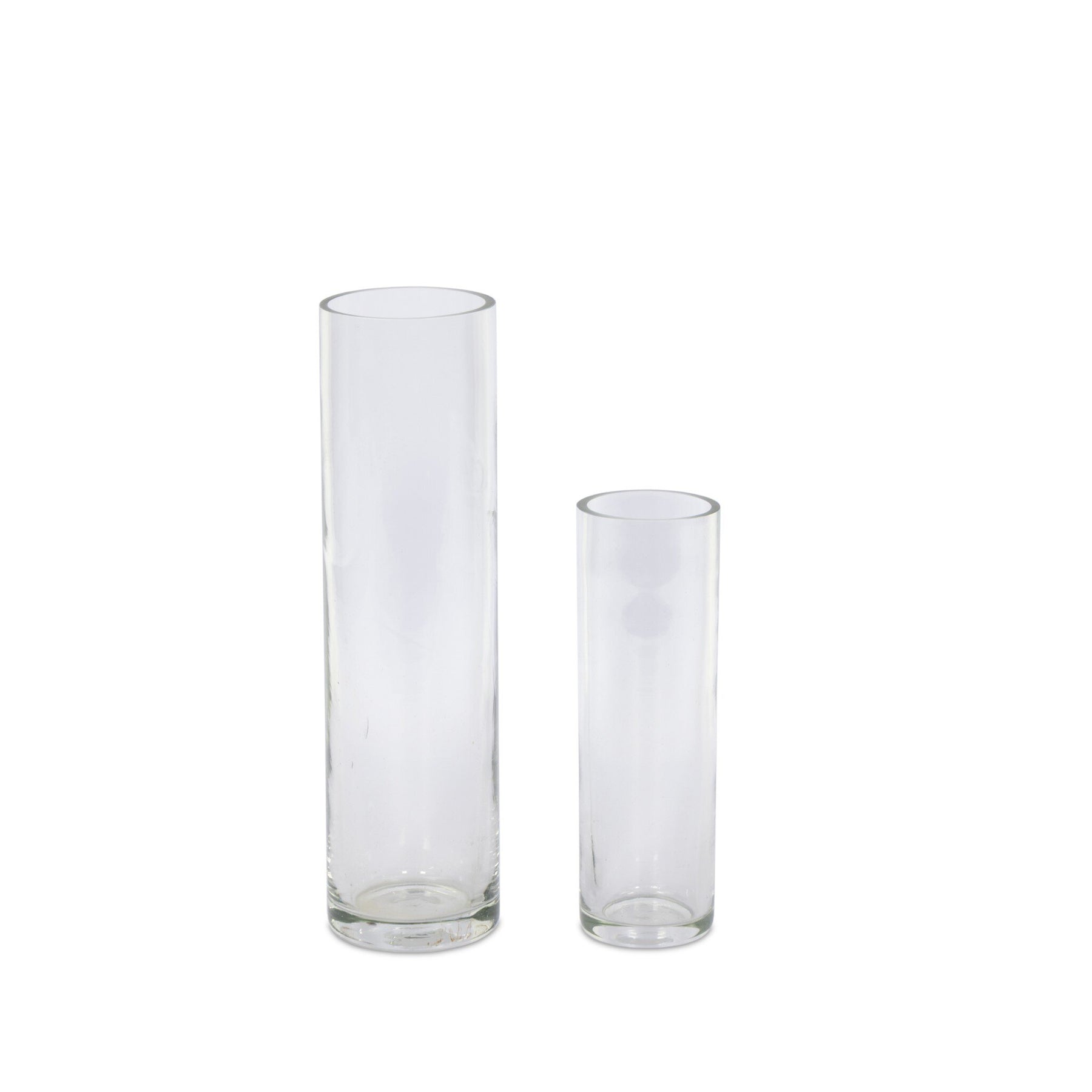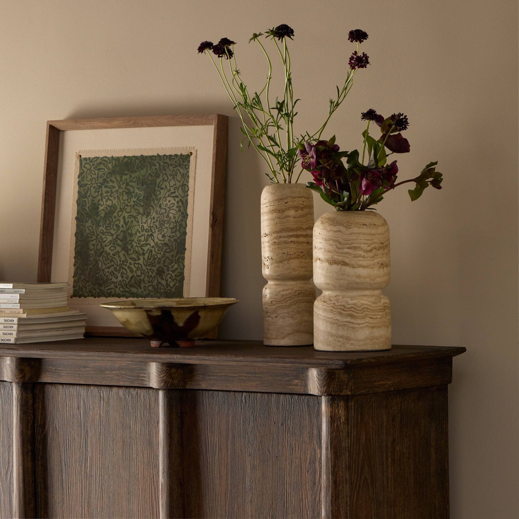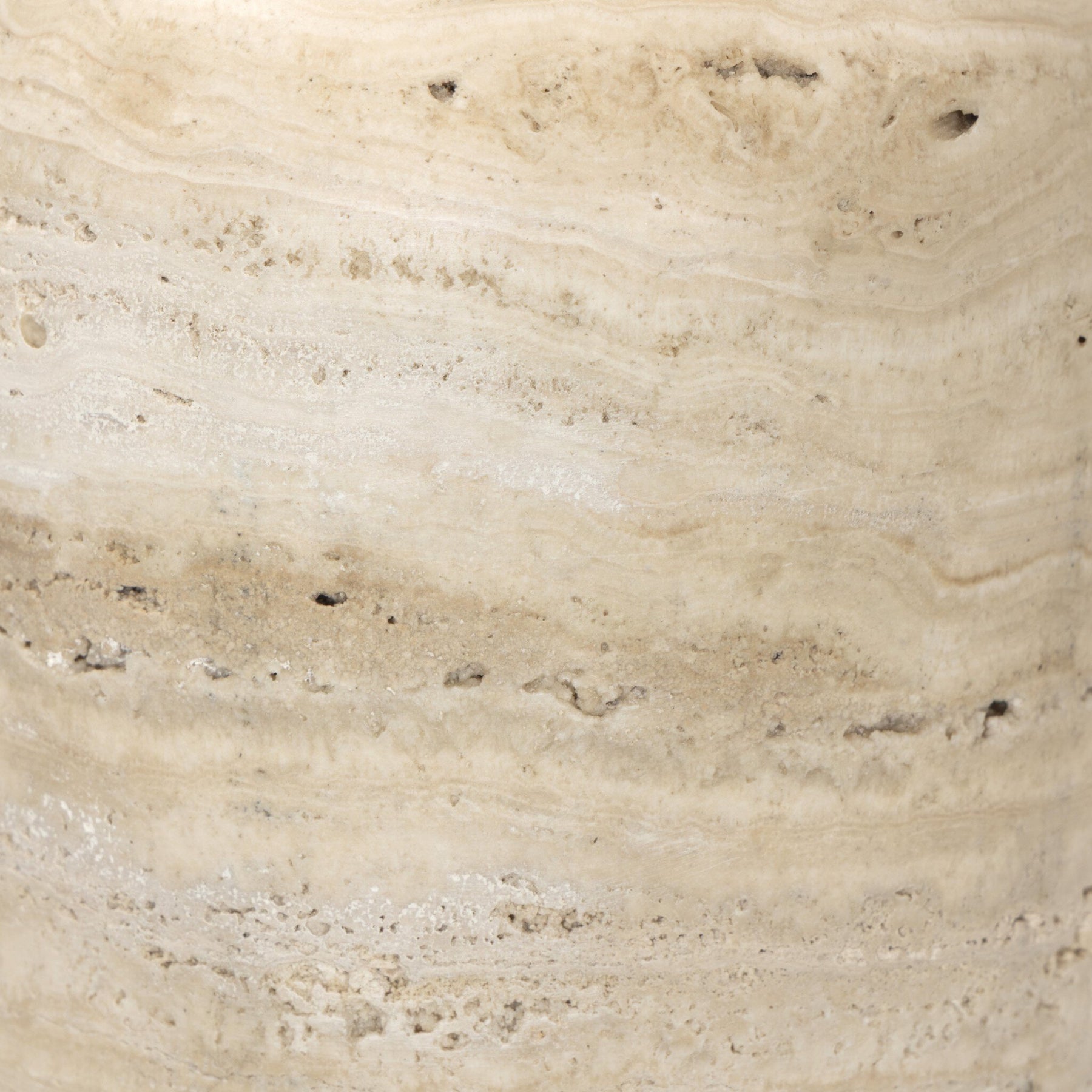 A pair of varied-size cylindrical vases, carved from travertine for a smooth, modern profile with clean curves. Complimented by a single pinched bullnose detail in the middle and the layered minerals and natural cavities of the material. Included interior glass sleeves make the vases water tight for florals.