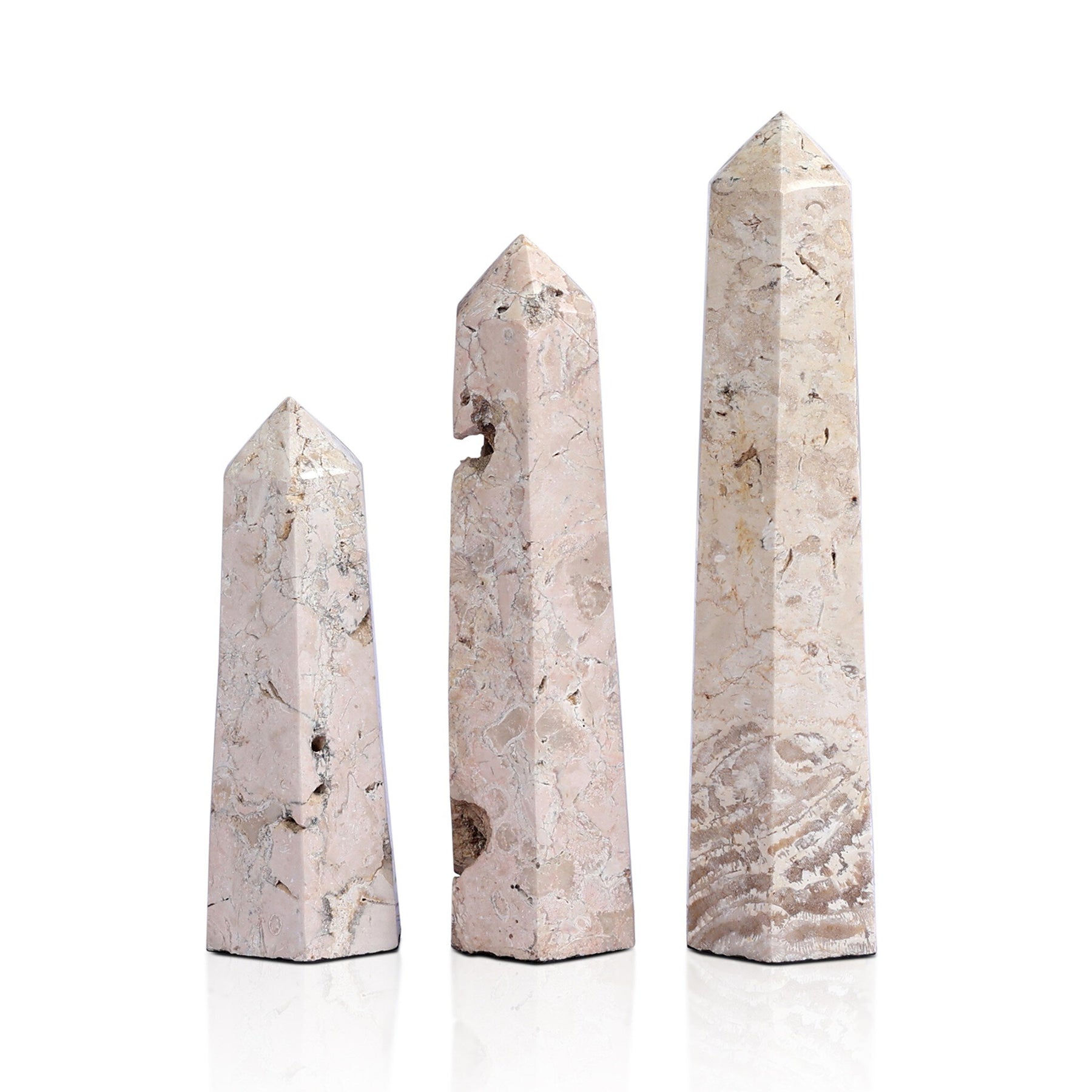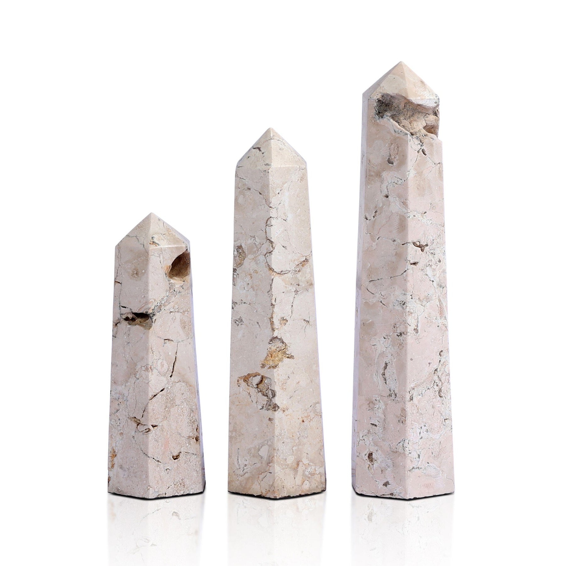 Craft character on your bookcase, entryway table or any other surface with a three-piece set of hexagon obelisks. Made from Romano Fosse travertine, each piece showcases unique mineral deposits and natural cavities, making every set truly one of a kind.