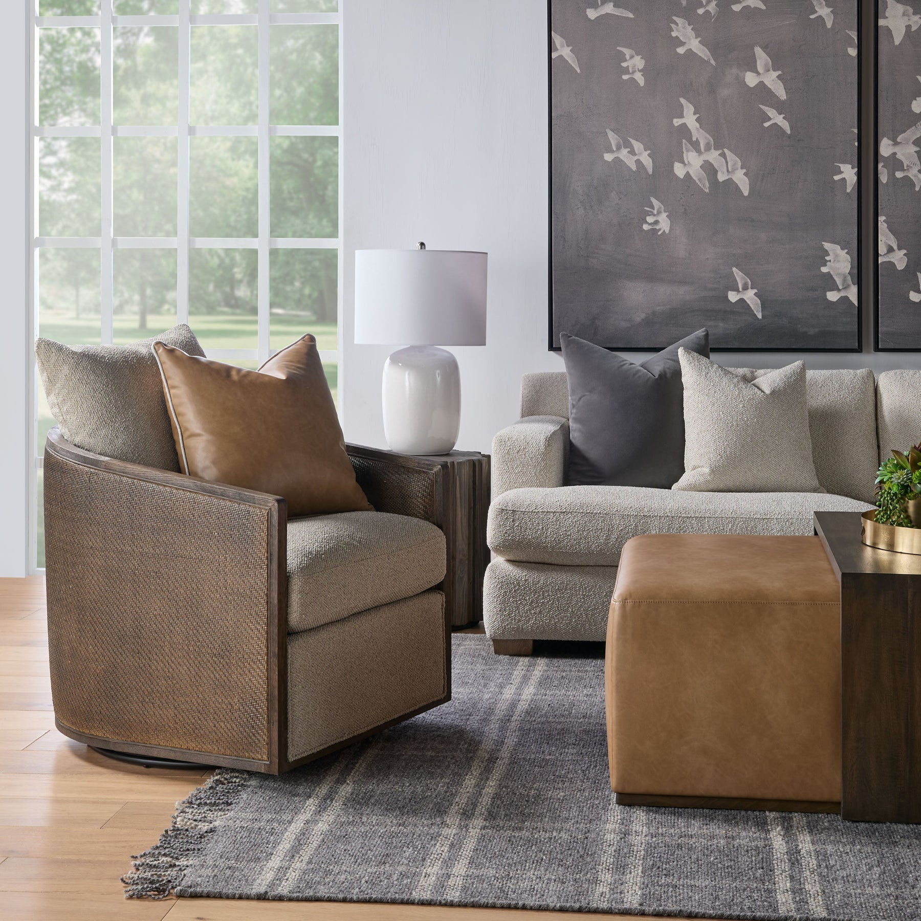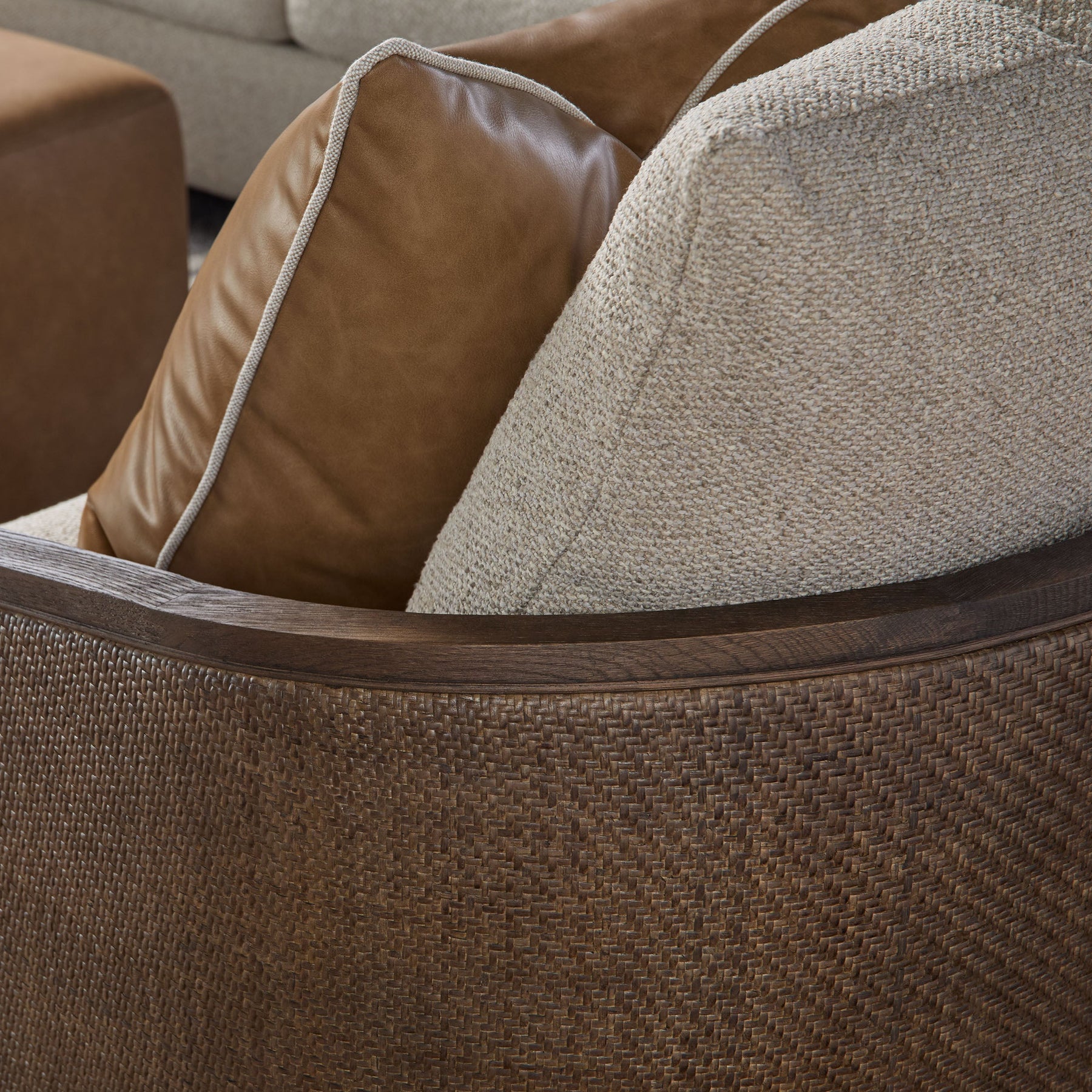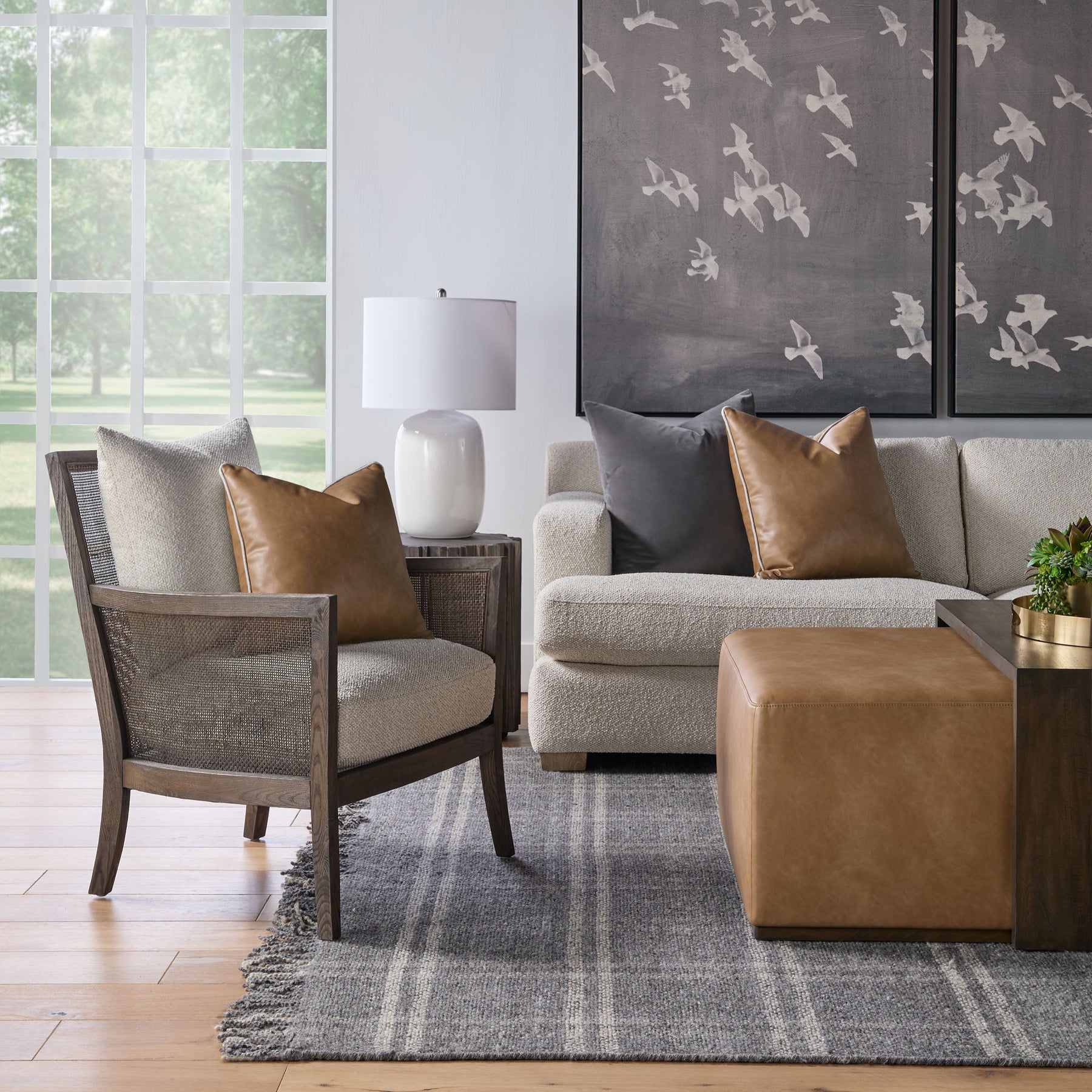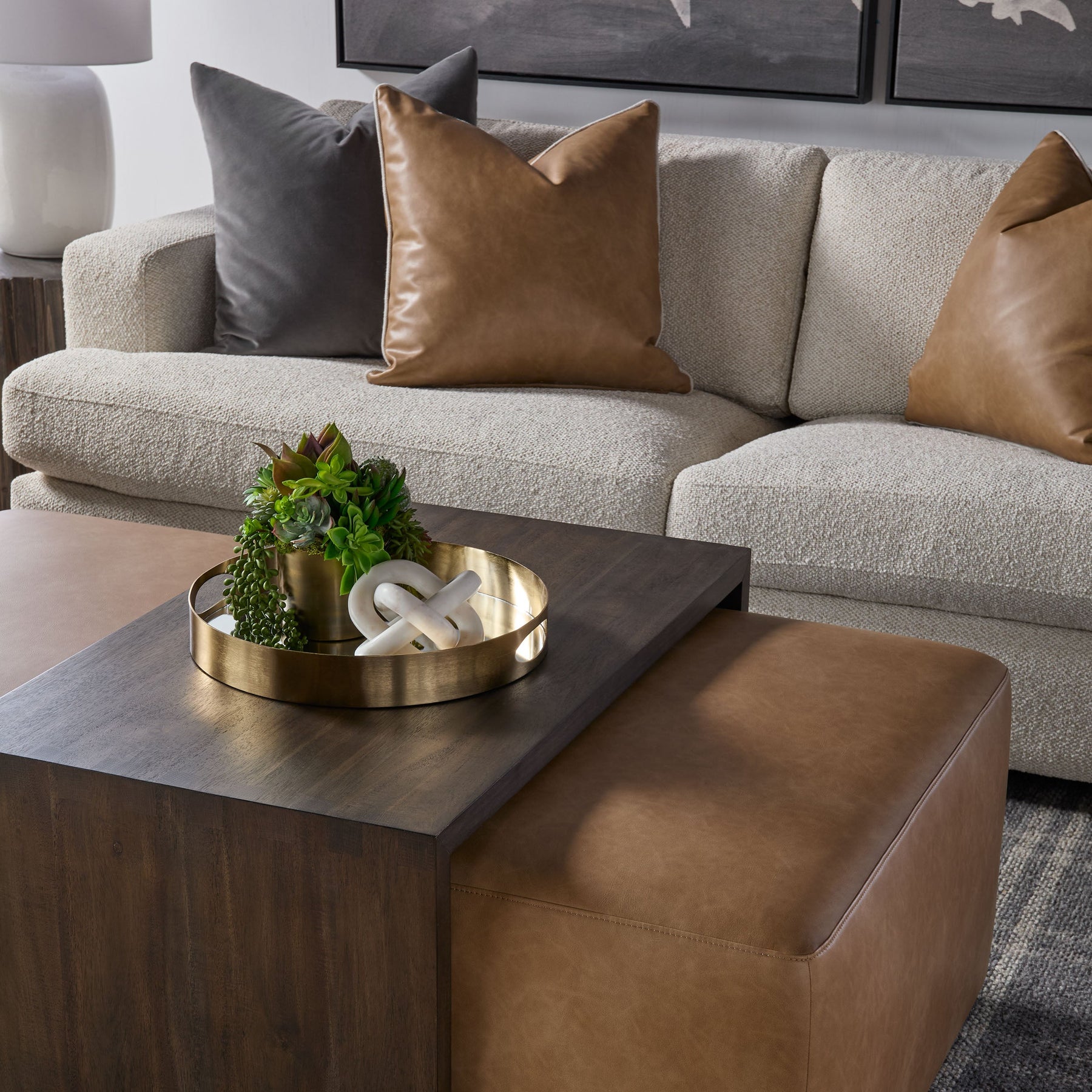 The Mabel Pillow is the perfect blend of modern decorative style and luxury. The pillow features the luxurious Ivanhoe Toast PU vegan leather, which is a rich and creamy medium brown, adding a pop of warmth and texture to any seat is rests upon. The pillow is filled with down and includes a zip closure to make cleaning and fluffing easy. It features detailing along the edges with performance Bisque French Linen piping. This pillow is the perfect size to complement any space, making it a must-have addition to your home decor.