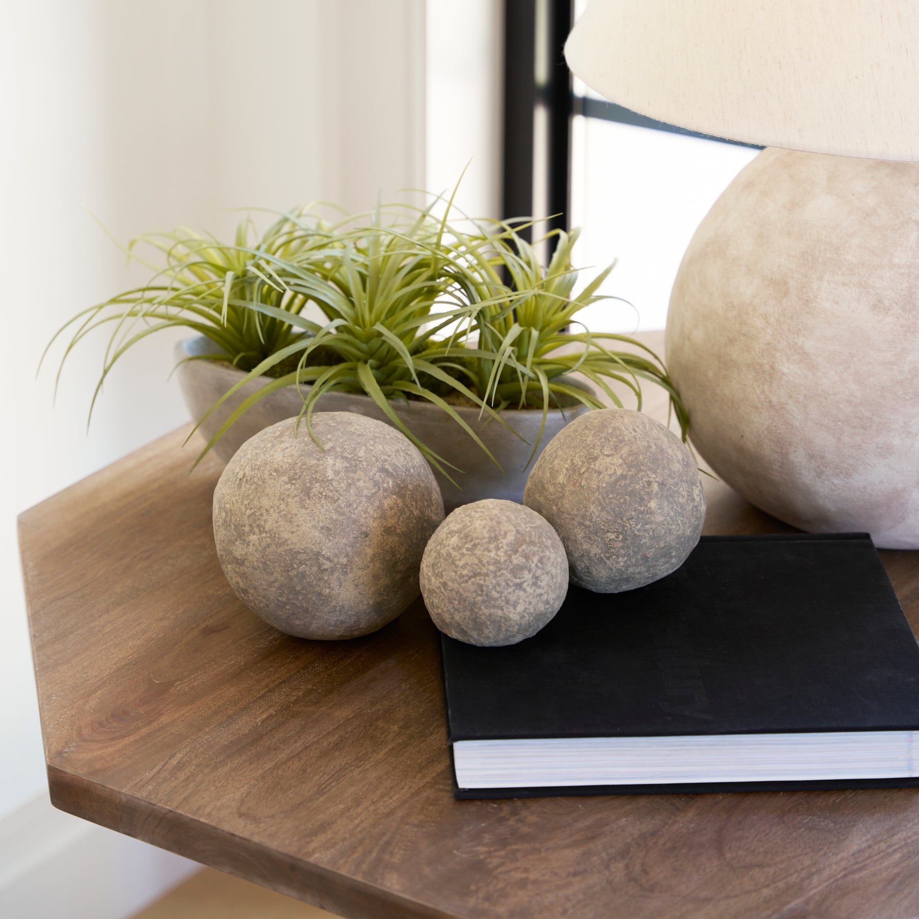 Each set of three Marina decorative balls is one-of-a-kind. Hand-crafted from upcycled materials and finished light beige ardi, no two paper mache pieces are the same - variations in color, size and shape.