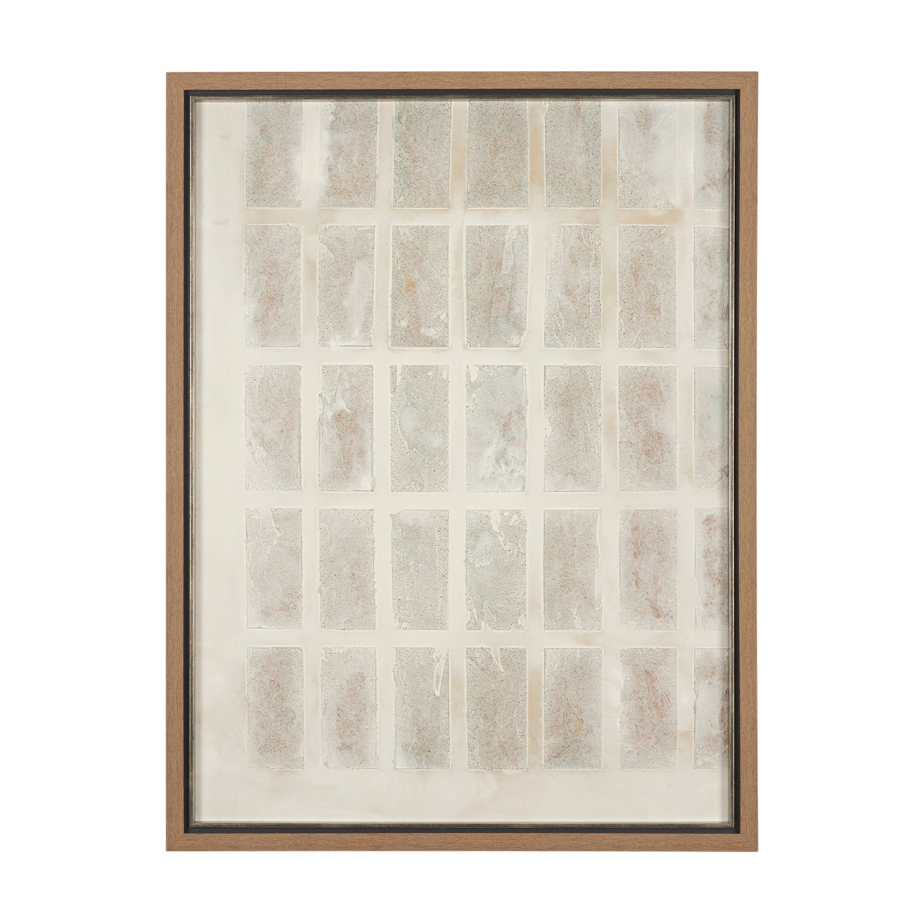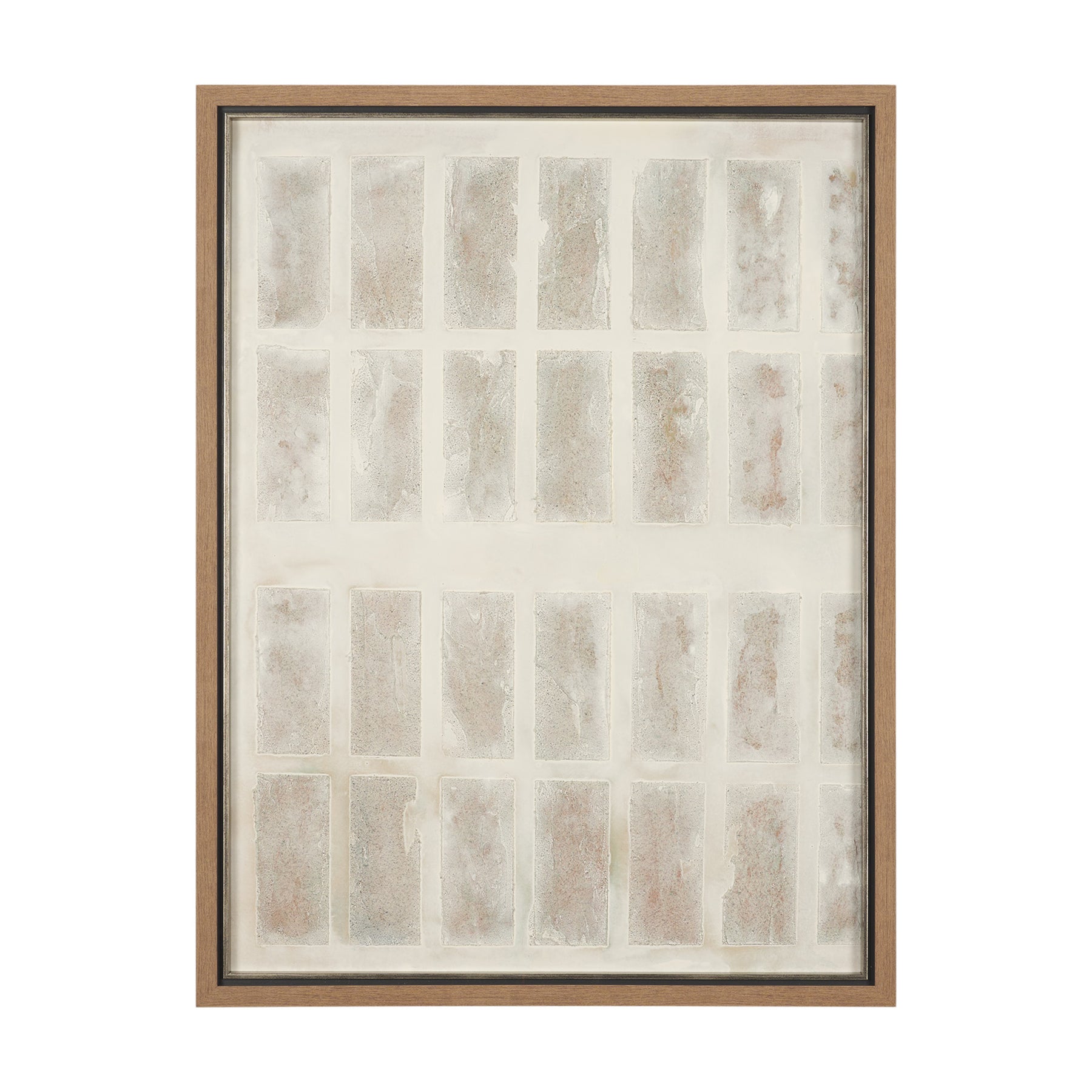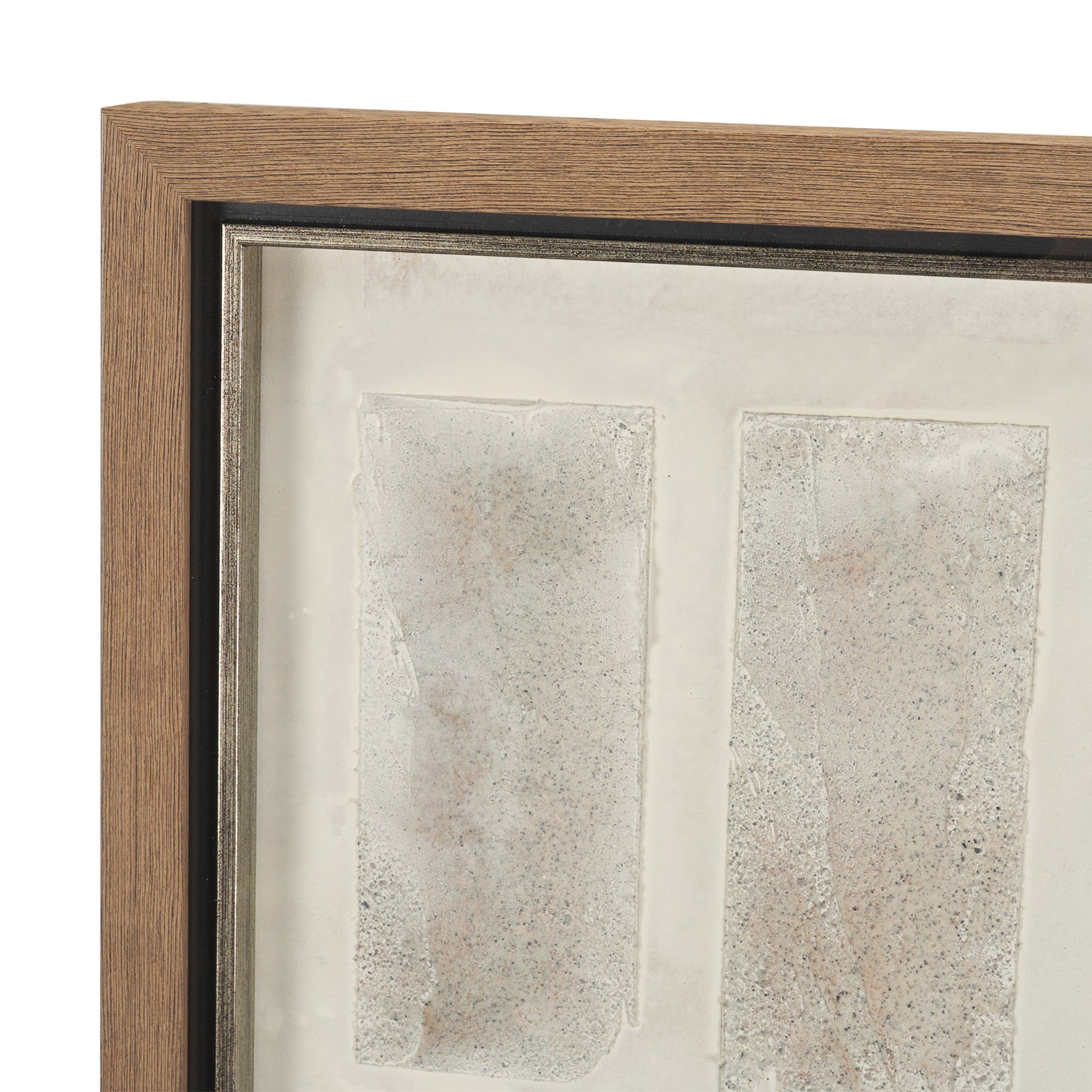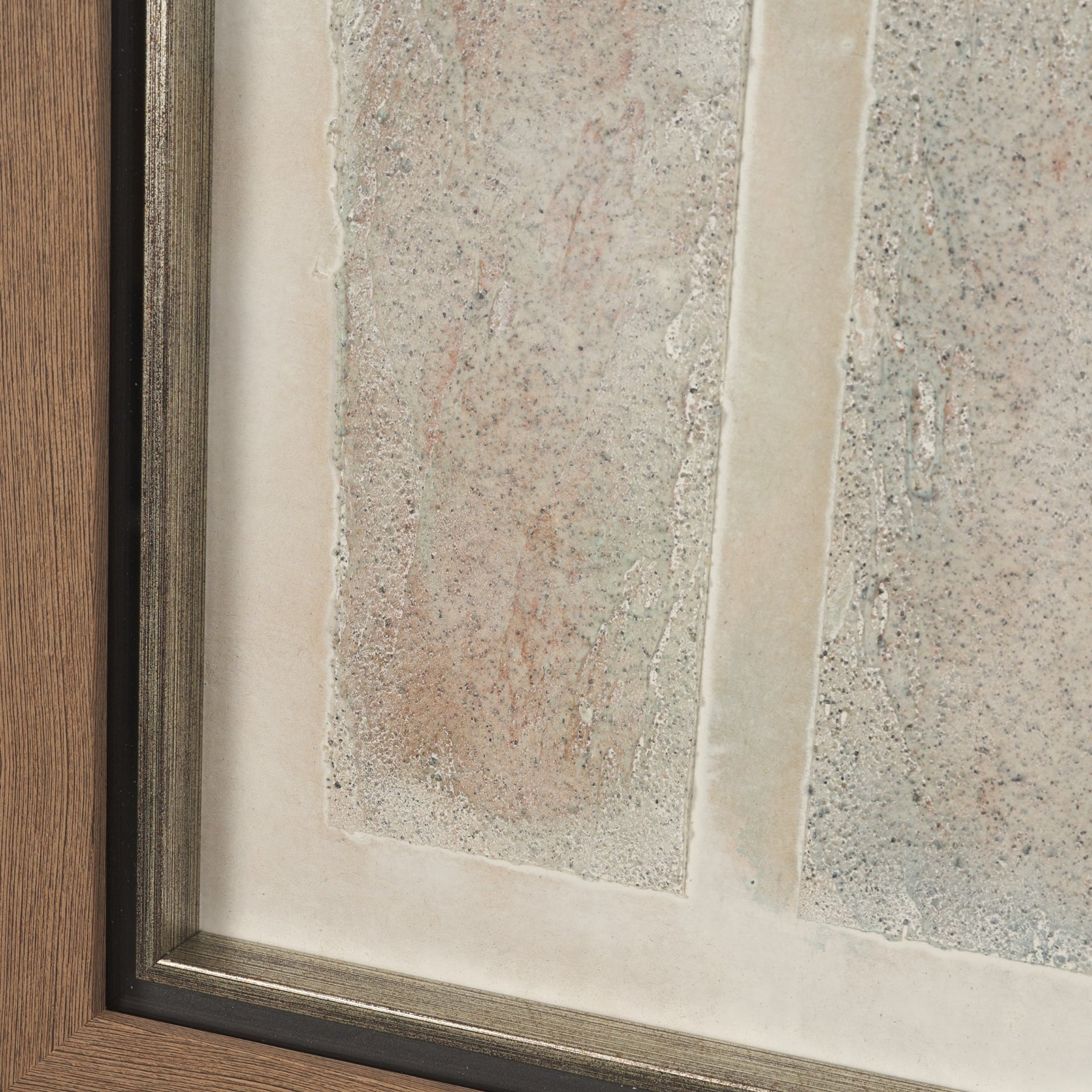 Sand & Structure I by Studio M is a fully hand-produced original artwork on wood, matted and mounted under glass. It features a rhythmic grid of textured rectangular forms in soft, sandy neutral tones—each uniquely layered to suggest natural erosion, stone, or architectural impressions. Framed in a warm wood-look frame with metallic detailing, this minimalist piece blends organic texture with geometric order, ideal for modern or transitional interiors seeking quiet structure and earthy sophistication.