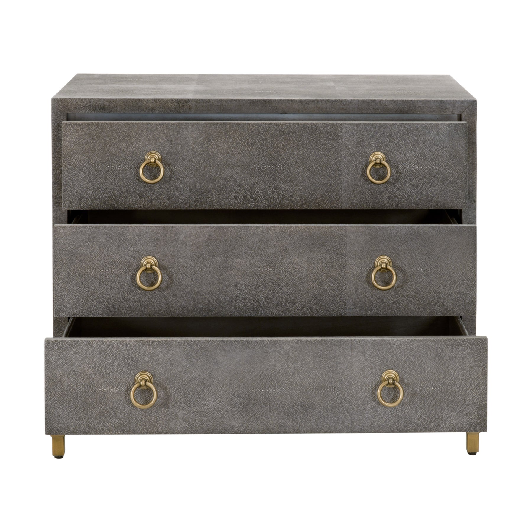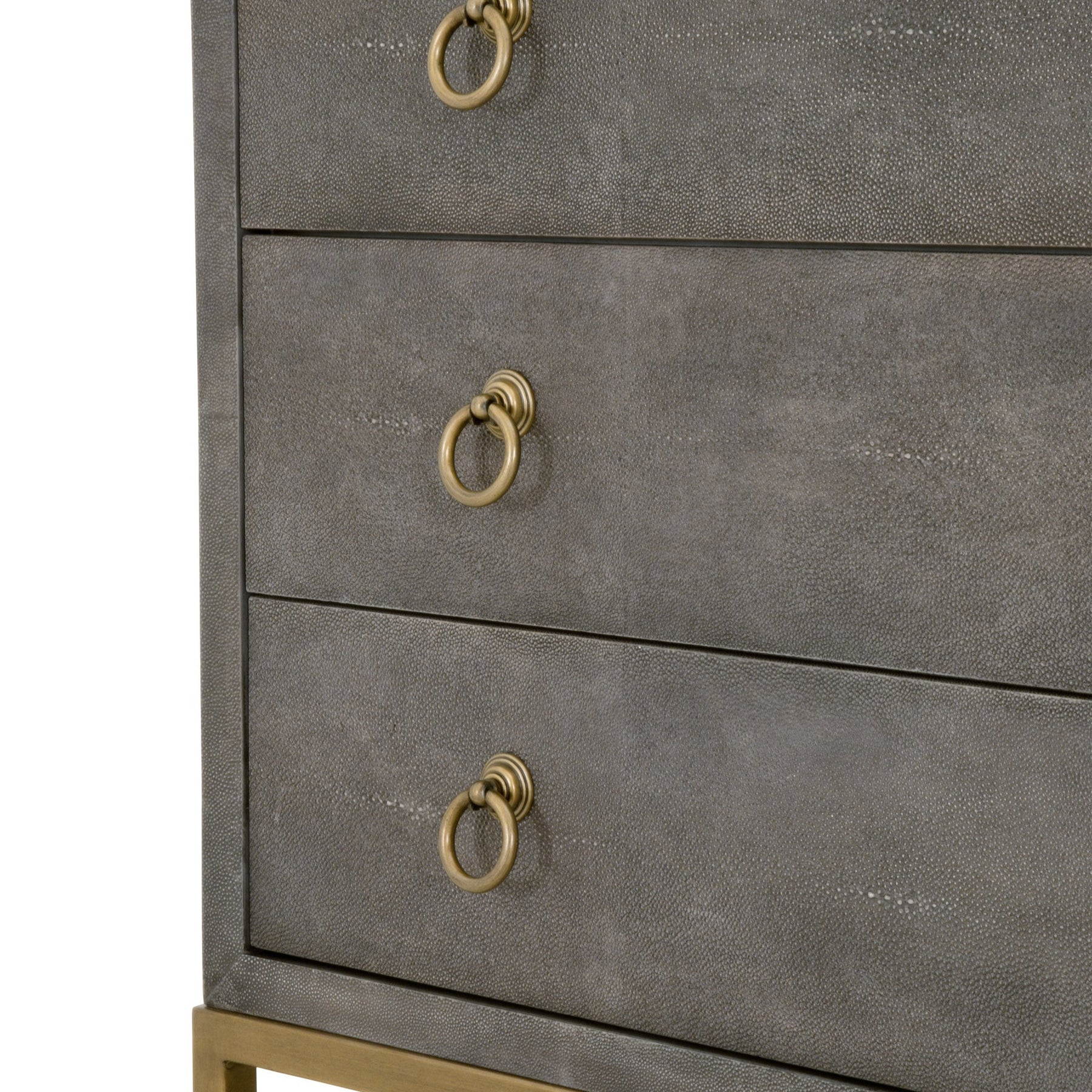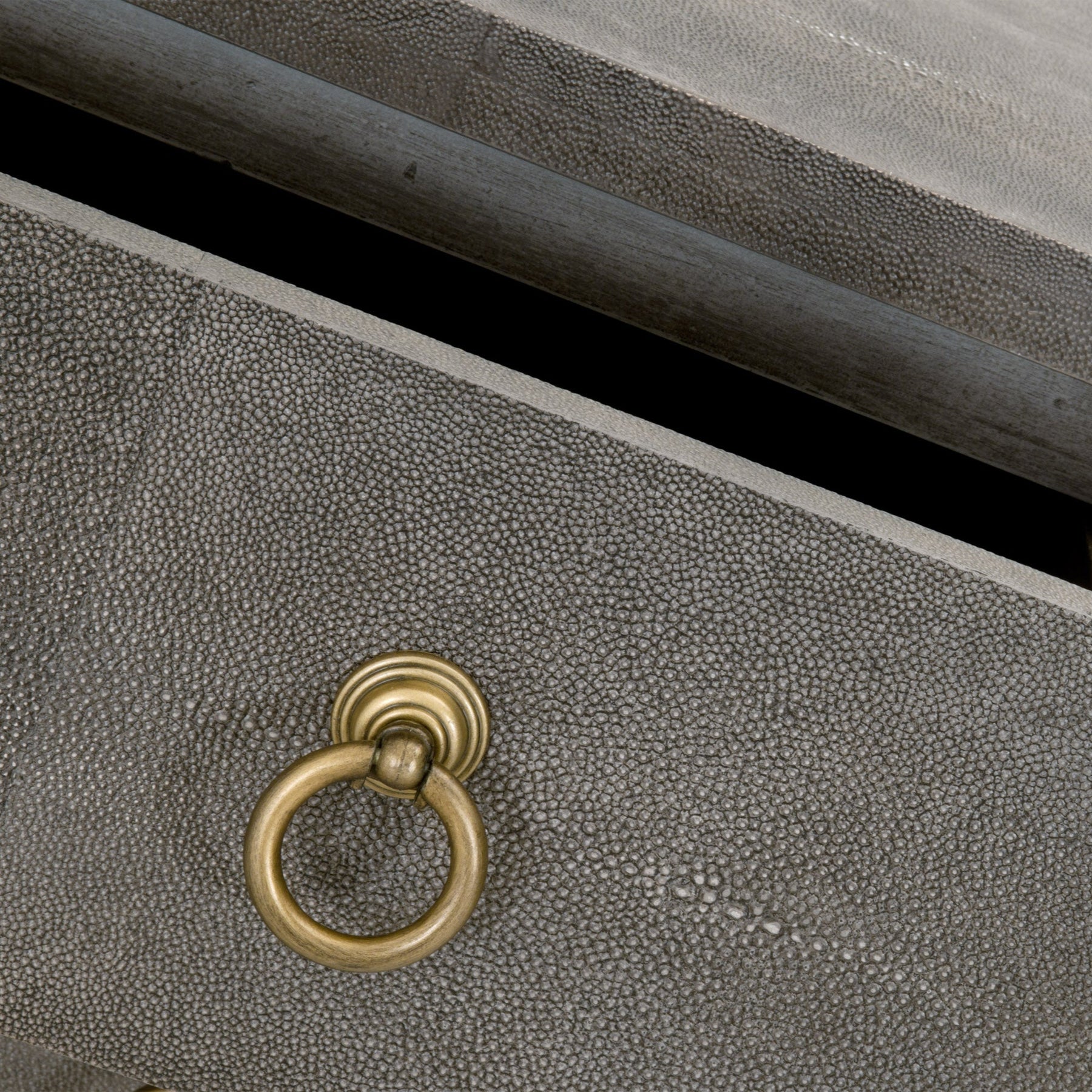 Transitional style nightstand featuring three storage drawers. This gorgeous and one-of-a-kind Strand Shagreen Nightstand will brighten up your bedroom. The unique nightstand mimics natural shagreen skin. Its textured finish is made of a faux shagreen resin on top. Available in Gray or Pearl Shagreen finish with Brushed Gold ring pulls.