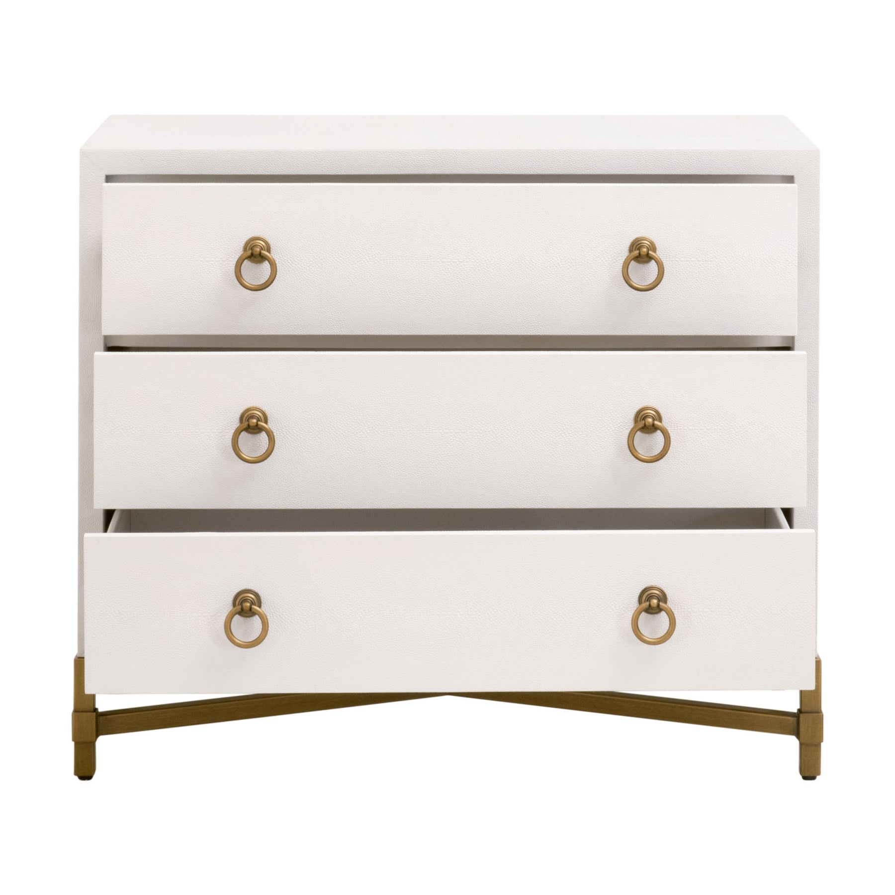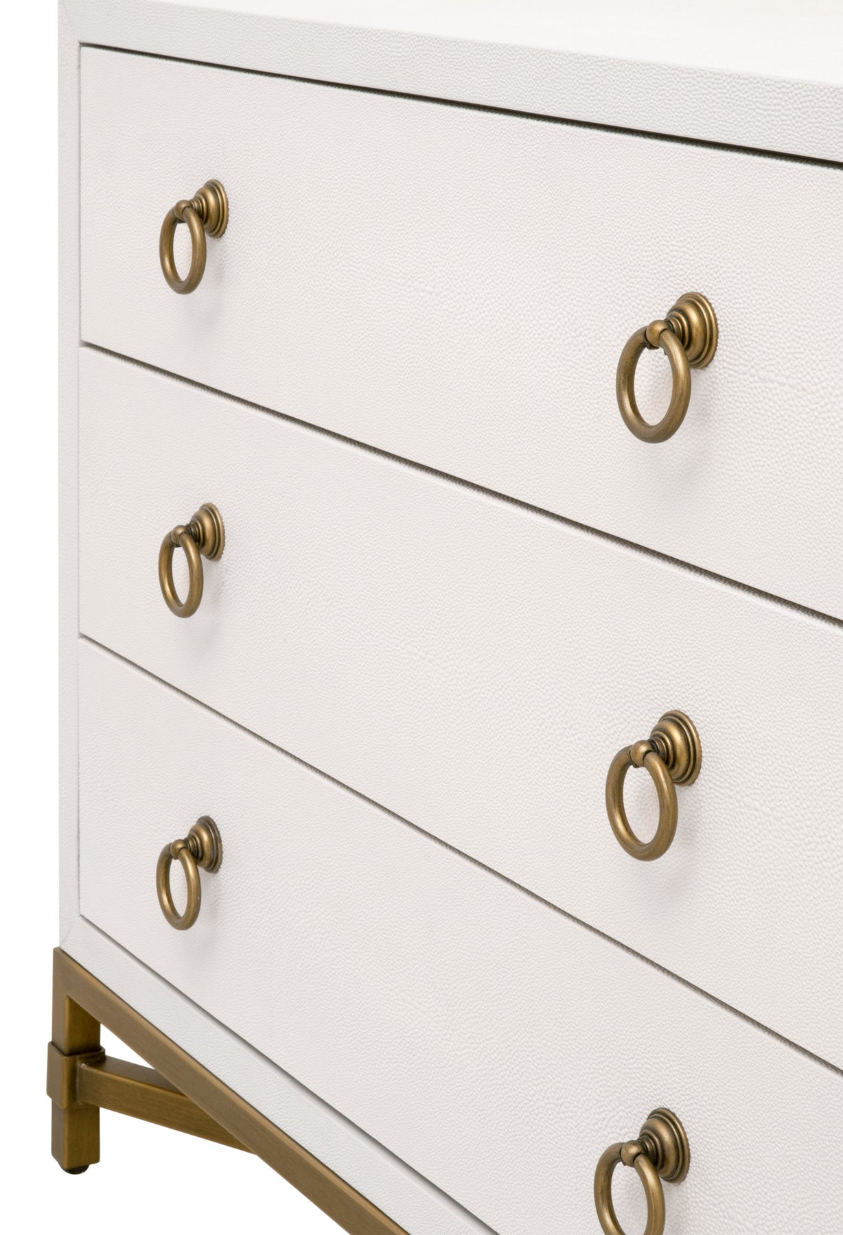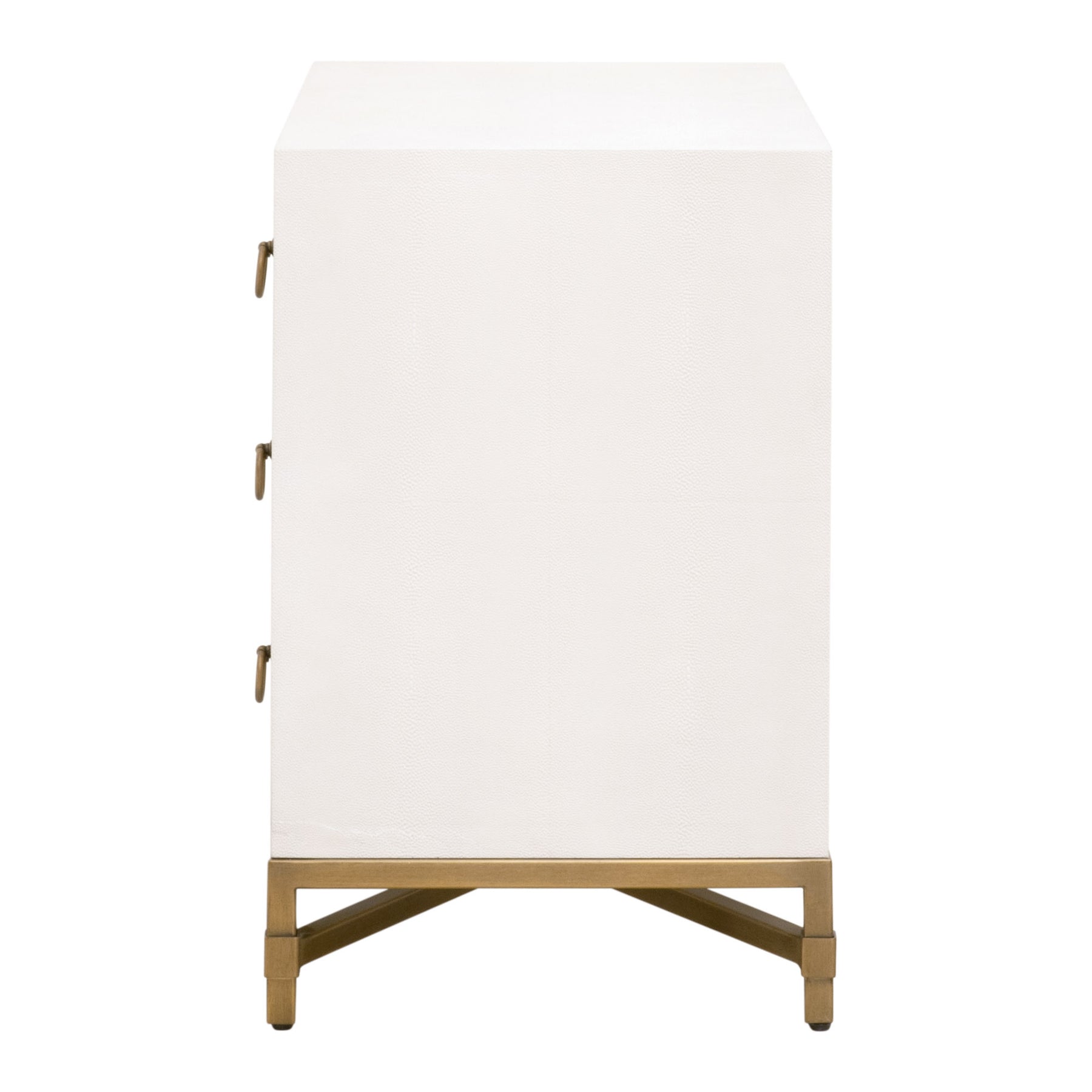 Transitional style nightstand featuring three storage drawers. This gorgeous and one-of-a-kind Strand Shagreen Nightstand will brighten up your bedroom. The unique nightstand mimics natural shagreen skin. Its textured finish is made of a faux shagreen resin on top. Available in Gray or Pearl Shagreen finish with Brushed Gold ring pulls.