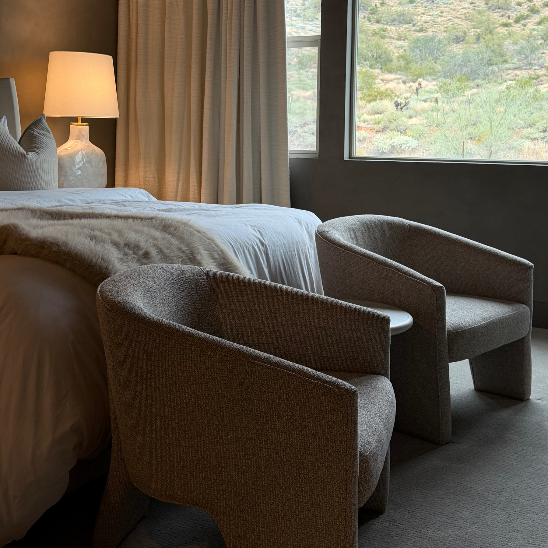 Cozy bedroom with gray armchairs, bed, and lamp.