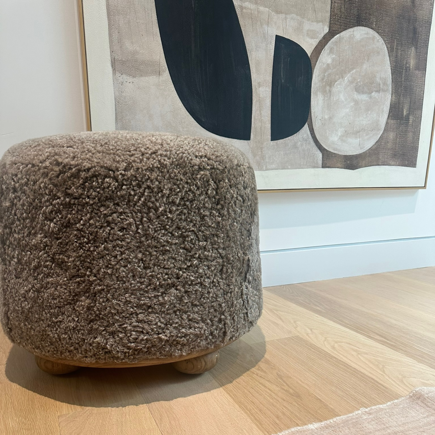 For an extra seat or propped feet, this welcoming ottoman features a subtly tapered shape and a rounded base with oak bun feet beneath. Crafted with soft foam cushioning and upholstered in a poly/wool blend fabric.