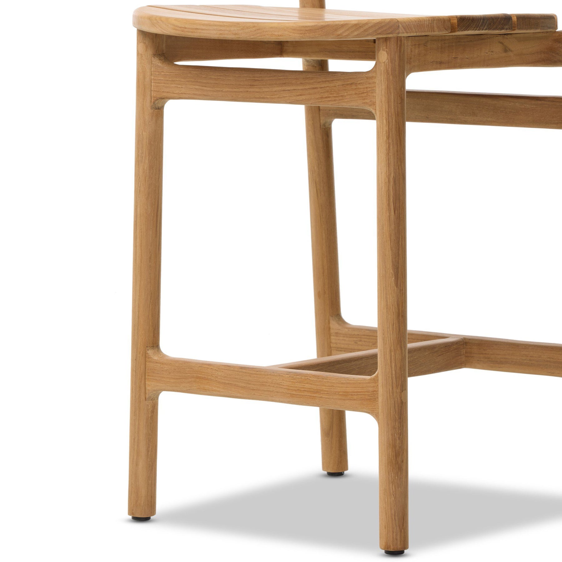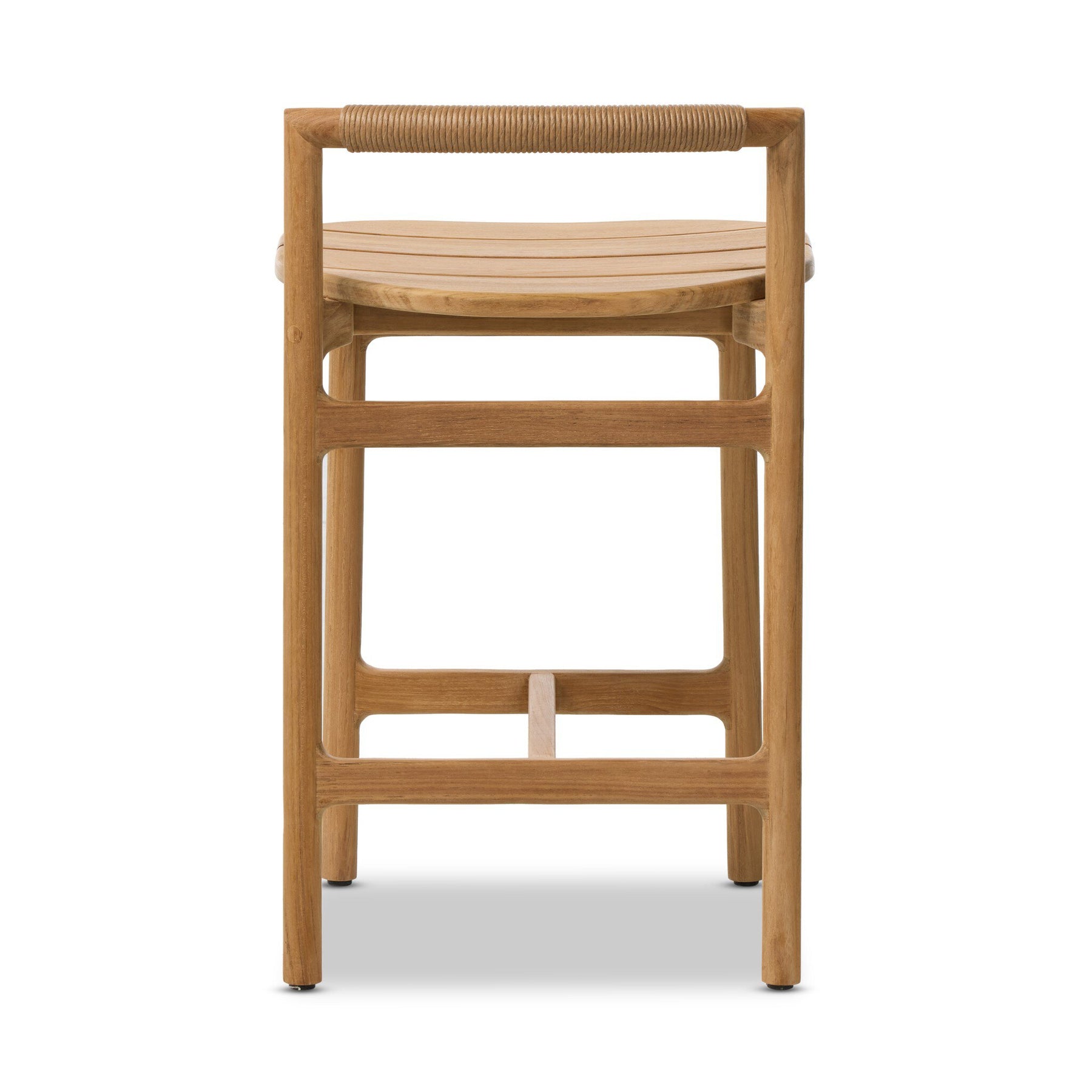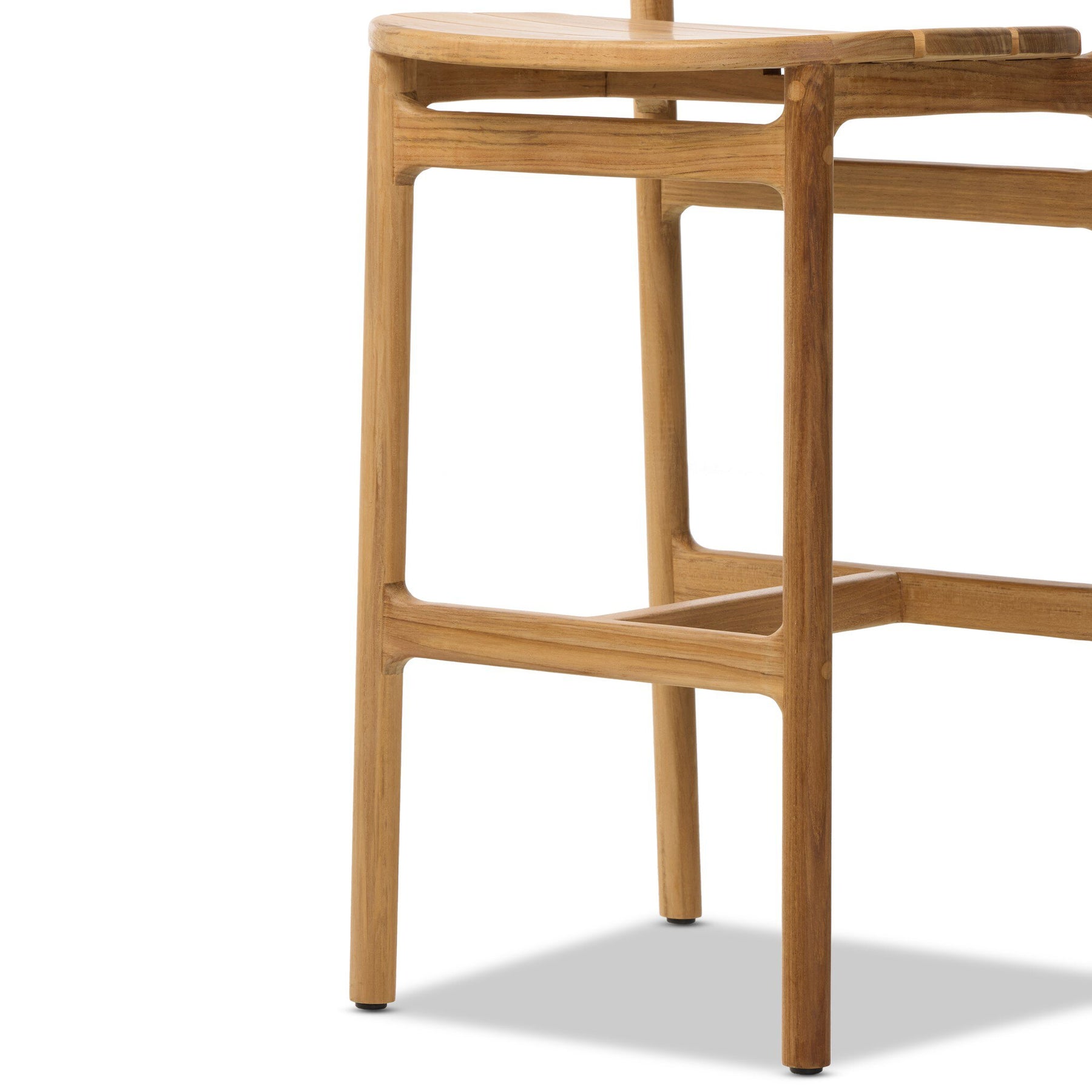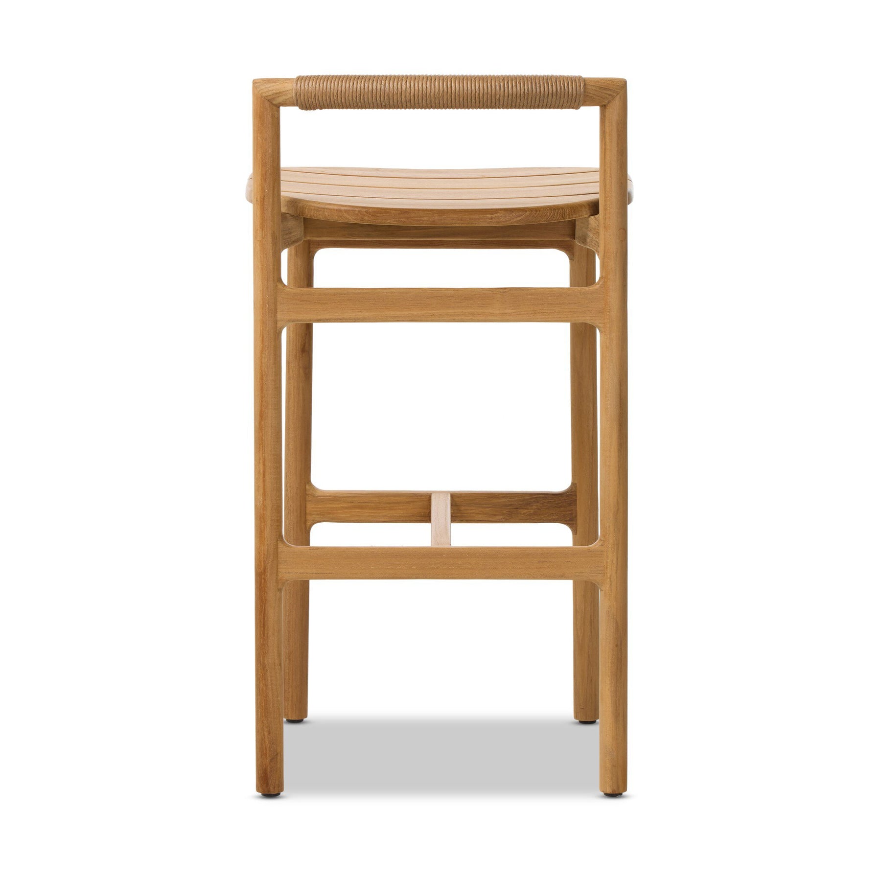 Design-forward with a minimalist FSC®-certified sanded teak frame, this outdoor bar stool features a cushioned seat and a low back with corded detailing. Cover or store indoors during inclement weather and when not in use.