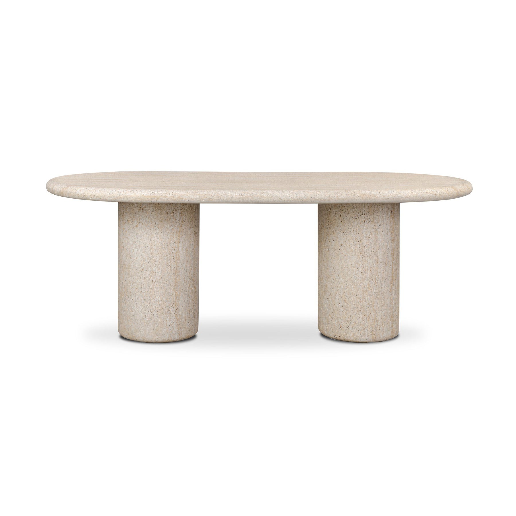 A simple double pedestal silhouette designed to let the material shine. This outdoor dining table features textured sand concrete meant to resemble the variance of natural stone, with a marbled look that's unique to each piece. Cover or store indoors during inclement weather and when not in use.
