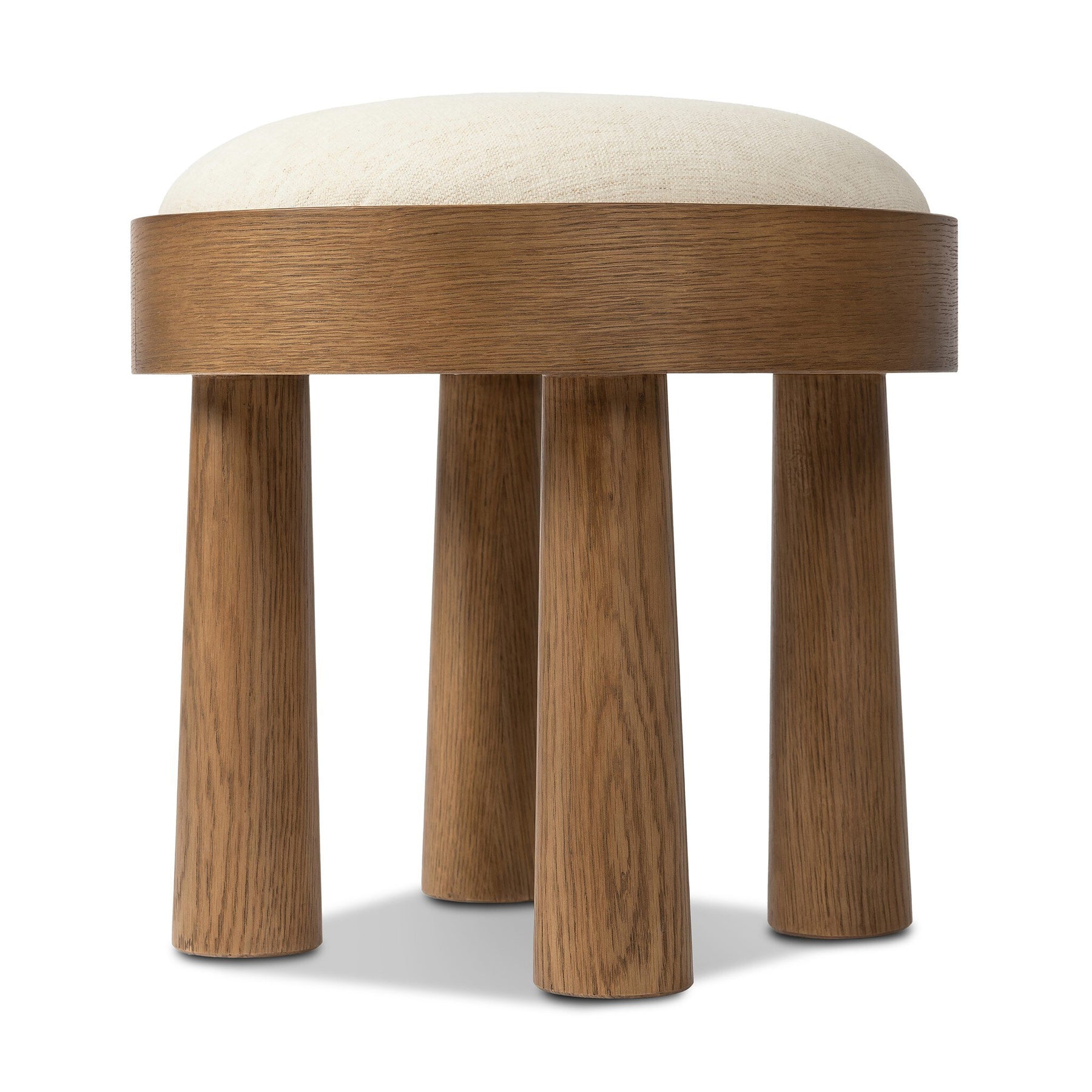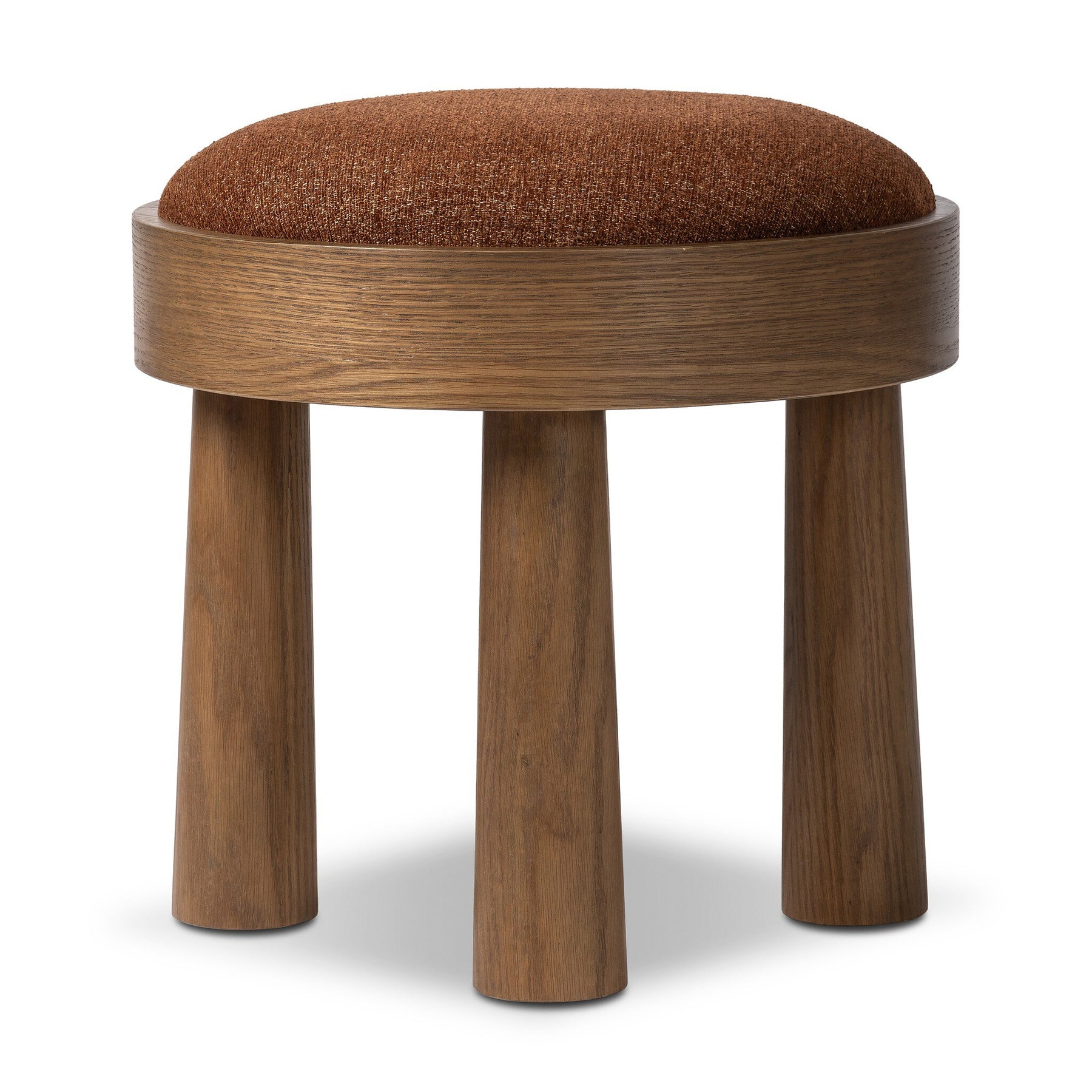 A simple, charming stool with an oak wood veneer finish and upholstered seat. Tapered legs add subtle character.