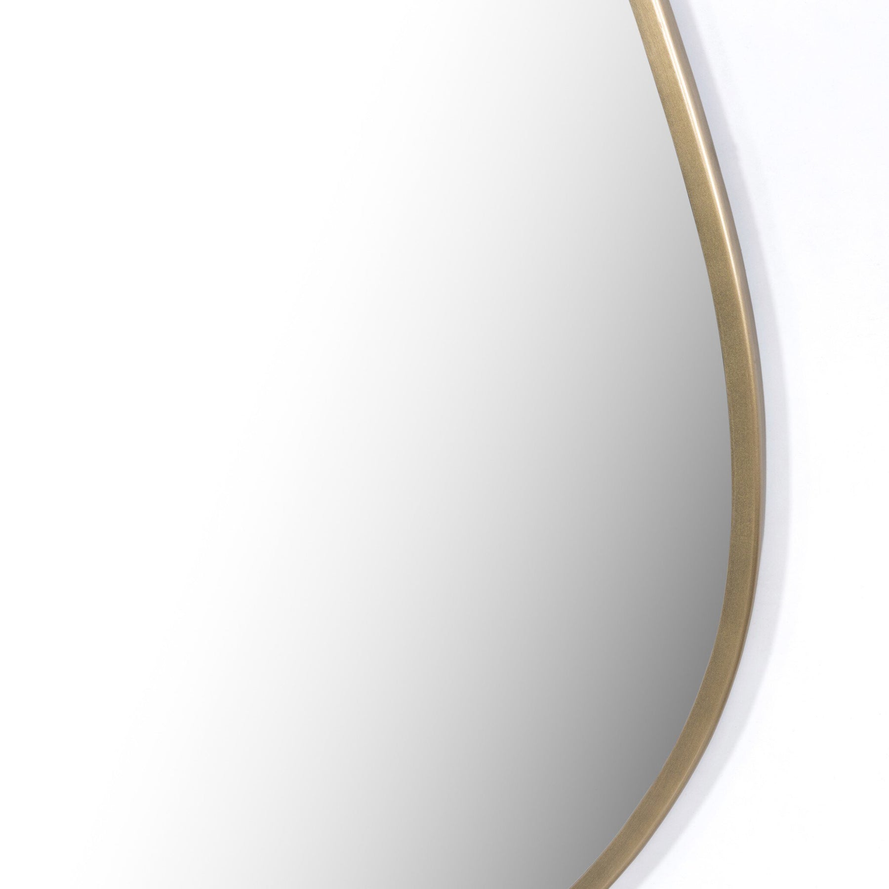 Hand-forged iron with a deep brass finish forms this mirror's frame, showcasing fluid, asymmetrical curves that blend character and texture along its outer edge. The modern swooped form adds a striking visual statement to any space.