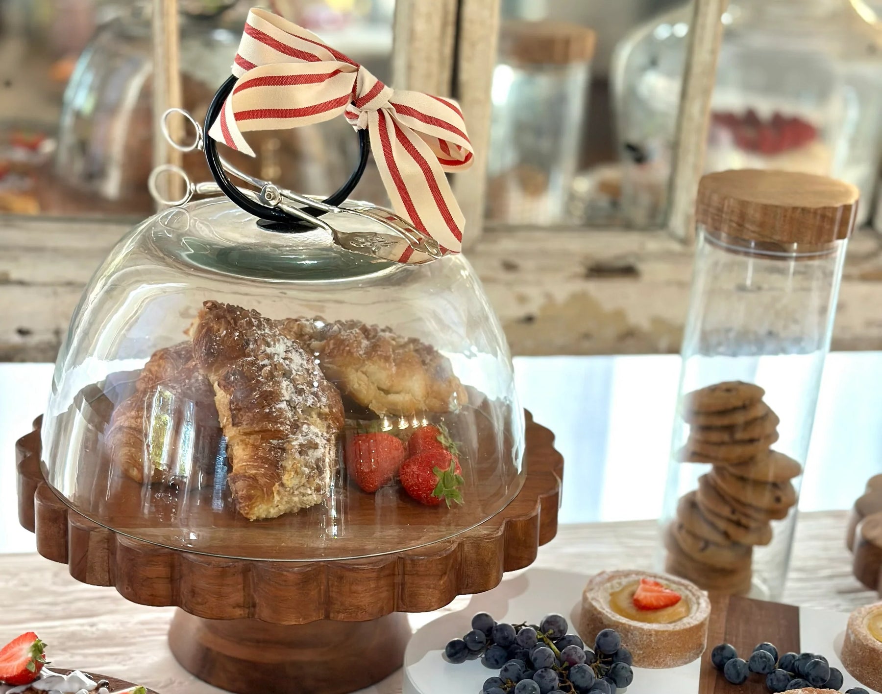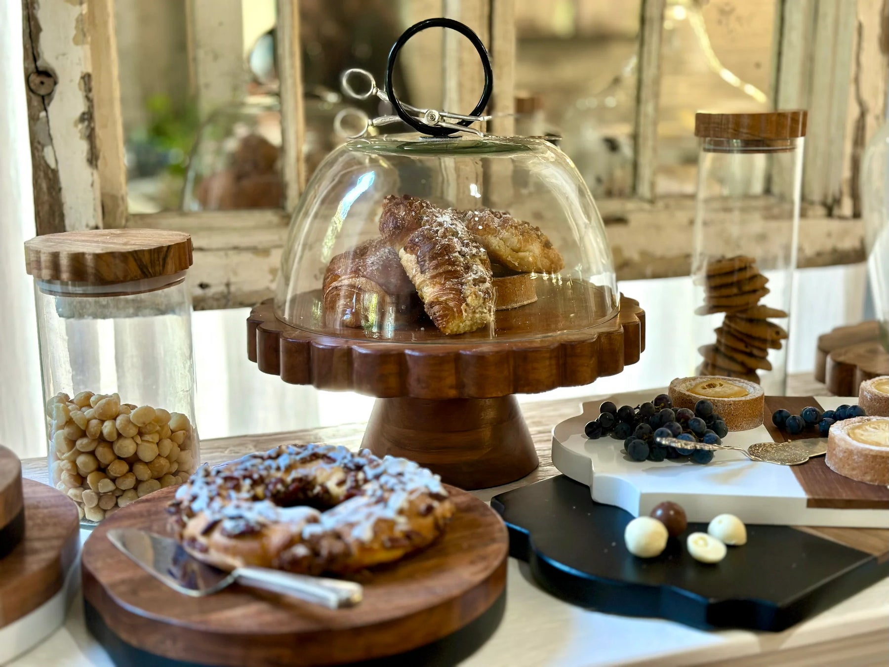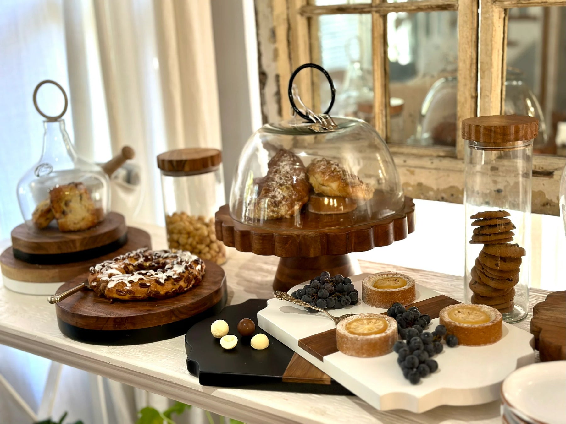 The dramatic silhouette of a classic wine bottle demijohn inspired our Astra Glass Dome. The glass dome is topped with a black or white iron ring handle. This decorative accent is handmade and pairs with serveware like cake stands, trays and trivets for a large array of styles and arrangements.