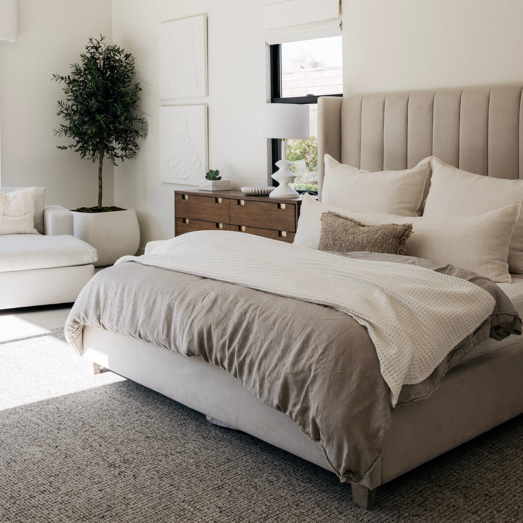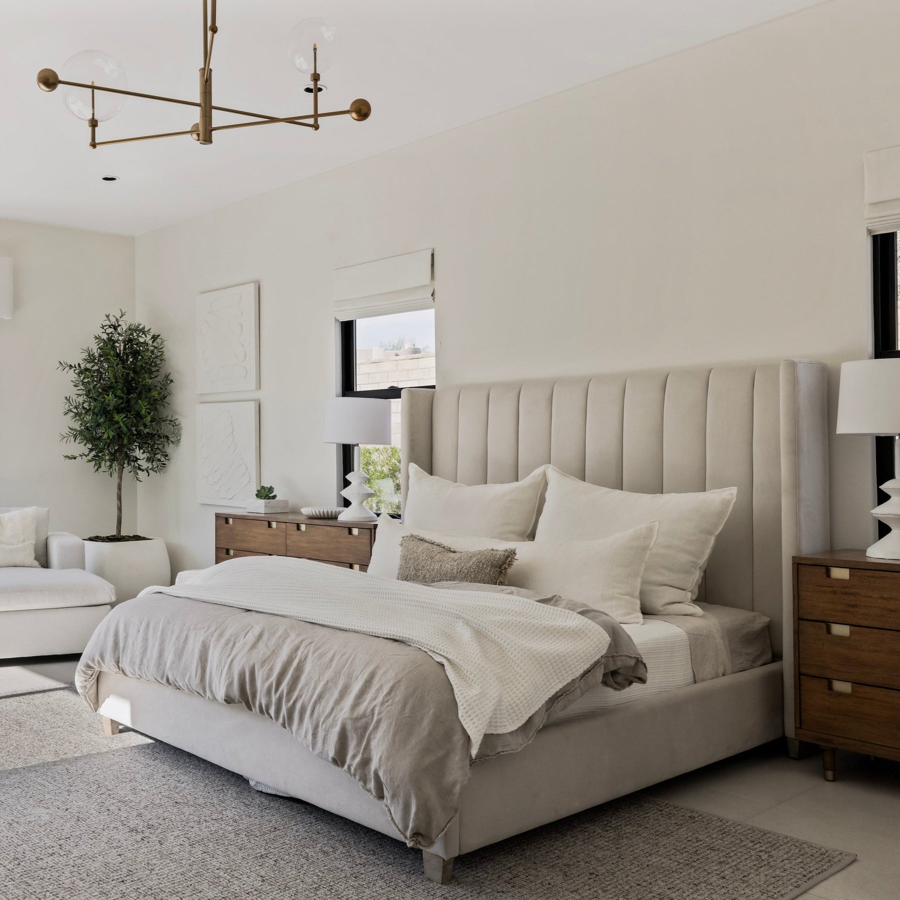 The Chandler Bed adds a touch of elegance to your bedroom with its winged headboard, vertical channel stitching, and edge piping. Its sturdy metal frame with a European slat system supports a box spring, creating a comfortable and inviting space for rest.