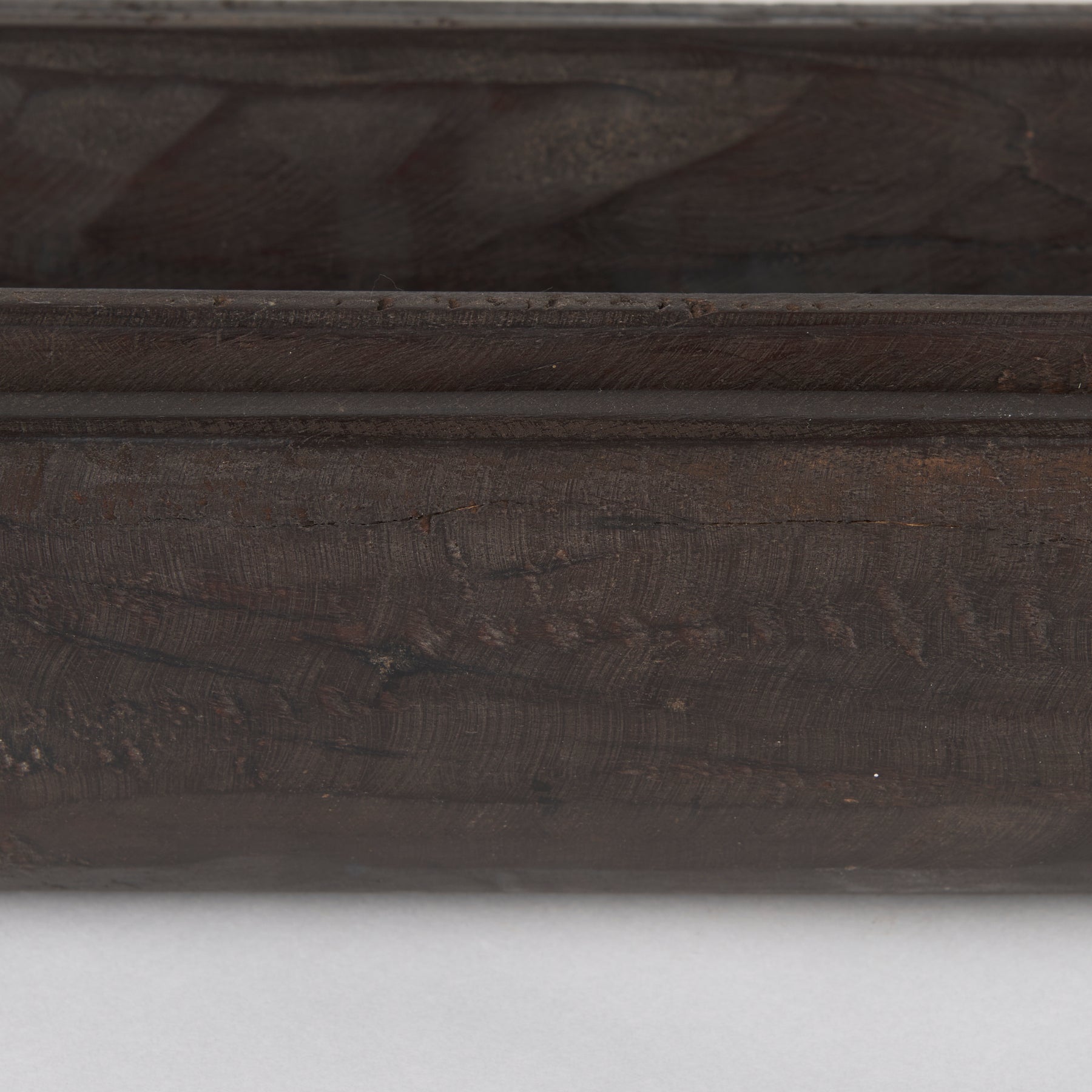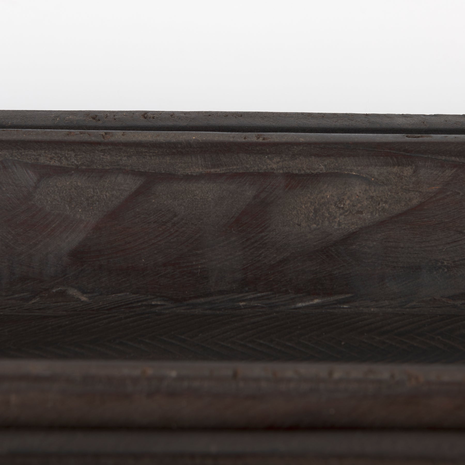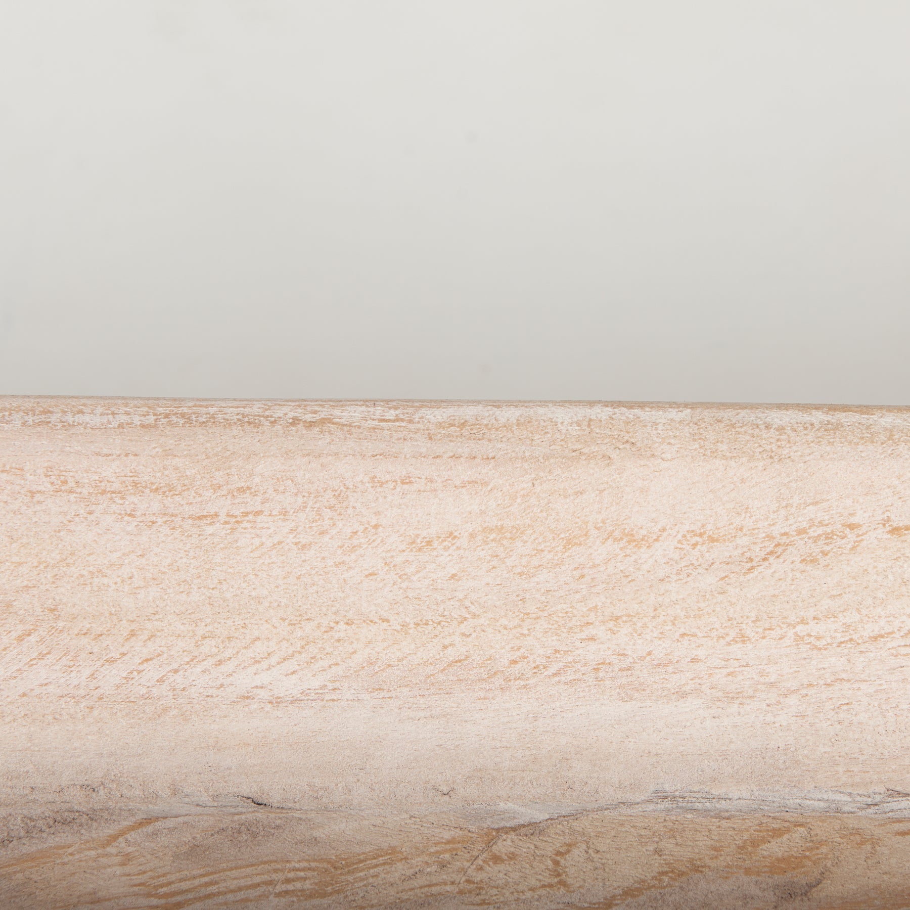 A set of two extra-long trays made of hand-carved reclaimed wood, featuring textured details and available in finishes ranging from pink undertone with a white-wash to rich medium and deep dark brown tones.