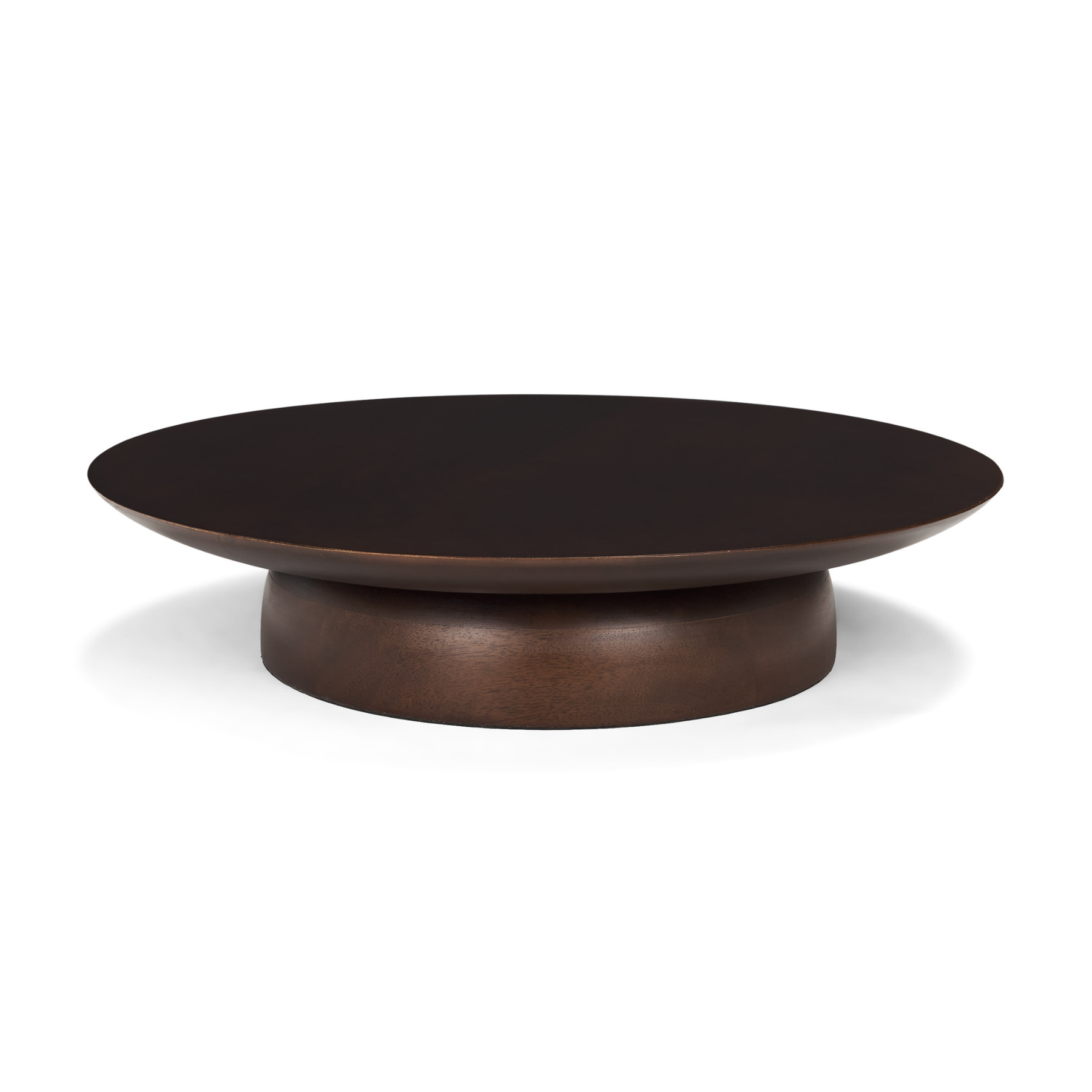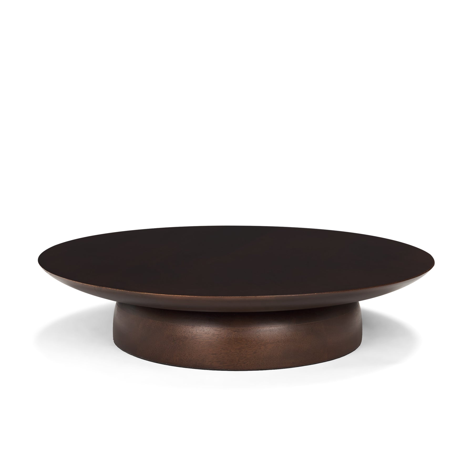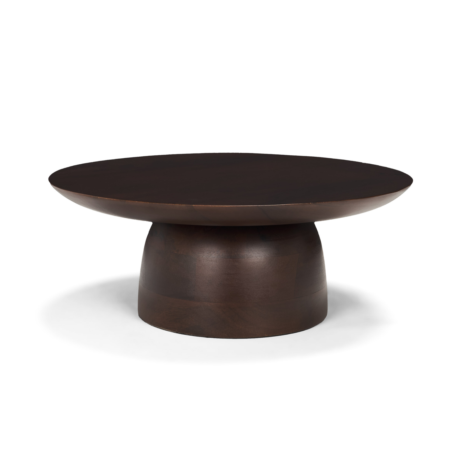 The Sandra is a contemporary round riser made from solid wood in a warm mid-brown finish, elevated by a sculptural pedestal-style base.