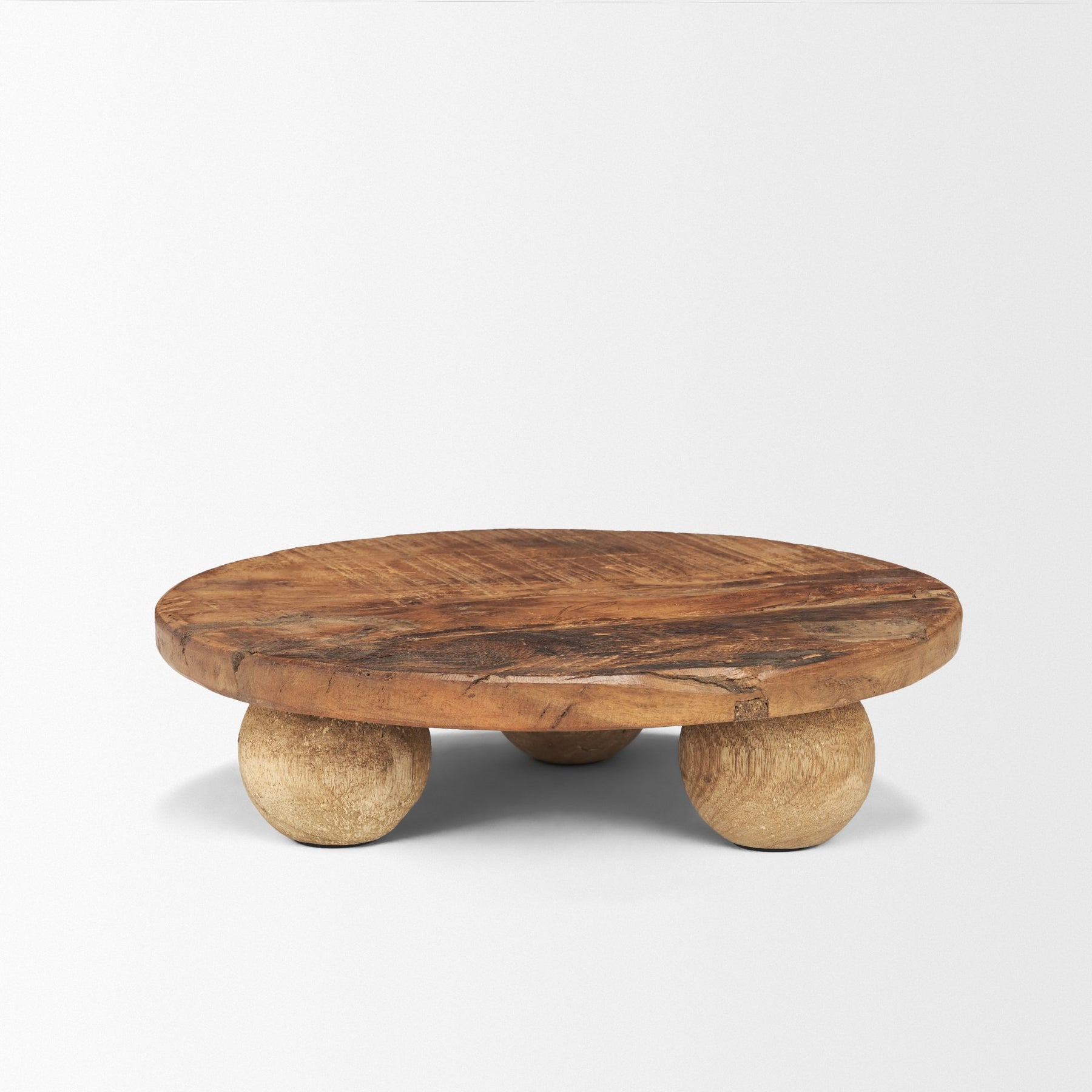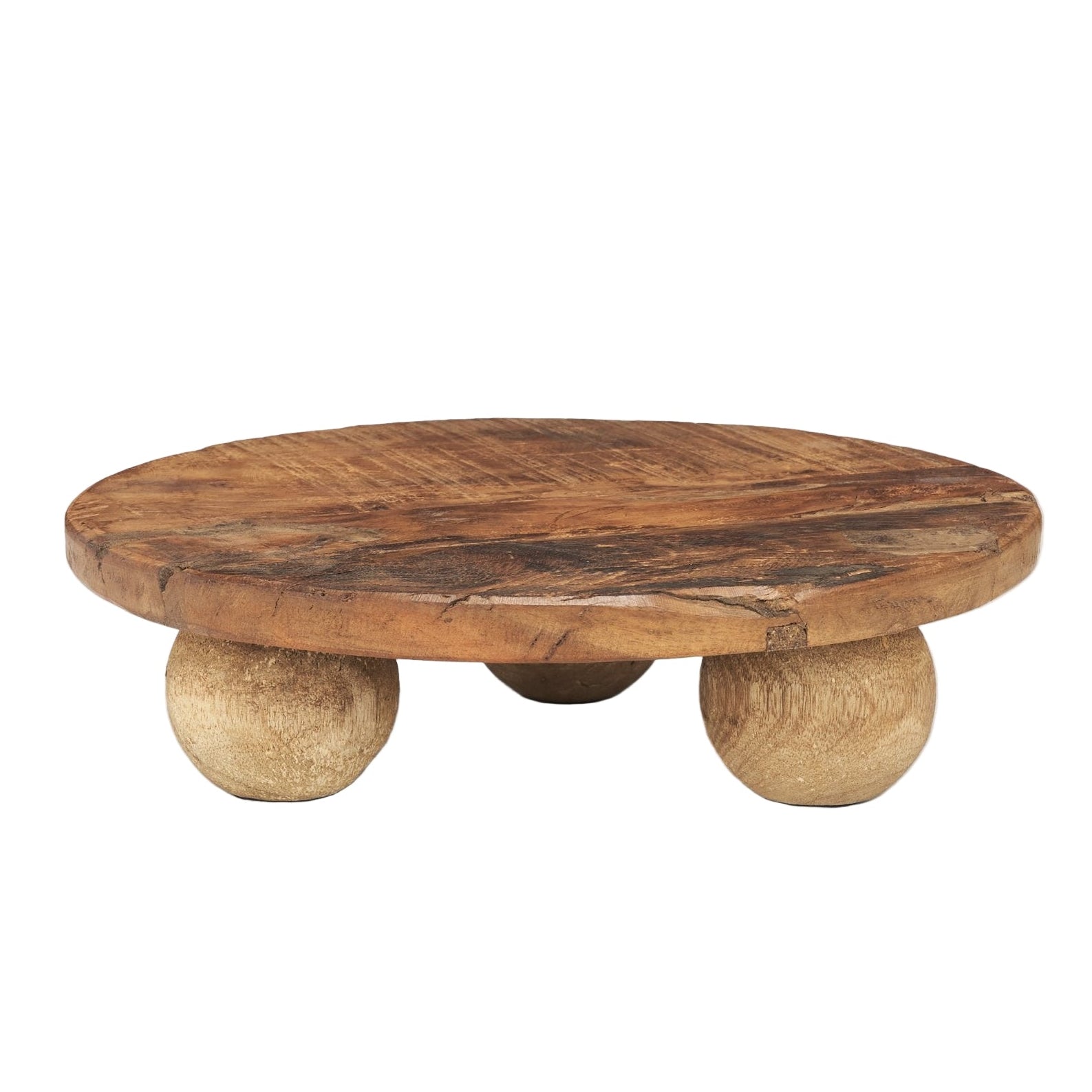 The Zara Tray is crafted from solid reclaimed wood in a natural finish, featuring a round top set on sculptural ball feet.
