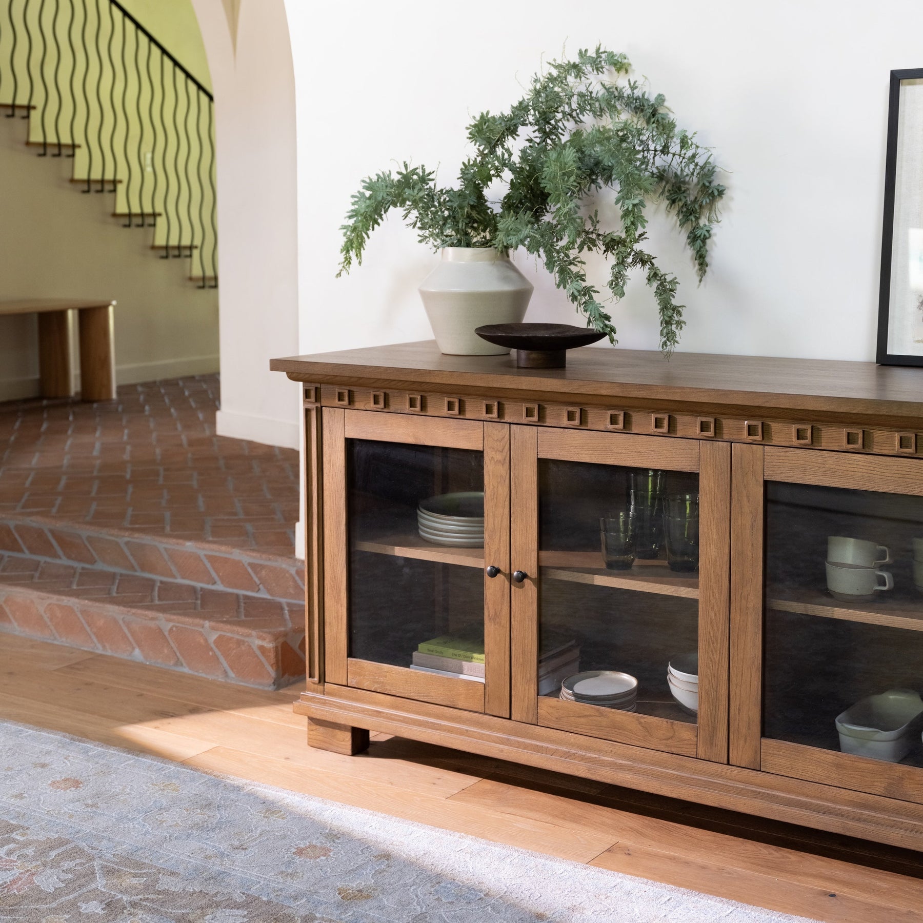 Your good taste, on display. Lila puts a fresh face on tradition. Crafted from solid ash with a rich wood grain and warm mid-tone finish, it pairs crisp lines with molding details that feel classic. Four glass-front doors let your dinnerware, vintage finds, or everyday essentials shine, while blackened bronze handles bring in just the right contrast. It’s a timeless piece with a clear view.