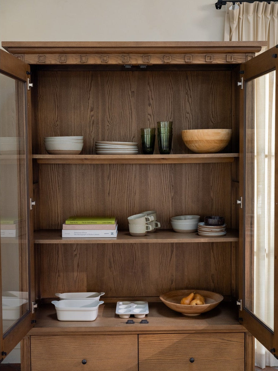 The Lila makes storage feel elevated. Framed in solid ash with glass doors, its tall silhouette pairs traditional molding with a warm brown finish. Inside, removable linen-textured drapery softens the display or can be taken out for a crisper look. Blackened bronze handles open to three shelves above and two deep drawers below—showcase up top, hideaway down low. A timeless piece designed to balance form and function.