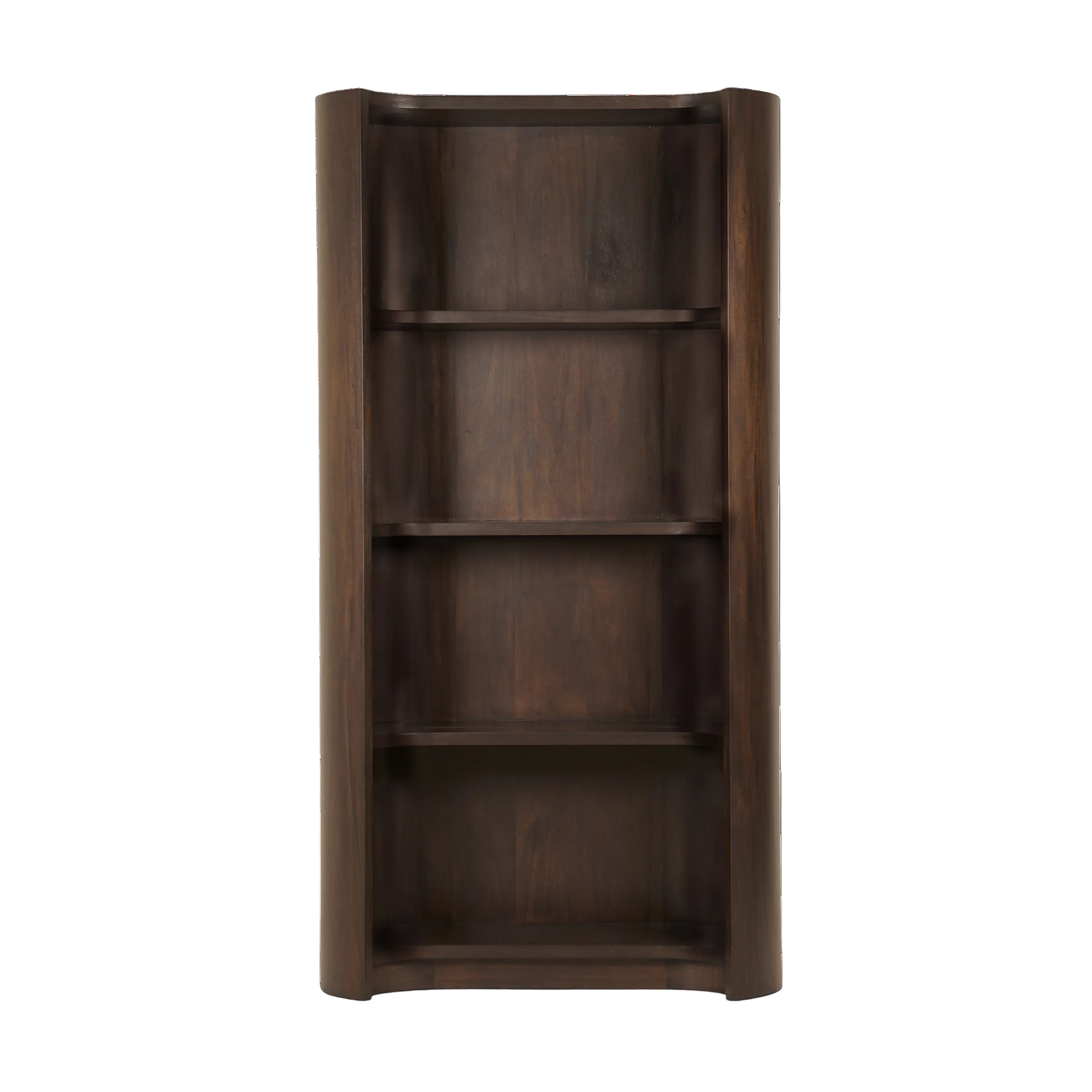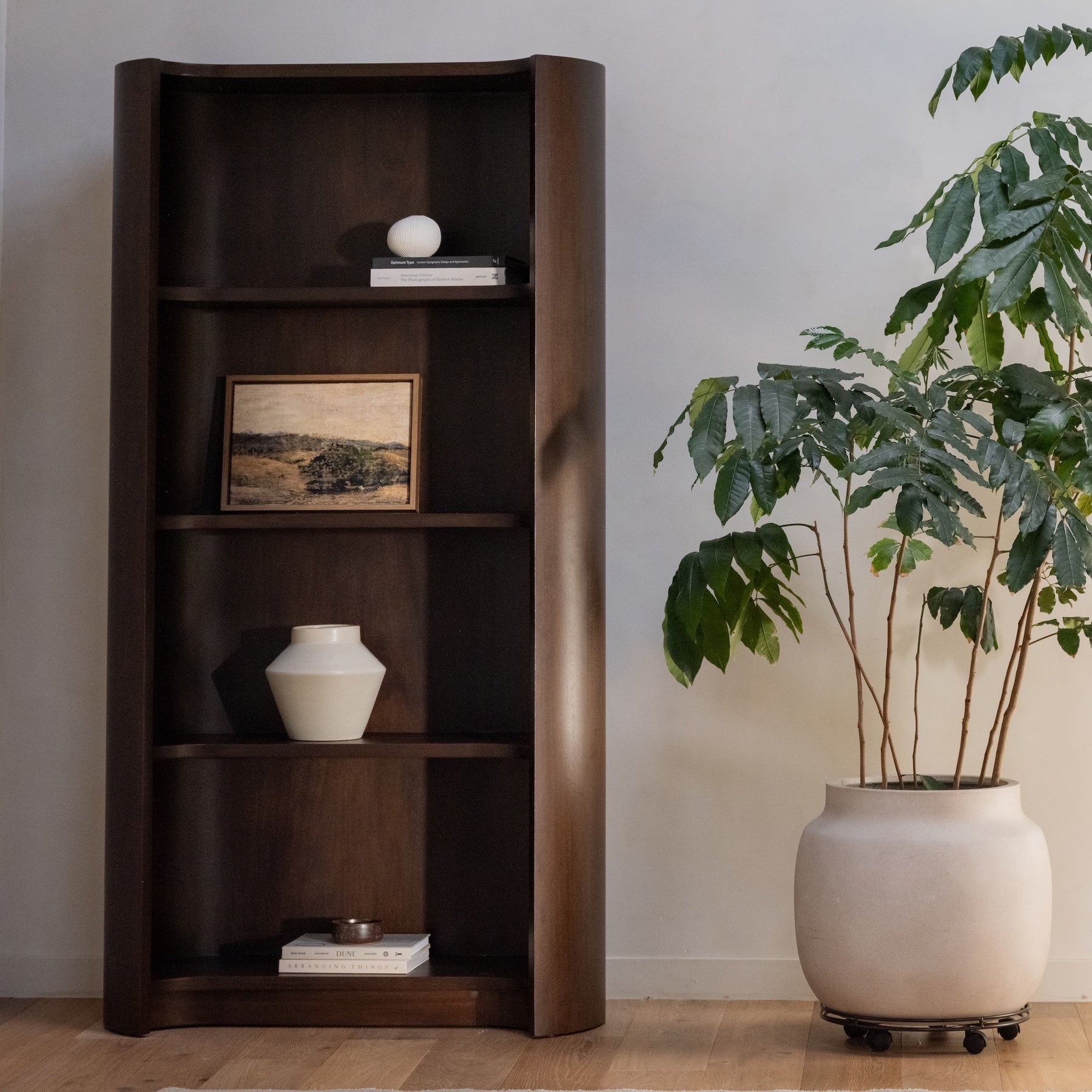 Storage that deserves to be displayed. Nero softens the standard bookshelf silhouette with sculptural curves and a warm mahogany finish. Rounded sides and gently arched shelves mirror each other for a cohesive, elevated look. With four spacious tiers and a design that feels just as thoughtful empty as it does filled, it’s functional, foundational, and totally shelf-assured.