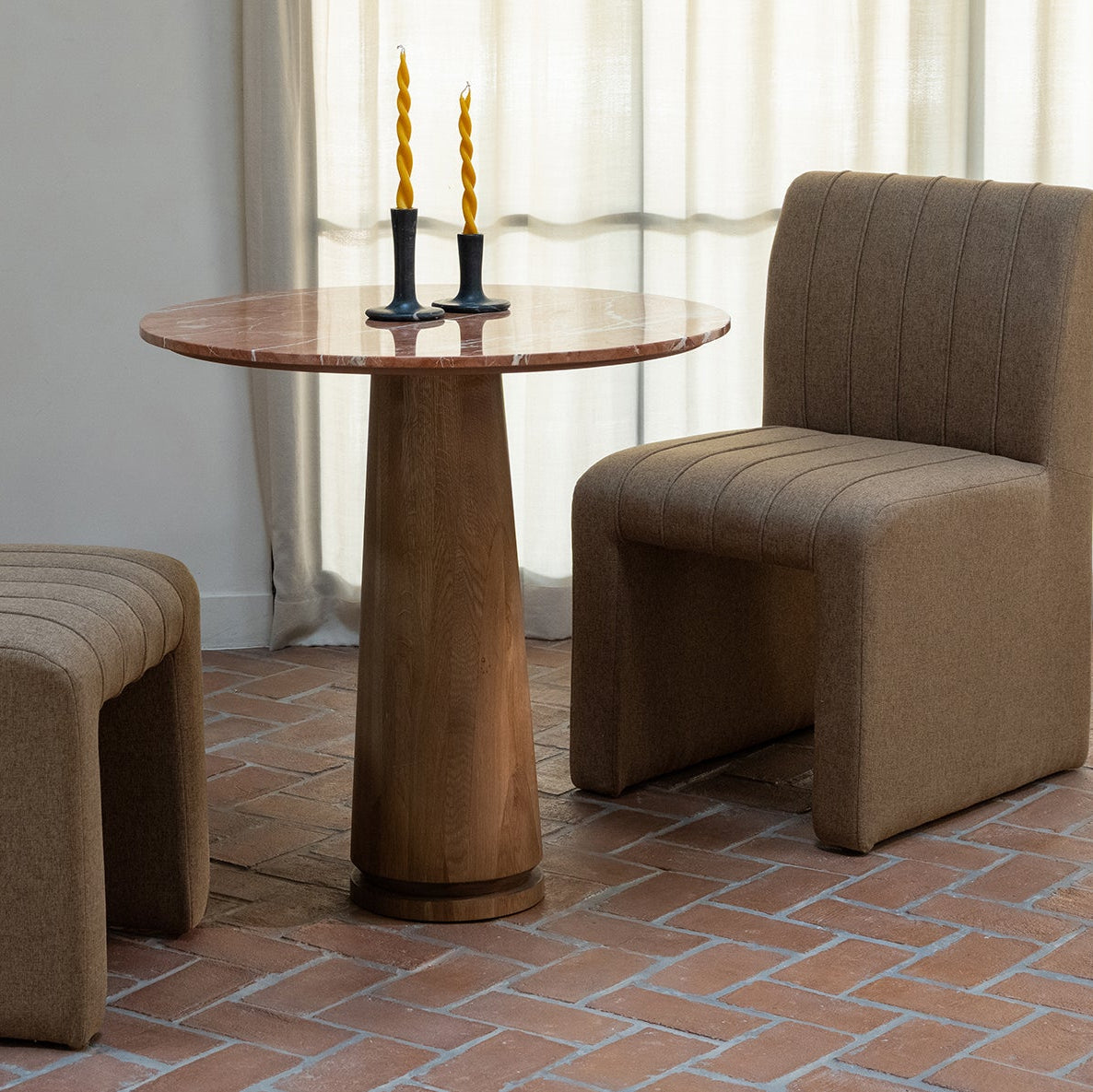 Soft stone, solid impression. Paige balances polish and warmth like it’s second nature. A smooth Cosmos marble top sets the tone with soft beige veining, while the sculpted oak pedestal base brings the craft. Subtle carving at the base adds a touch of detail to ground the shape—and catch the eye. Natural materials, modern proportions, and made to make an entrance.