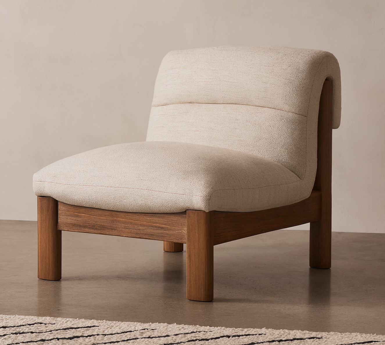 Folded to get noticed. Piers leans into ’70s spirit with its low profile, armless frame, and tufting. The fold over detail softens the structure, giving it shape and slouch in equal measure. Wrapped in a flecked fabric, it brings contrast with a solid wood base that keeps it grounded. The kind of seat that says, “stay a while”—and means it.