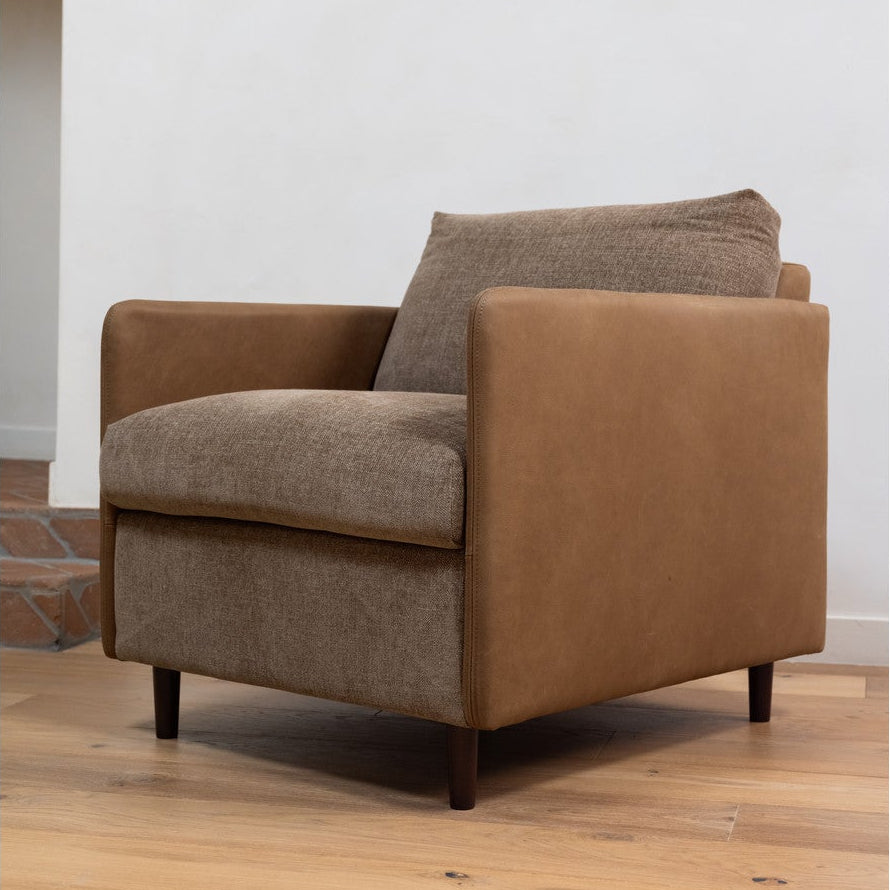 A little retro, a lot modern. The Tella Chair layers flecked fabric with top grain leather wrapping the arms and back for a tonal brown contrast. Cushioned with foam, fiber, and faux feather fill, the seat is soft yet supportive. Slim rubberwood legs lift the look with mid-century ease. A study in balance, Teller shows how mixed materials can be both vintage-inspired and refreshingly new.