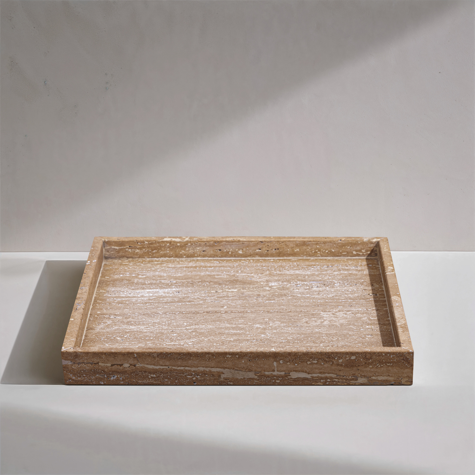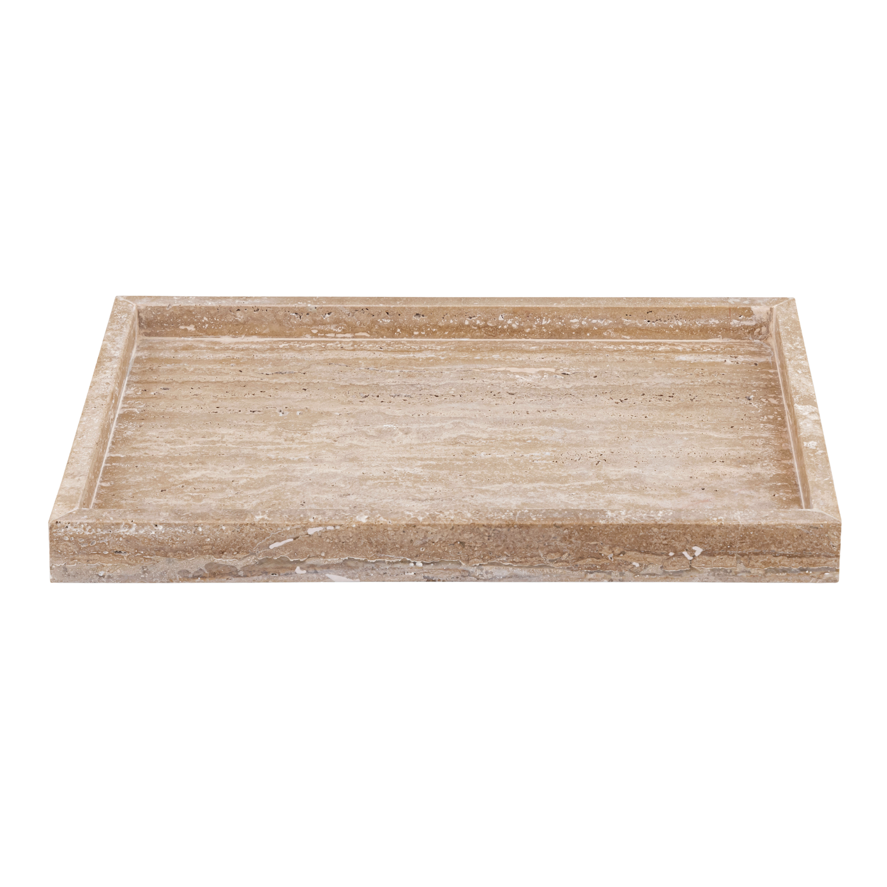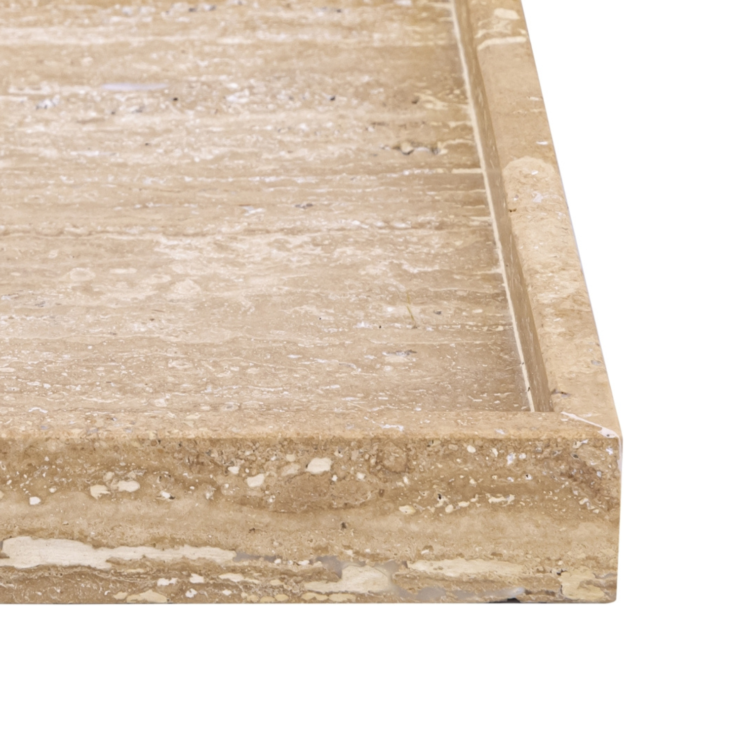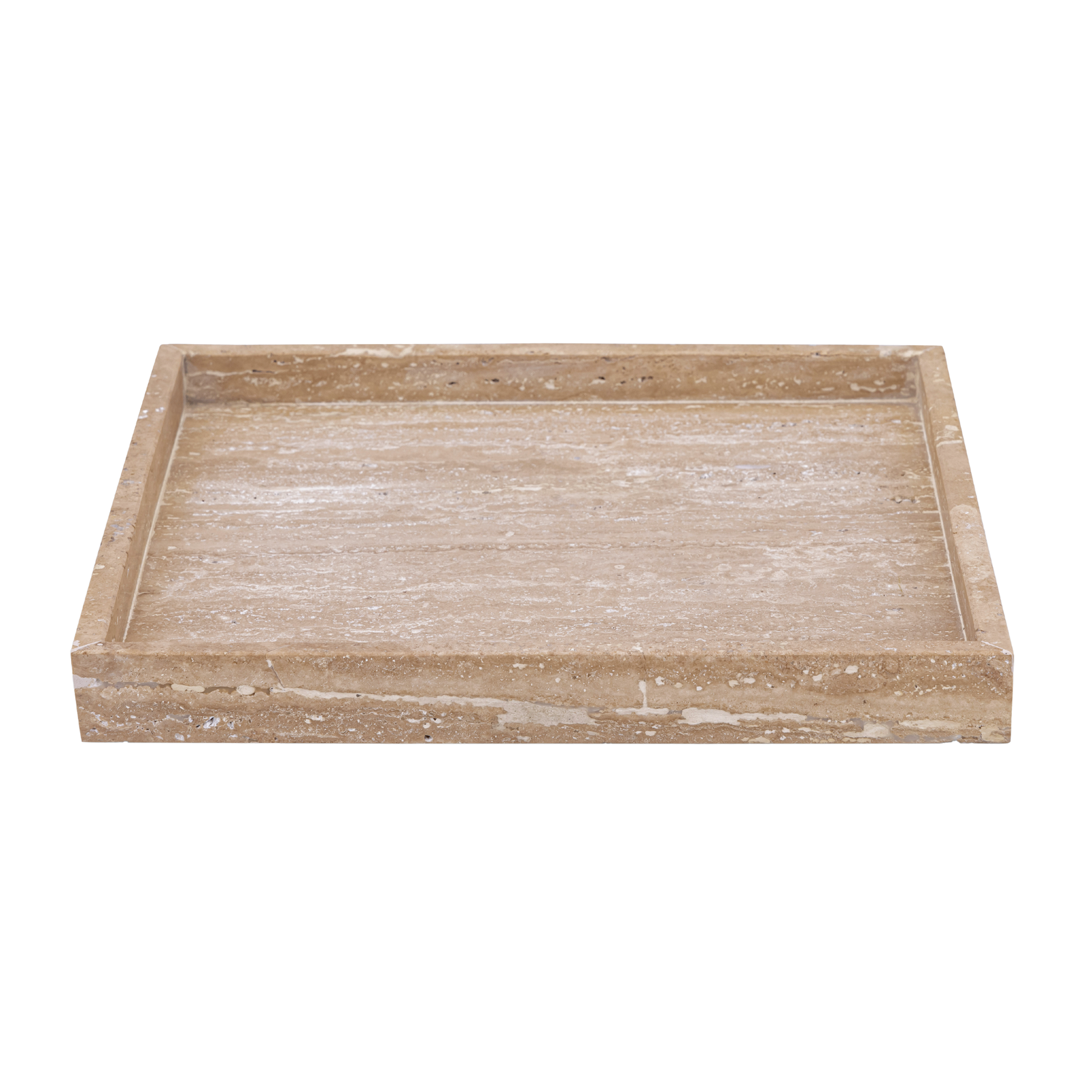 Beige travertine brings depth and refinement to the Elluna rectangle tray, a sculptural tabletop accent with sharp edges and timeless charm. Each tray features its own distinct texturing, making every piece naturally one-of-a-kind.