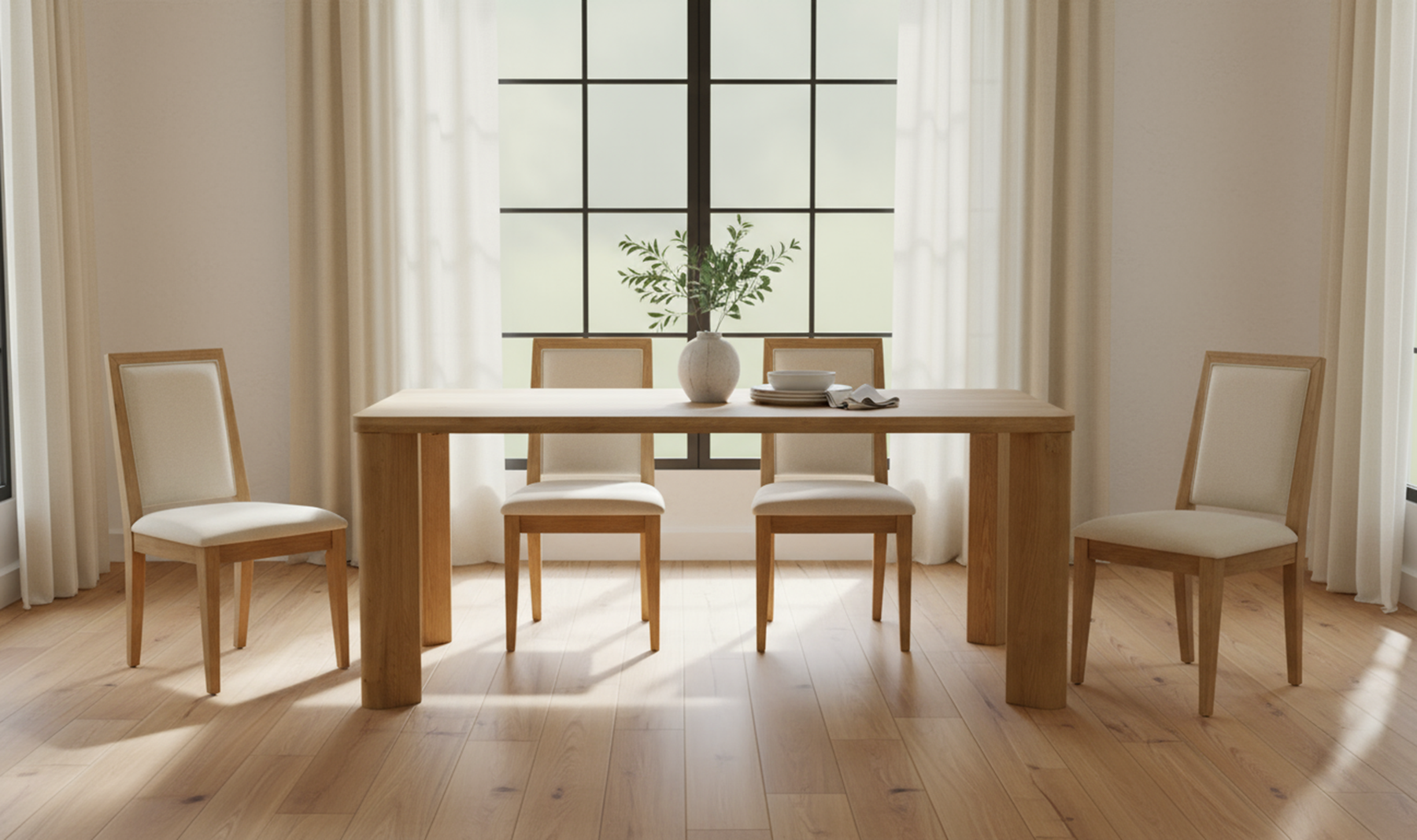 Framed to feel familiar. Adair keeps tradition comfortable. A high back, plush seat, and wraparound solid wood frame offer supportive ease with a refined feel. The exposed wood adds structure, while a small gap between the seat and back keeps it light. Wrapped in warm beige with a wire-brushed finish, it’s all about quiet charm.