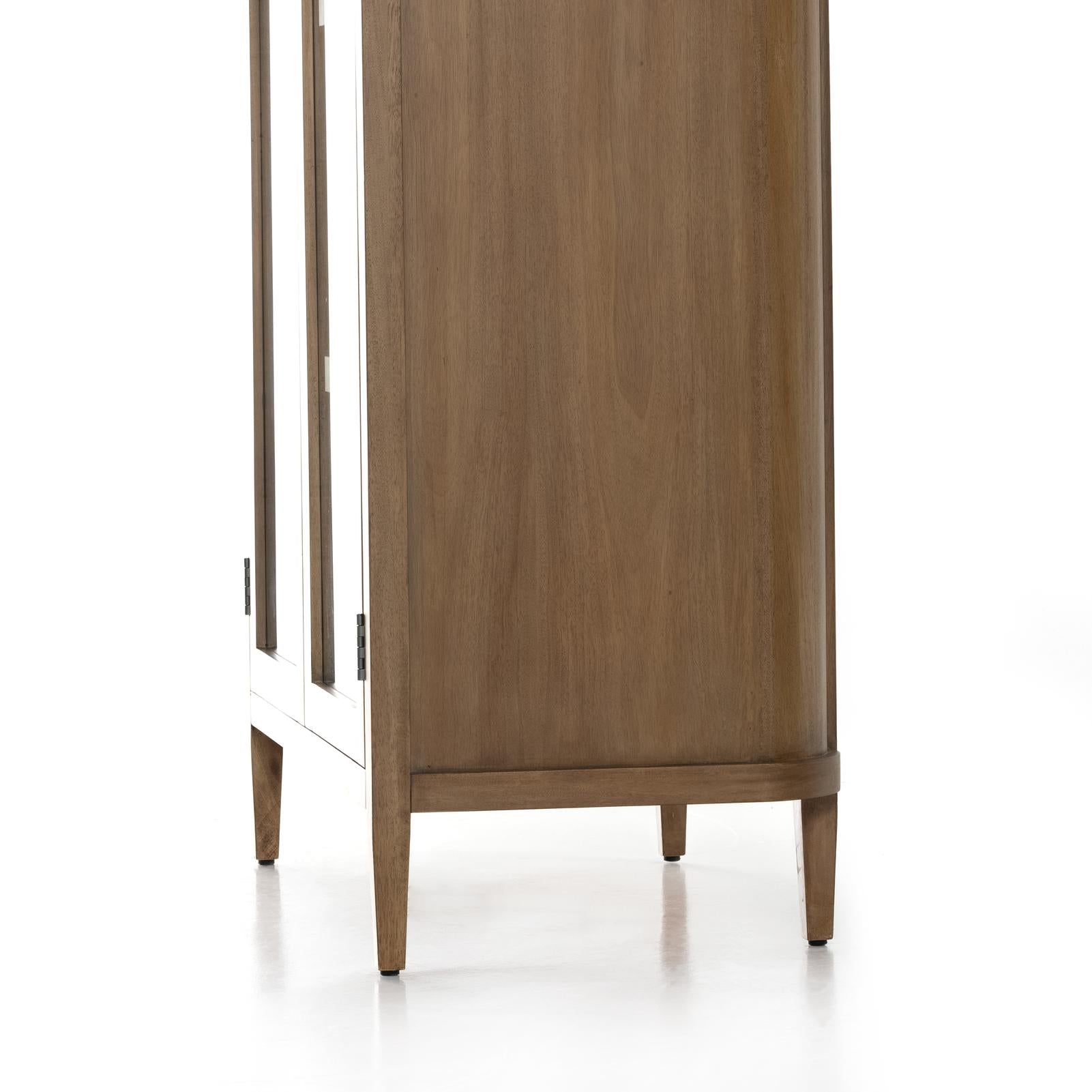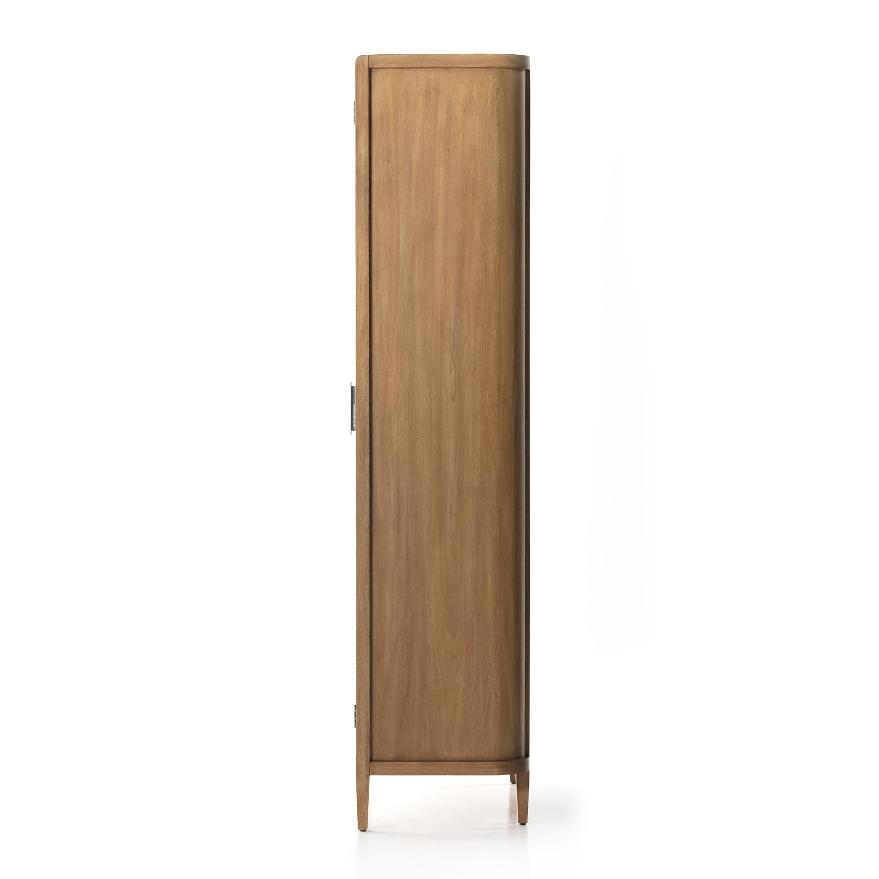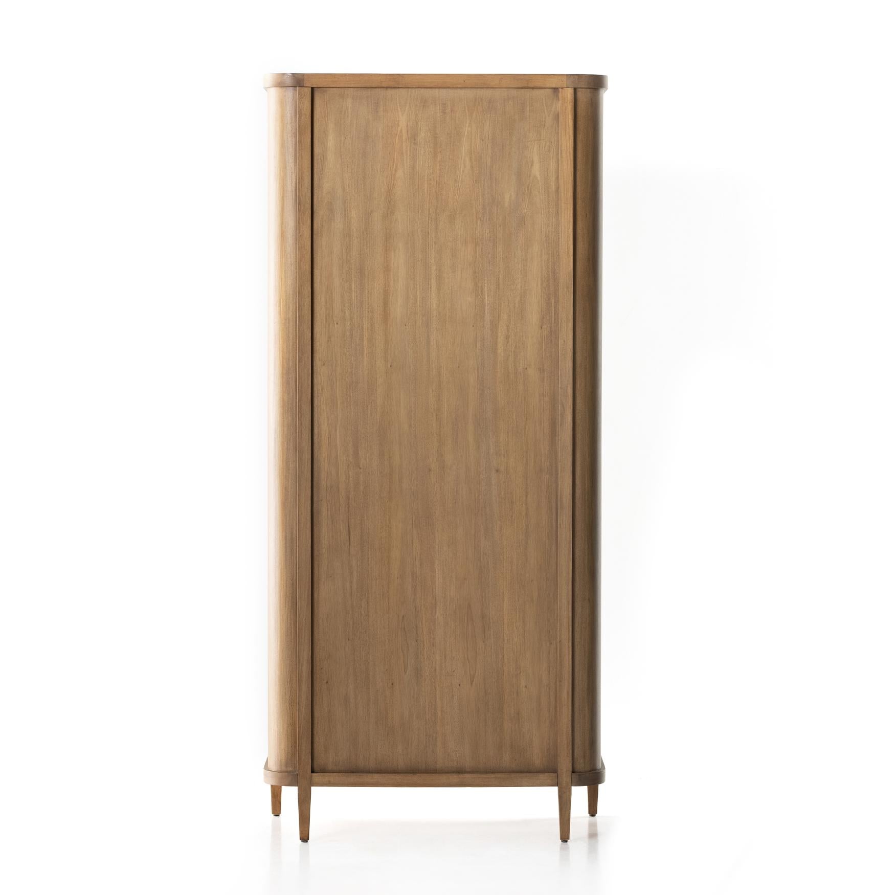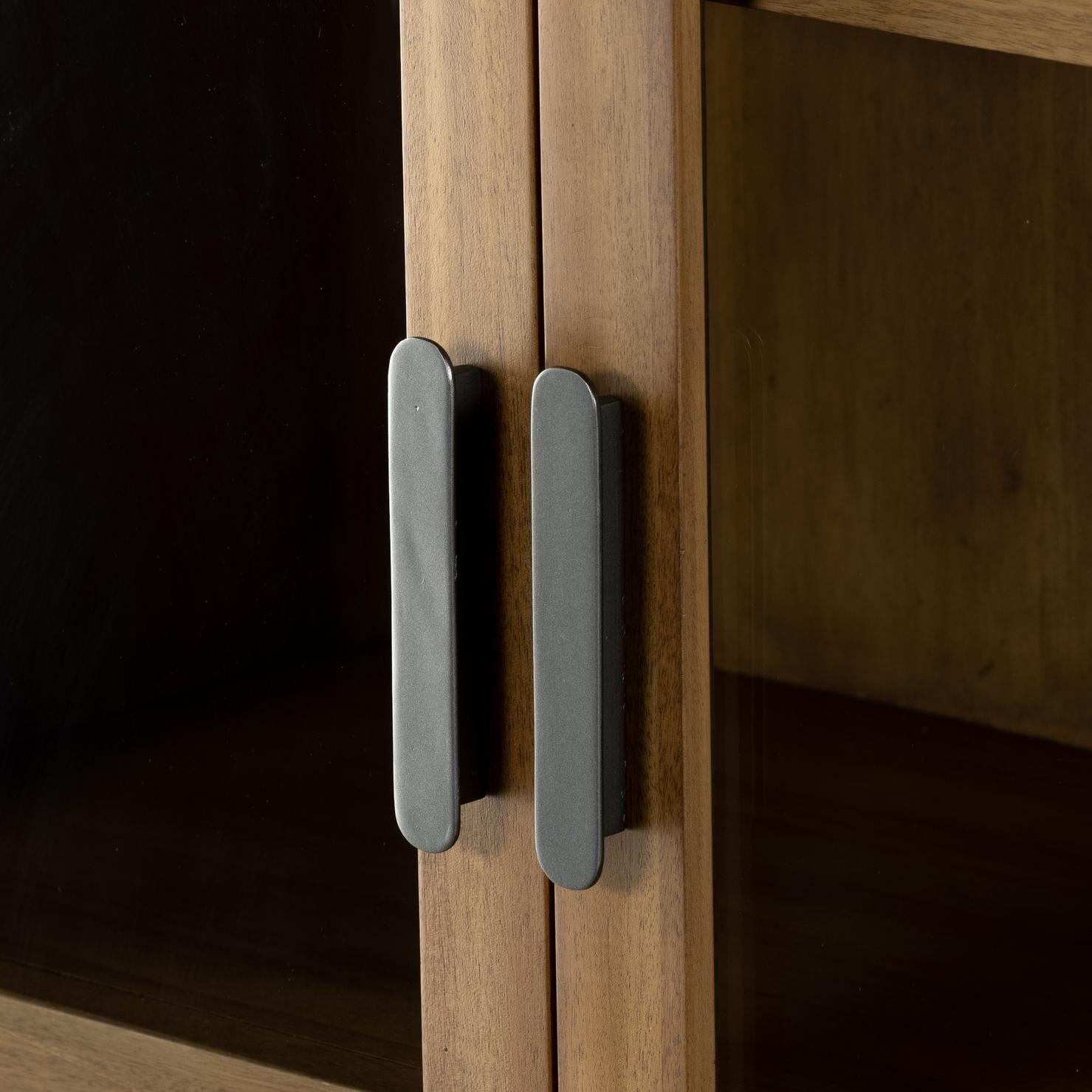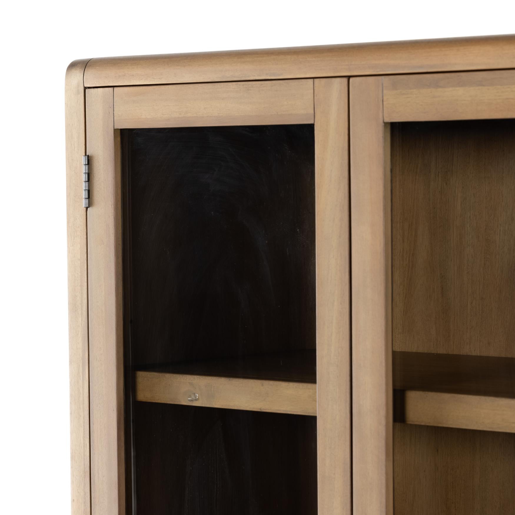 A light, clean storage look inspired by Japanese tea houses. Crafted of aged natural oak with cross lap joinery, lower shelving brings even more storage to the whole piece.
