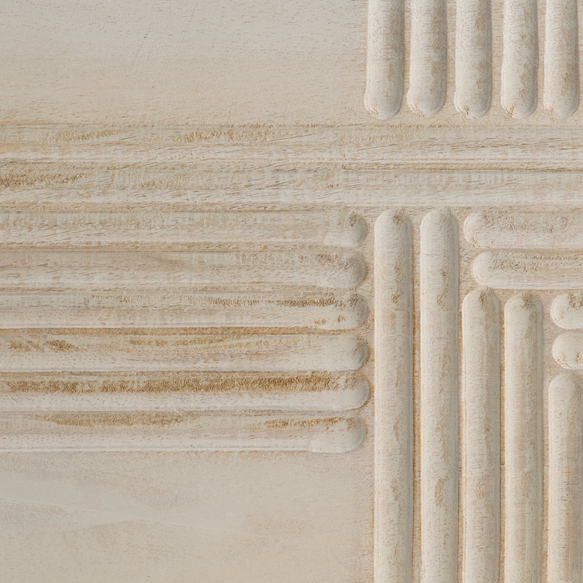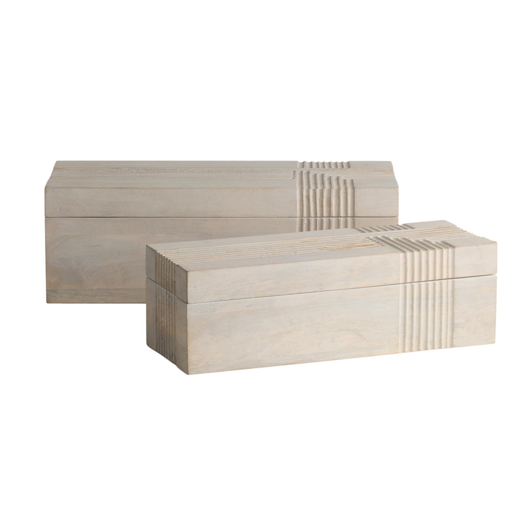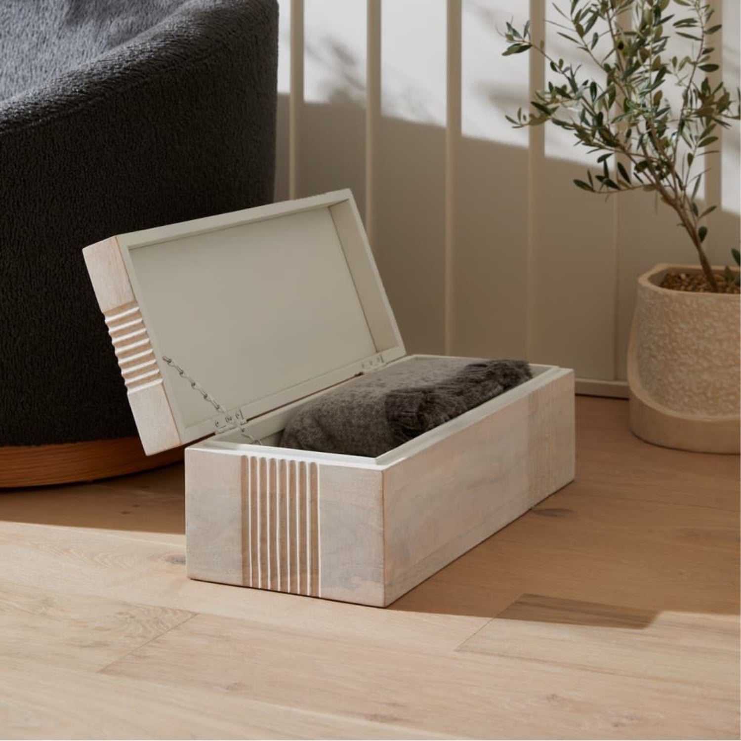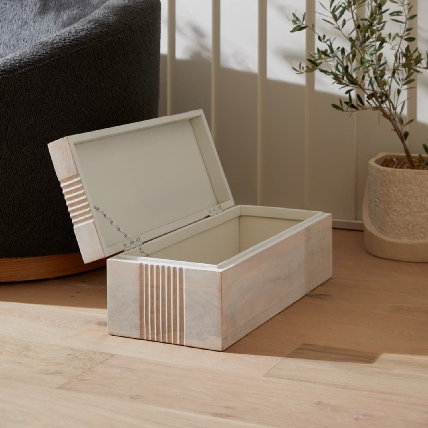 Two large whitewashed mango wood boxes provide a refined storage option. Detailed carved patterns gently flow around the sides, highlighting this understated yet stylish piece. Features a hinged lid with a chain closure. Each finish is unique.