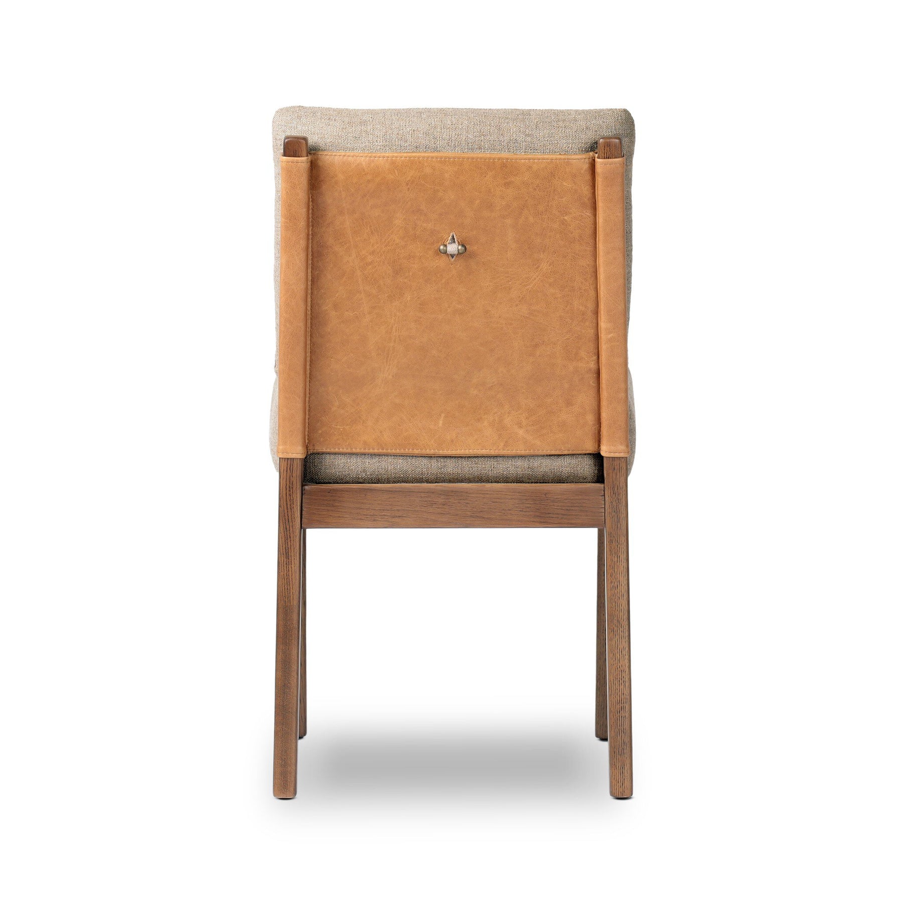 Elevate your dining space with a mixed-material dining chair of solid oak, top-grain leather and high-performance fabric. On the back, small iron detailing completes the look.