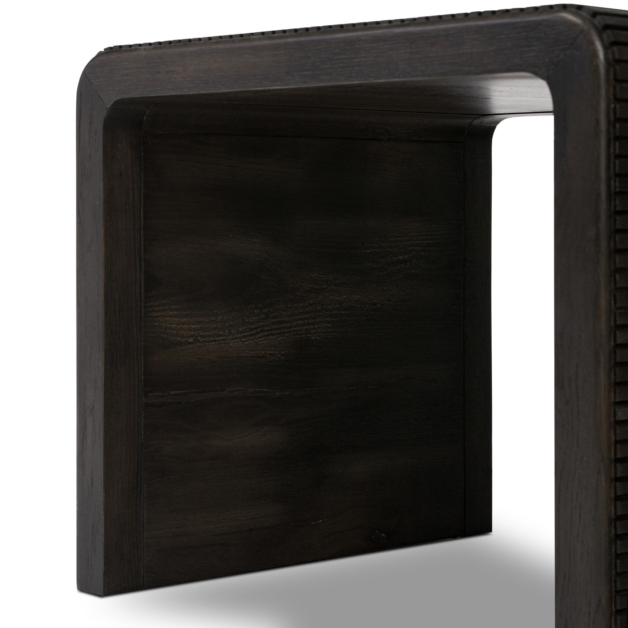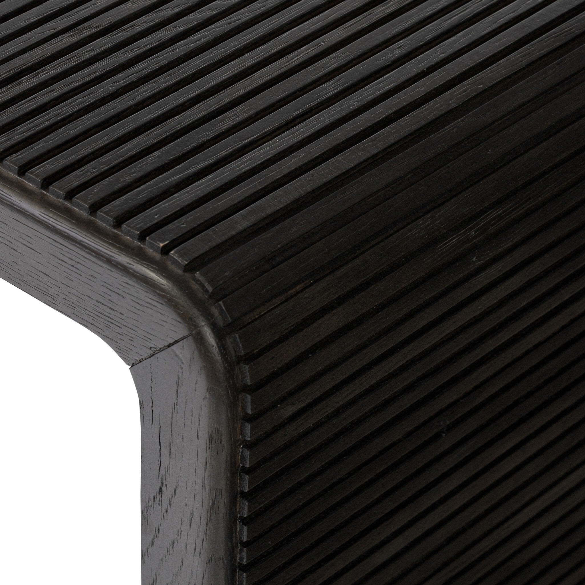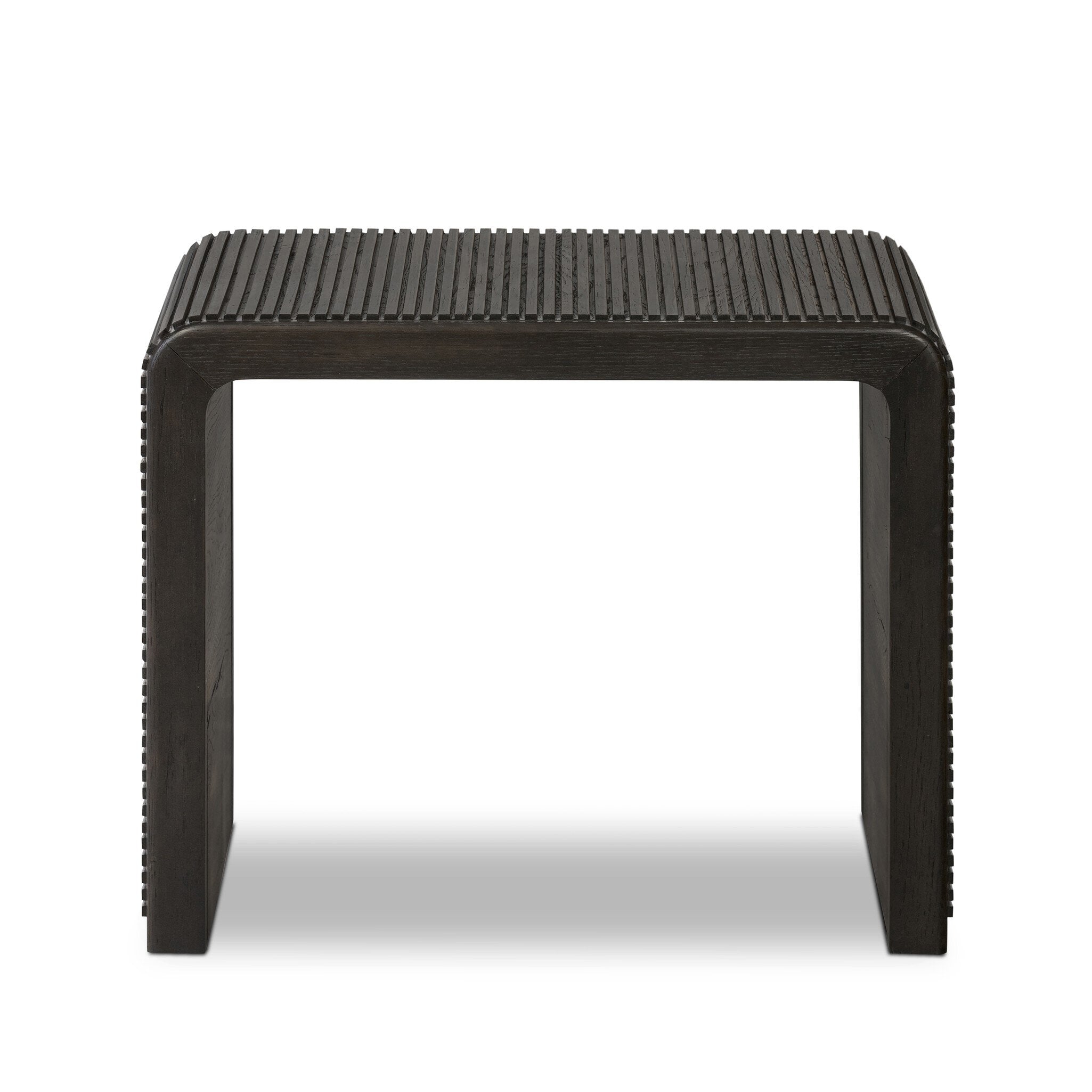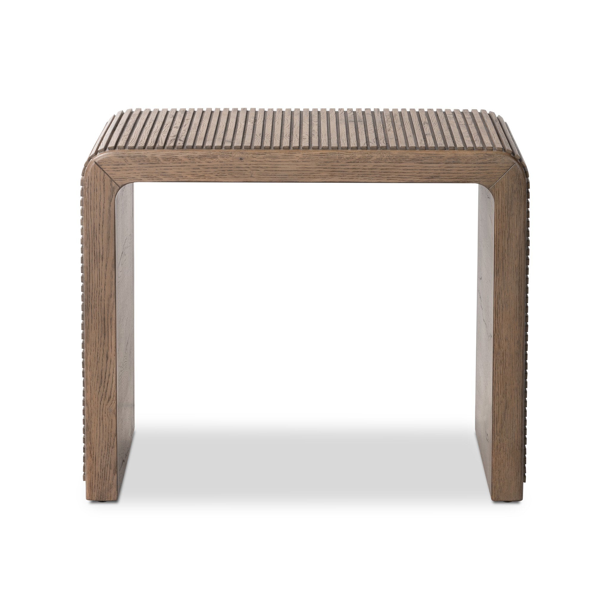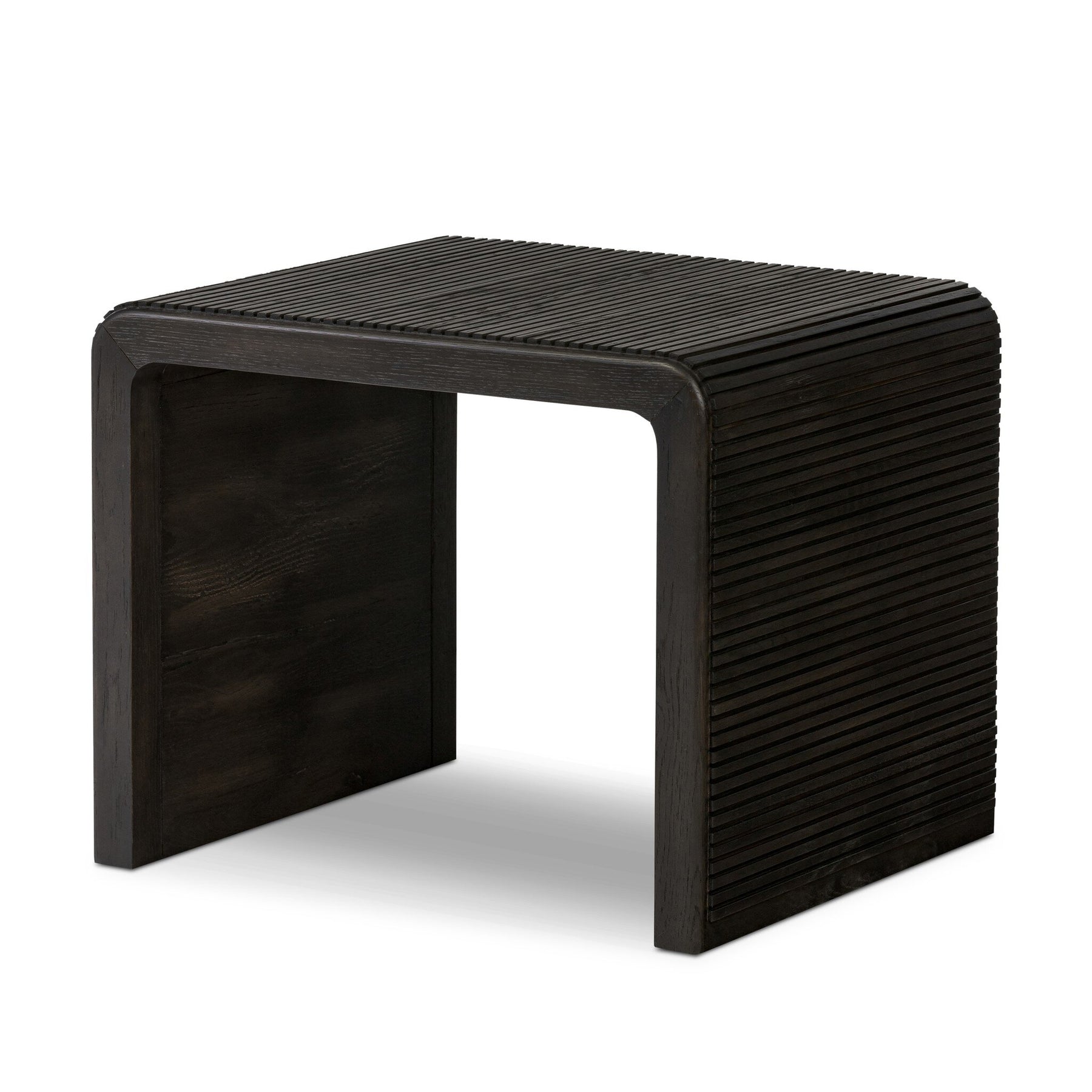 Made from rustic-finished oak or smoked black oak, linear reeding and a curved shape define this midcentury-spirited end table.