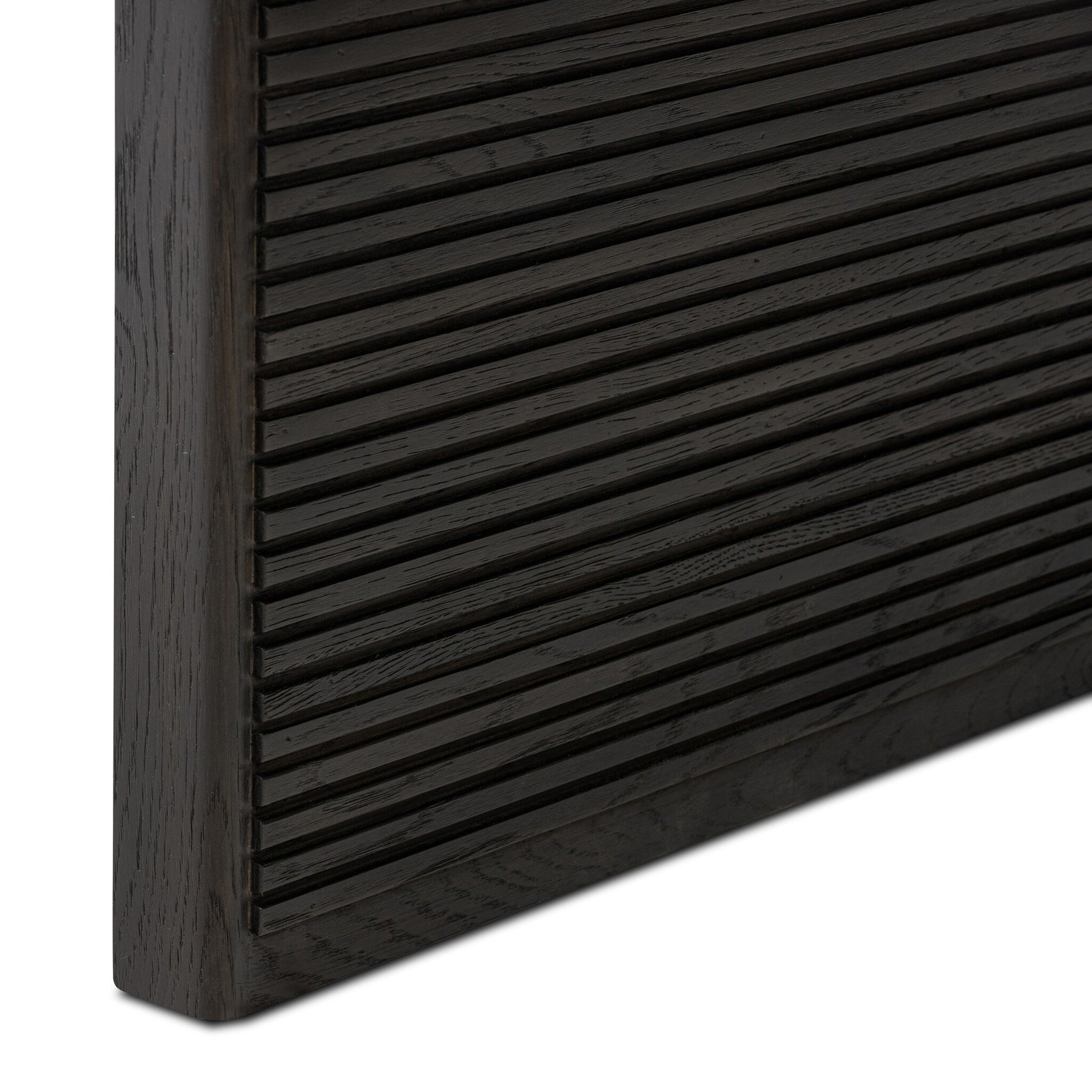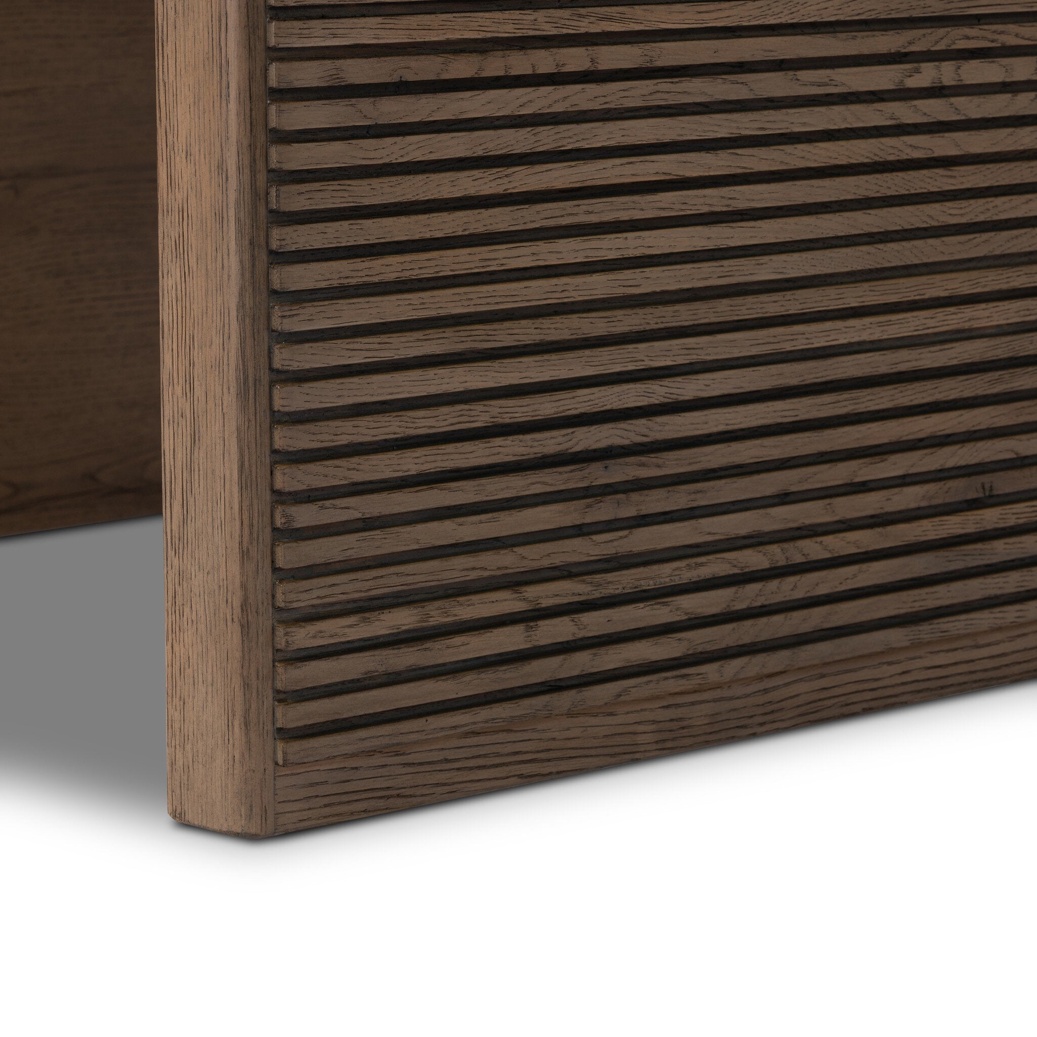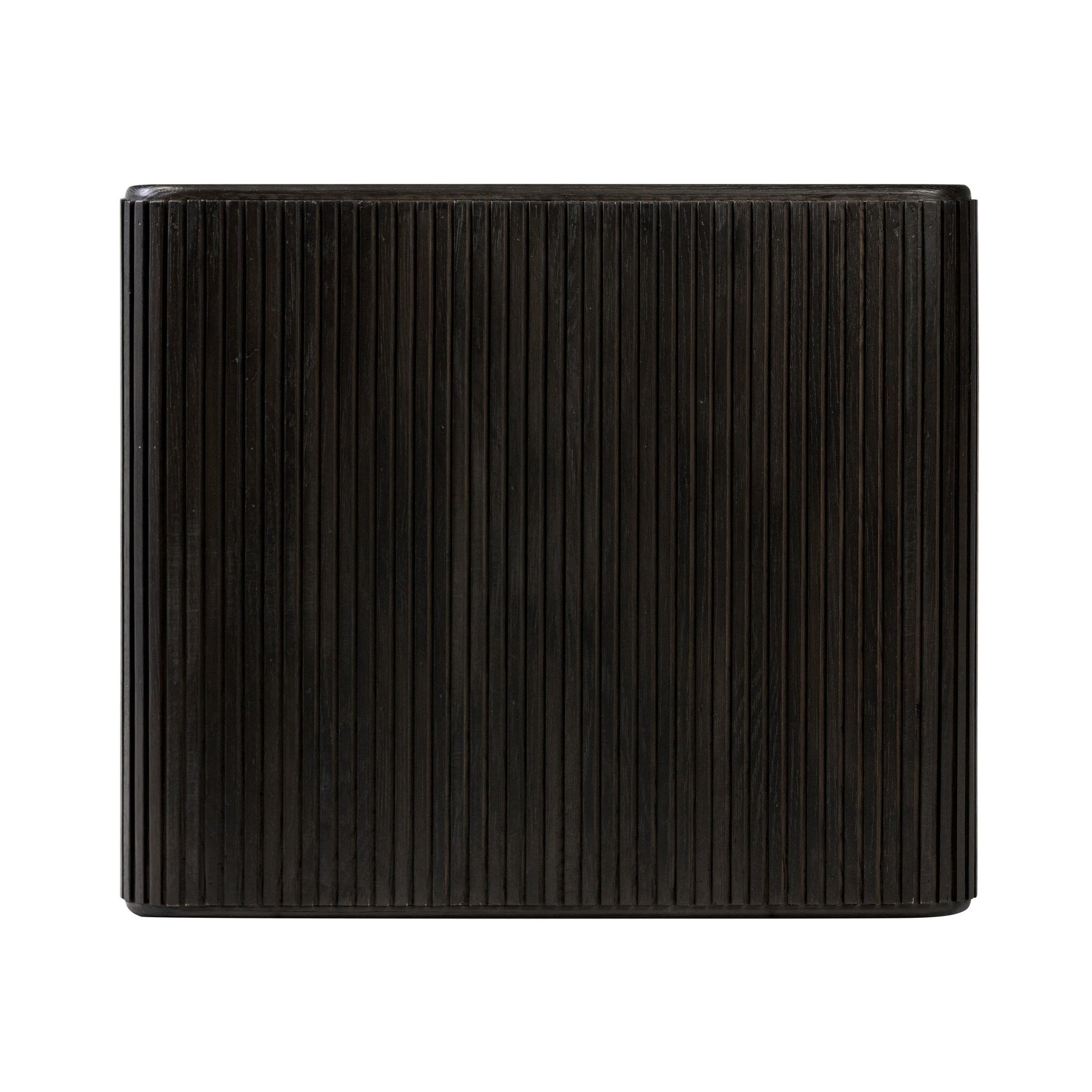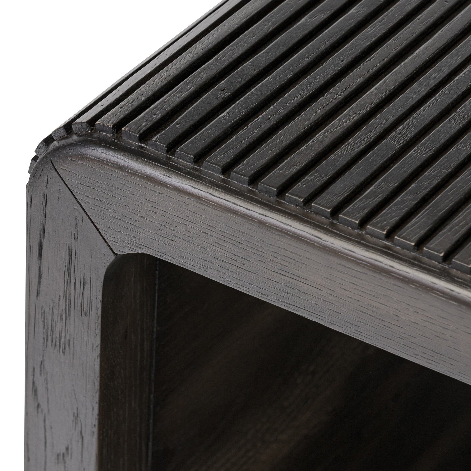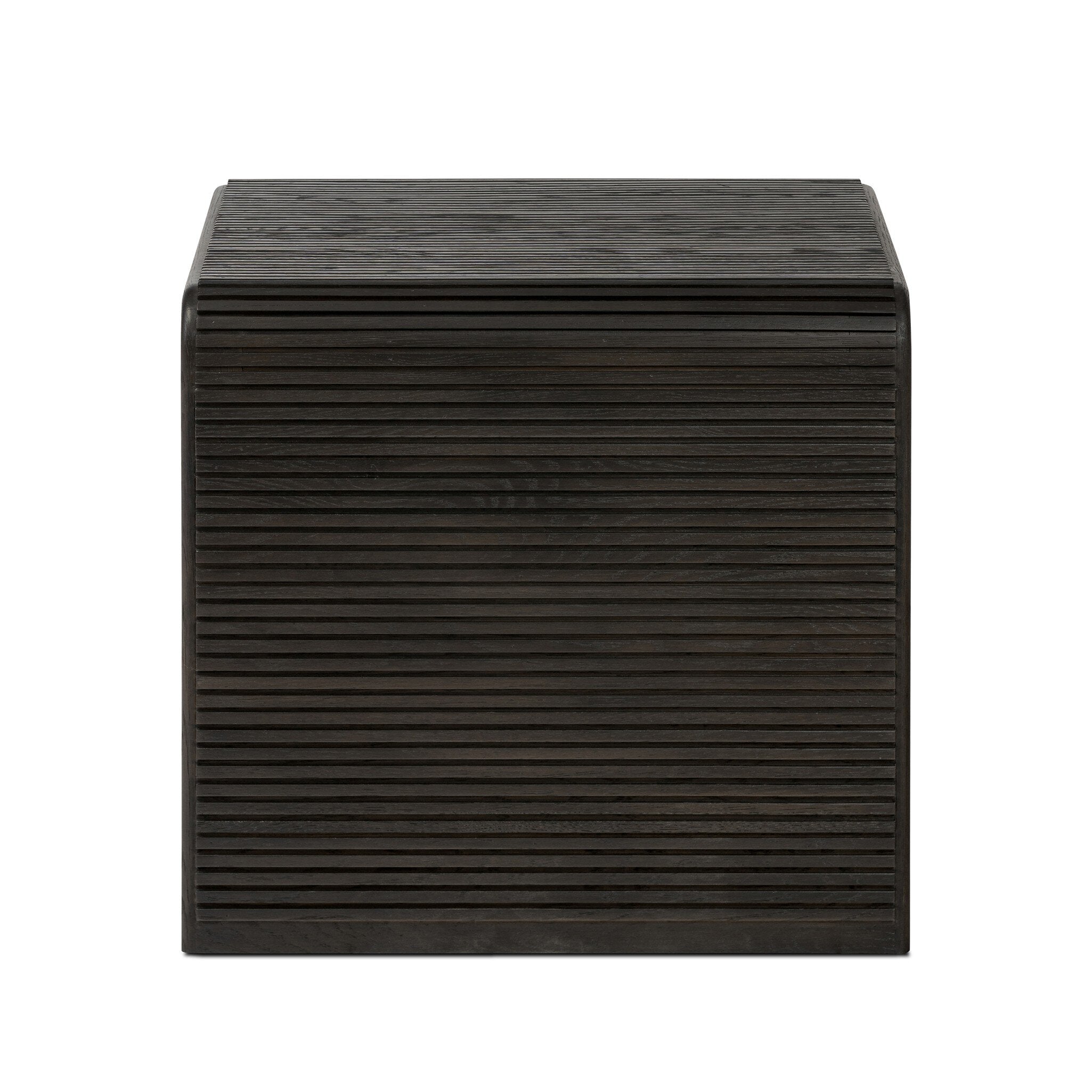 Made from rustic-finished oak or smoked black oak, linear reeding and a curved shape define this midcentury-spirited end table.