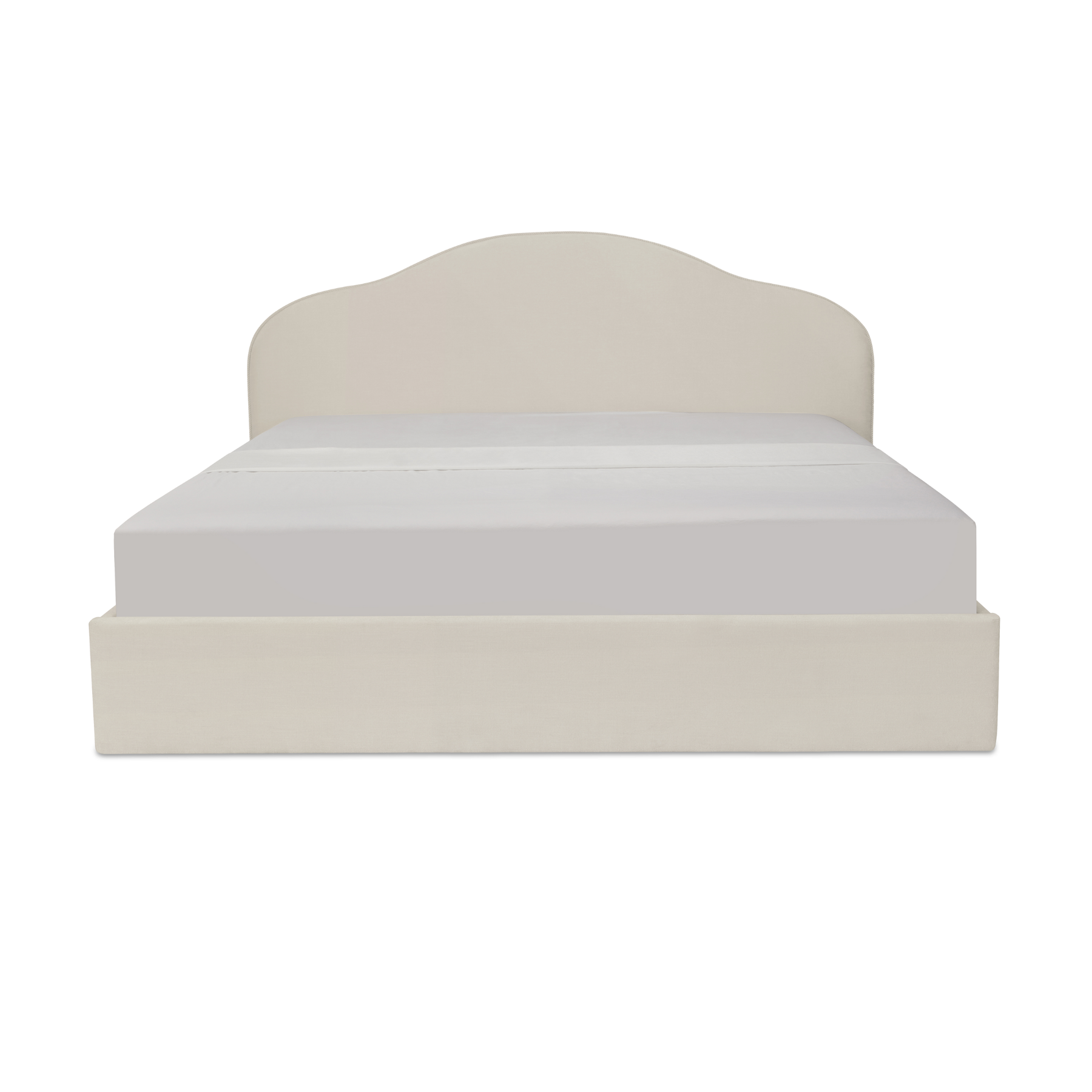 A softer take on tradition. The Maren Bed reimagines a classic arched headboard with a tapered silhouette and tonal twisted trim for subtle detail. Upholstered in cream or taupe polyester, the rounded footboard echoes the headboard’s softness for a cohesive look. Beneath the mattress, a hydraulic lift reveals hidden storage, showing how timeless curves can deliver everyday practicality.