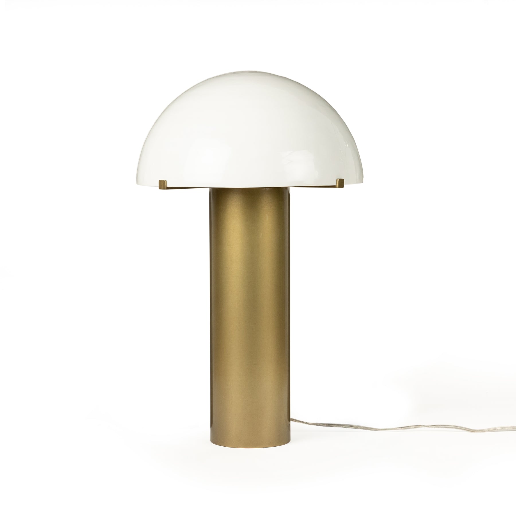 A clean silhouette of mango wood is complemented by the suspended shade of this table lamp.