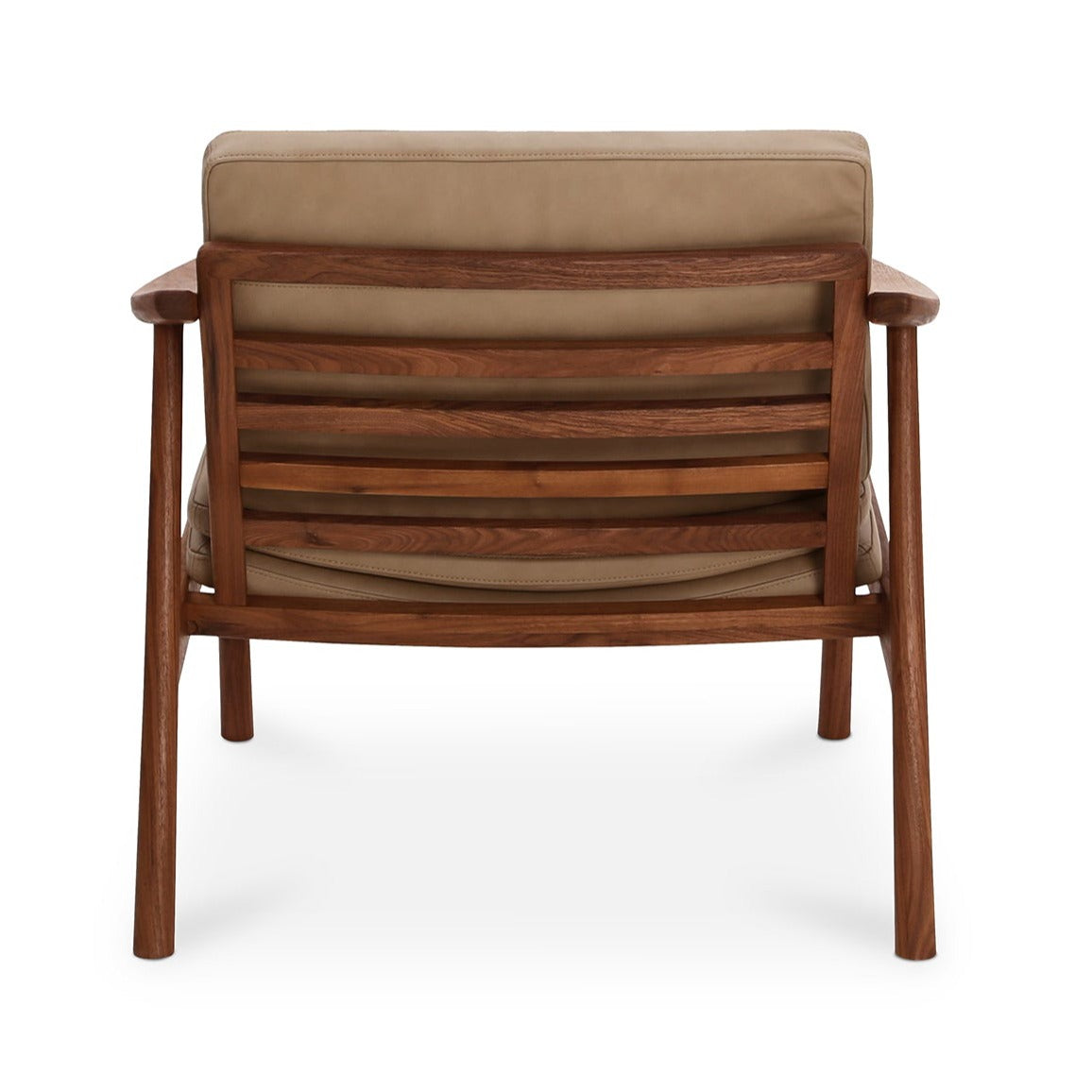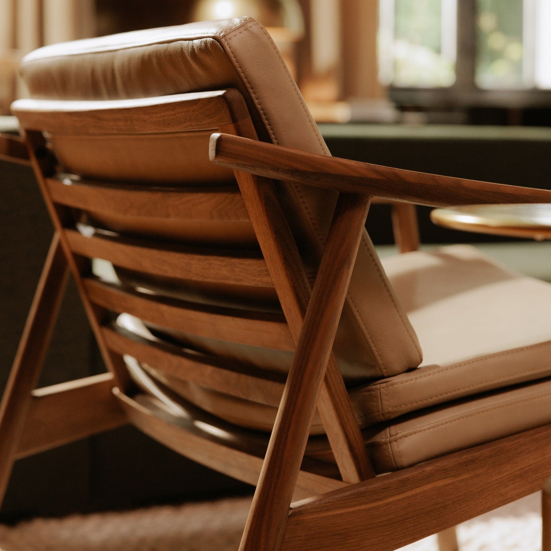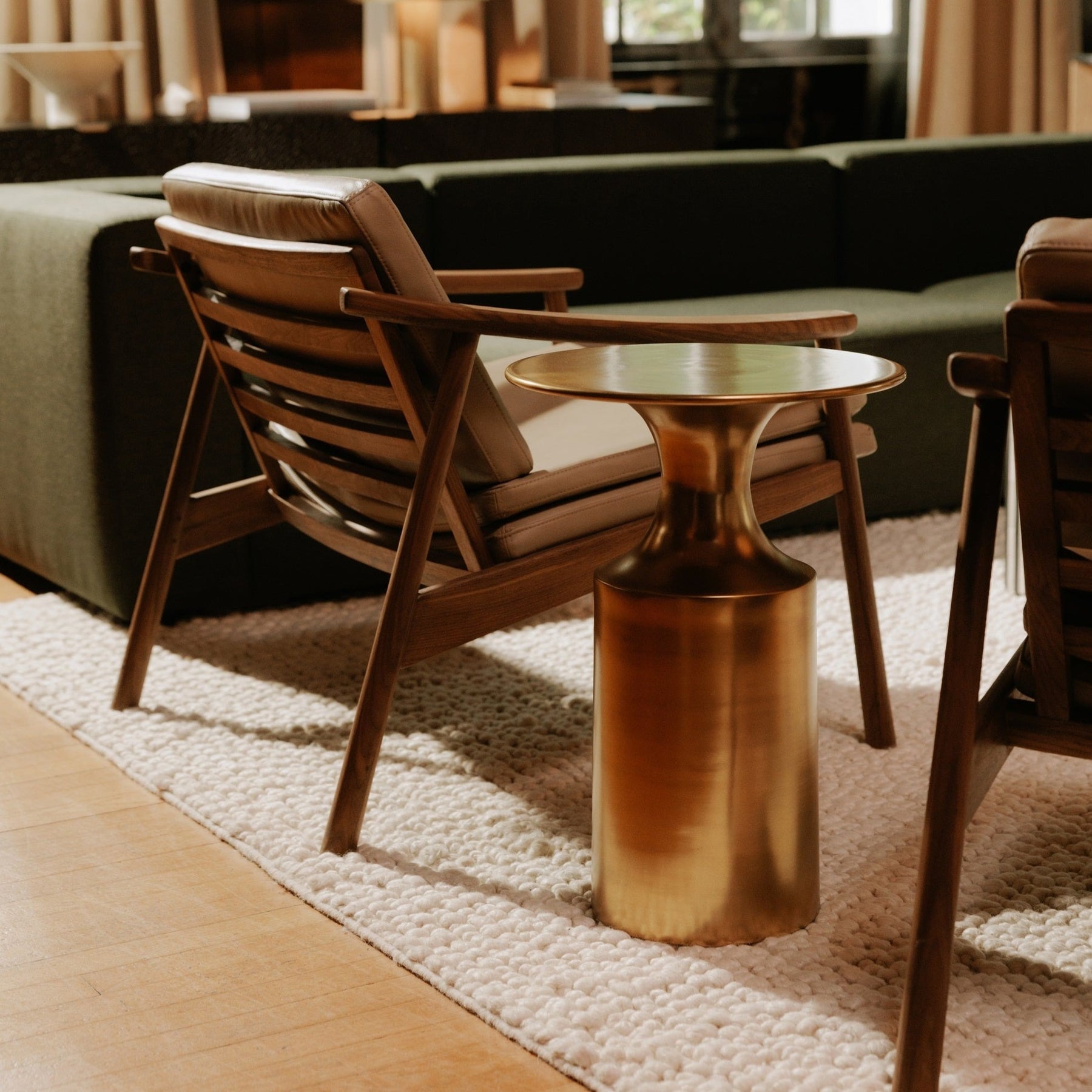 This versatile accent chair is upholstered in a cognac top-grain leather or faux Mongolian shearling with a textural high pile. A contrasting, chunky parawood frame hugs the seat and is wire-brushed for a warm, vintage feel.